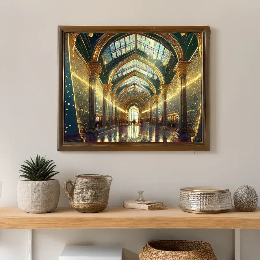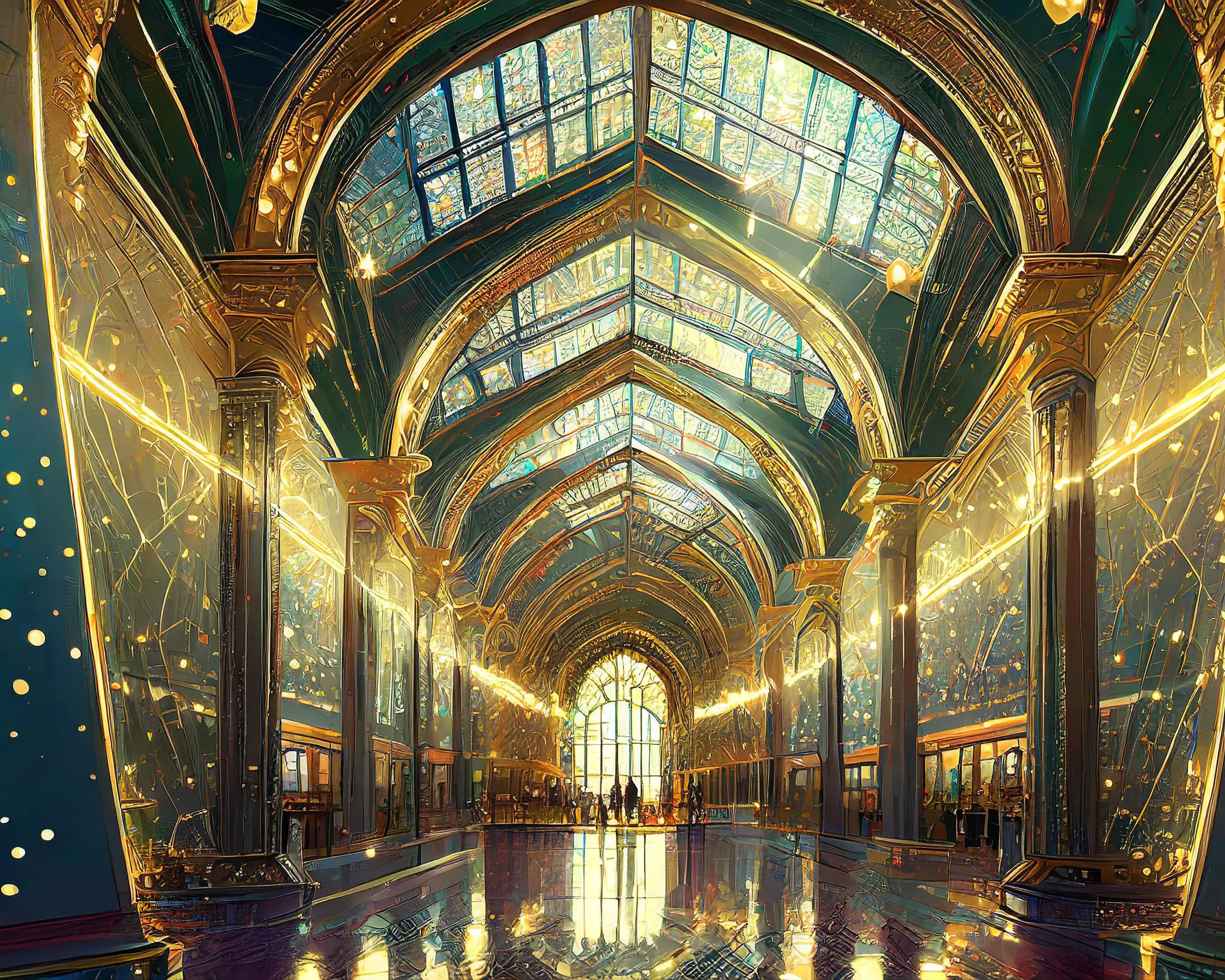 Ethereal shafts of golden light pierce through soaring glass panels, transforming this otherworldly train station into a cathedral of transit where even the dust motes dance like wayward stars. The masterful fusion of Art Nouveau flourishes with Gothic architectural grandeur creates a space where Hogwarts meets Industrial Revolution elegance, all wrapped in a warm amber glow. Look, if you're not planning to miss at least three trains just to stand here gawking at this celestial ceiling like a slack-jawed tourist, are you even living?