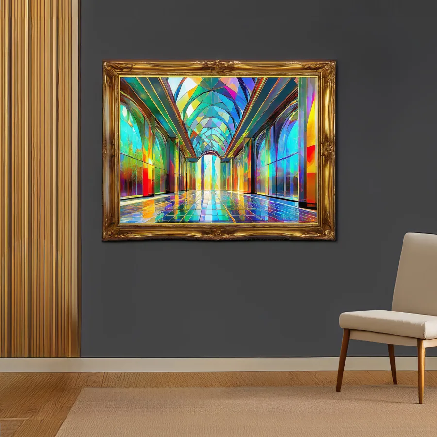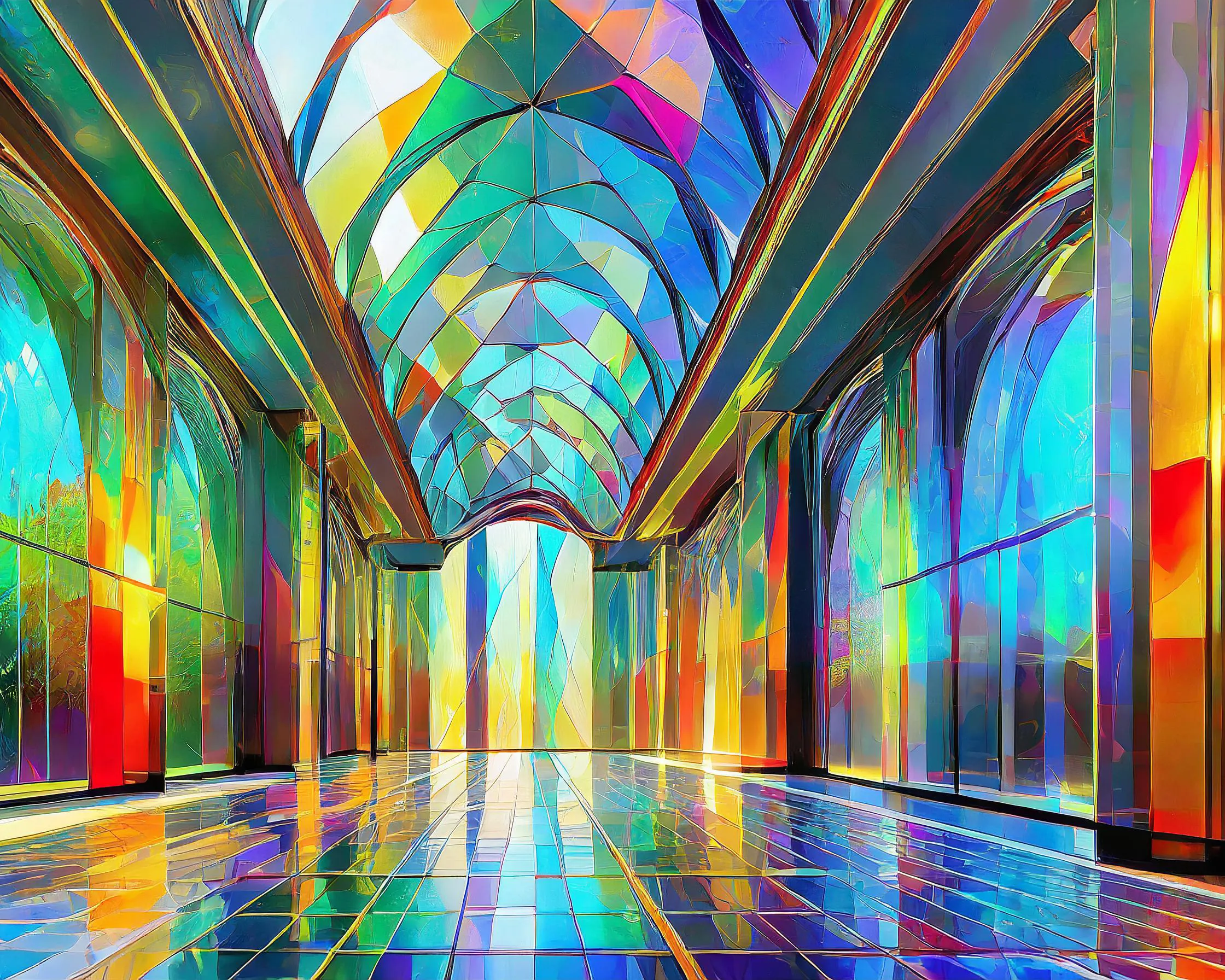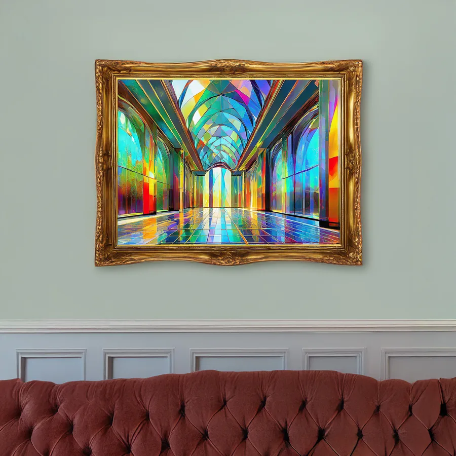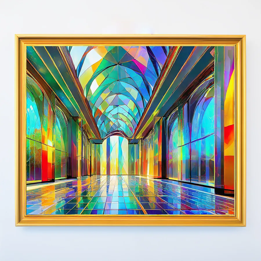 A mesmerizing corridor stretches into infinity, where stained glass windows fracture light into a kaleidoscopic rainbow that dances across pristine marble floors. The digital-meets-divine aesthetic creates a perfect fusion of medieval cathedral architecture and modern vaporwave sensibilities, like someone accidentally installed RGB lighting in Notre Dame. Listen, if you're not planning to use this as your next Zoom background while pretending you're broadcasting from the astral plane, you're seriously missing out.