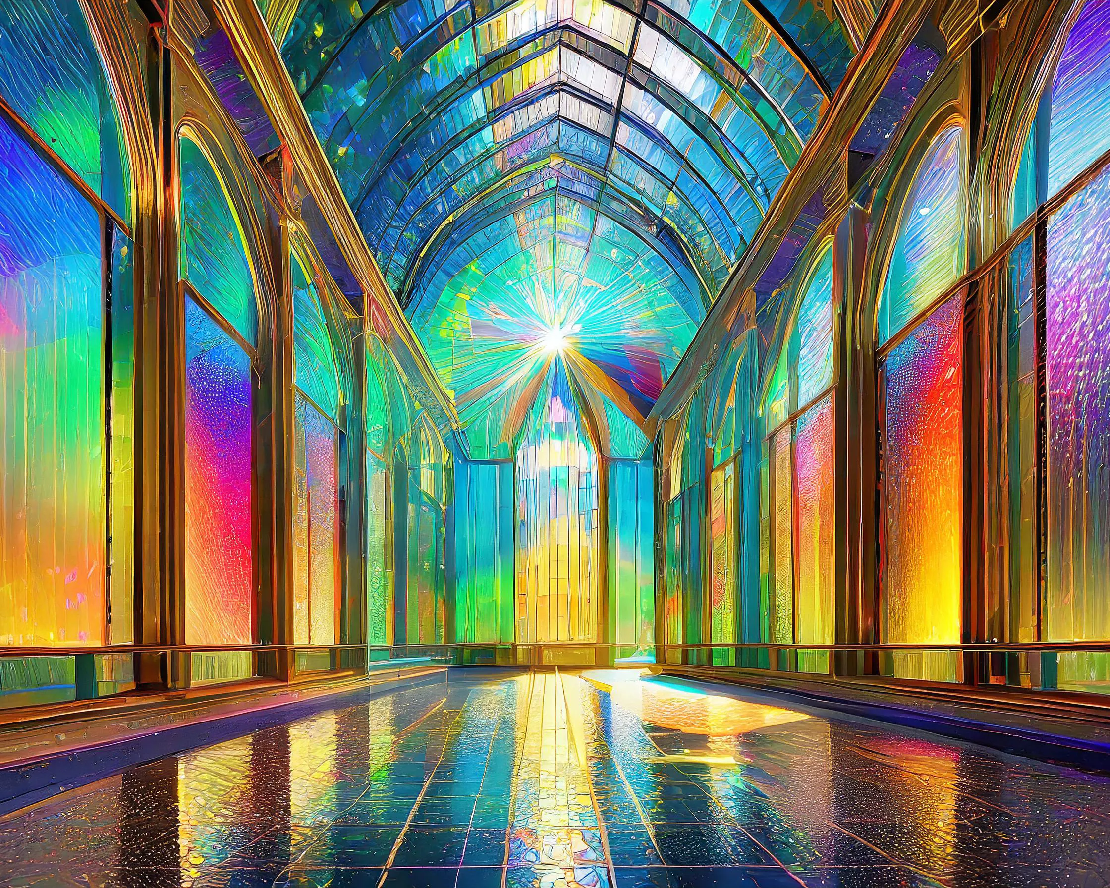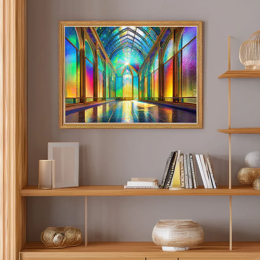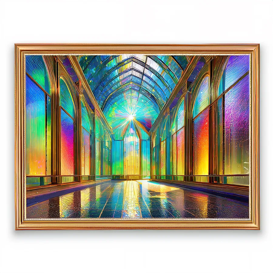 A kaleidoscopic explosion of jewel-toned light cascades through towering stained glass windows, creating an almost hallucinatory dance of color across the stone cathedral floor. The photograph captures that perfect moment when ancient Gothic architecture collides with pure prismatic chaos, like someone spilled a cosmic bag of Skittles in a medieval church. If you're trying to create a meditation space that screams "I'm spiritual but also really into Pink Floyd's Dark Side of the Moon," this piece is practically begging to be on your wall.
