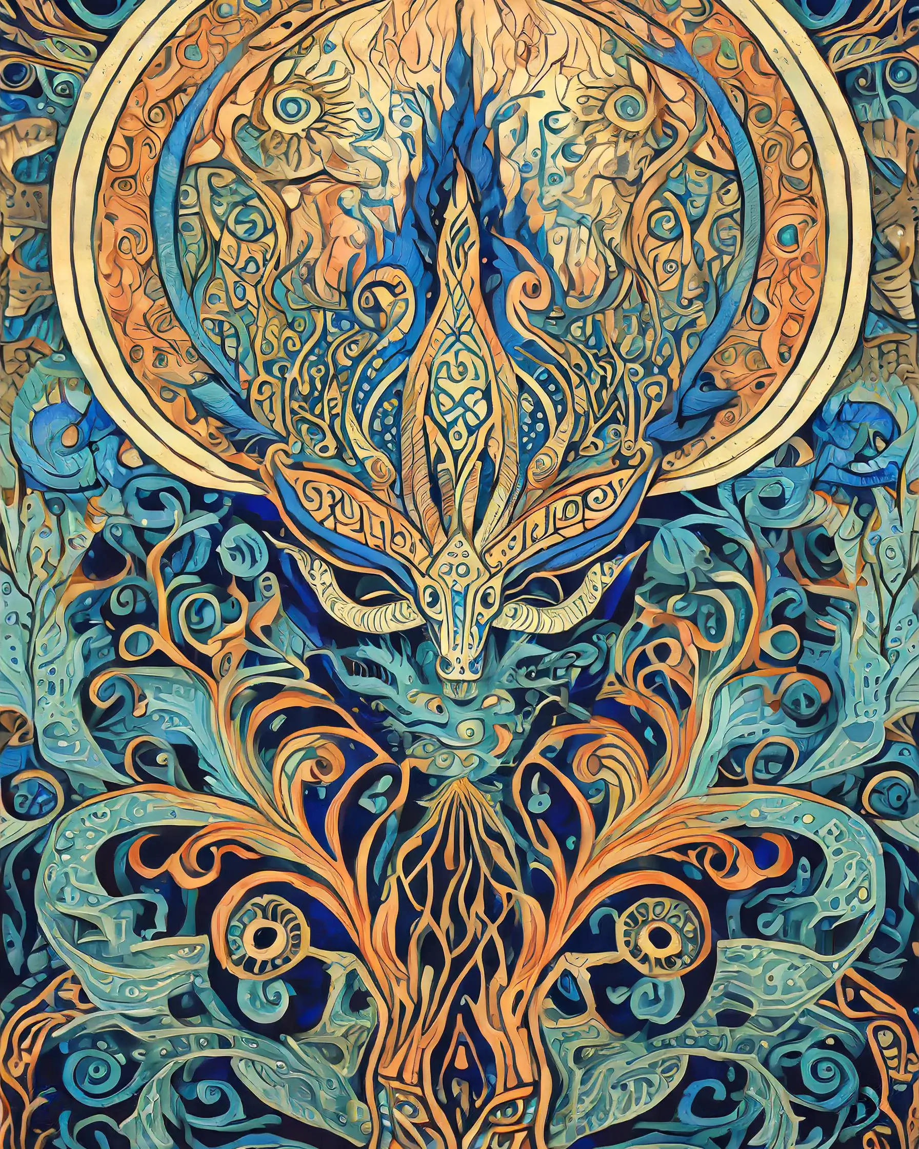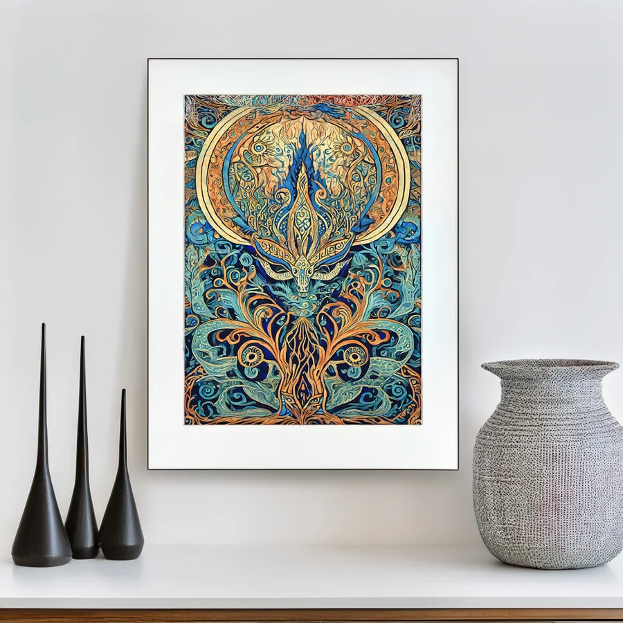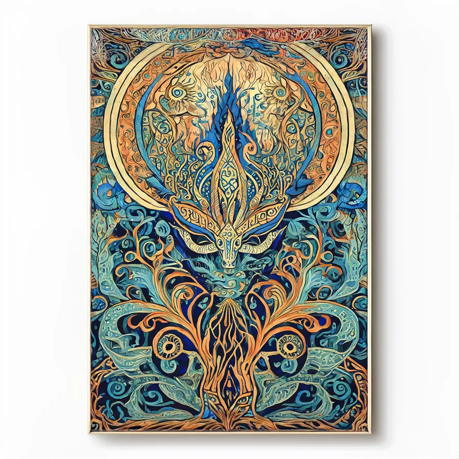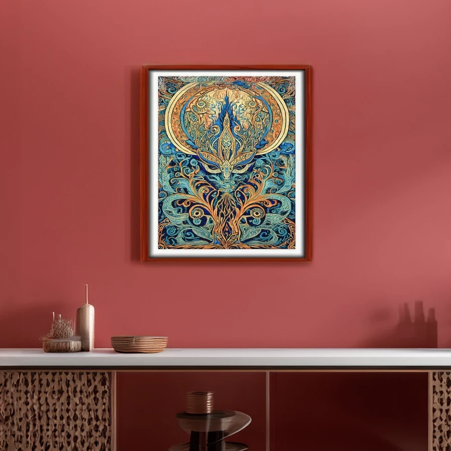 A majestic deer materializes from an explosion of impossibly detailed turquoise and gold mandala patterns, its antlers transforming into Celtic knots that spiral endlessly into the cosmos. The psychedelic fusion of Art Nouveau flourishes and sacred geometry creates a hypnotic dance between organic forest elements and mathematical precision, like Mother Nature decided to get really into fractals after a spiritual awakening. Listen, if you're trying to turn your meditation space into a portal to the realm where forest spirits hang out and trade stories about humans while sipping mushroom tea, this piece is basically screaming your name.