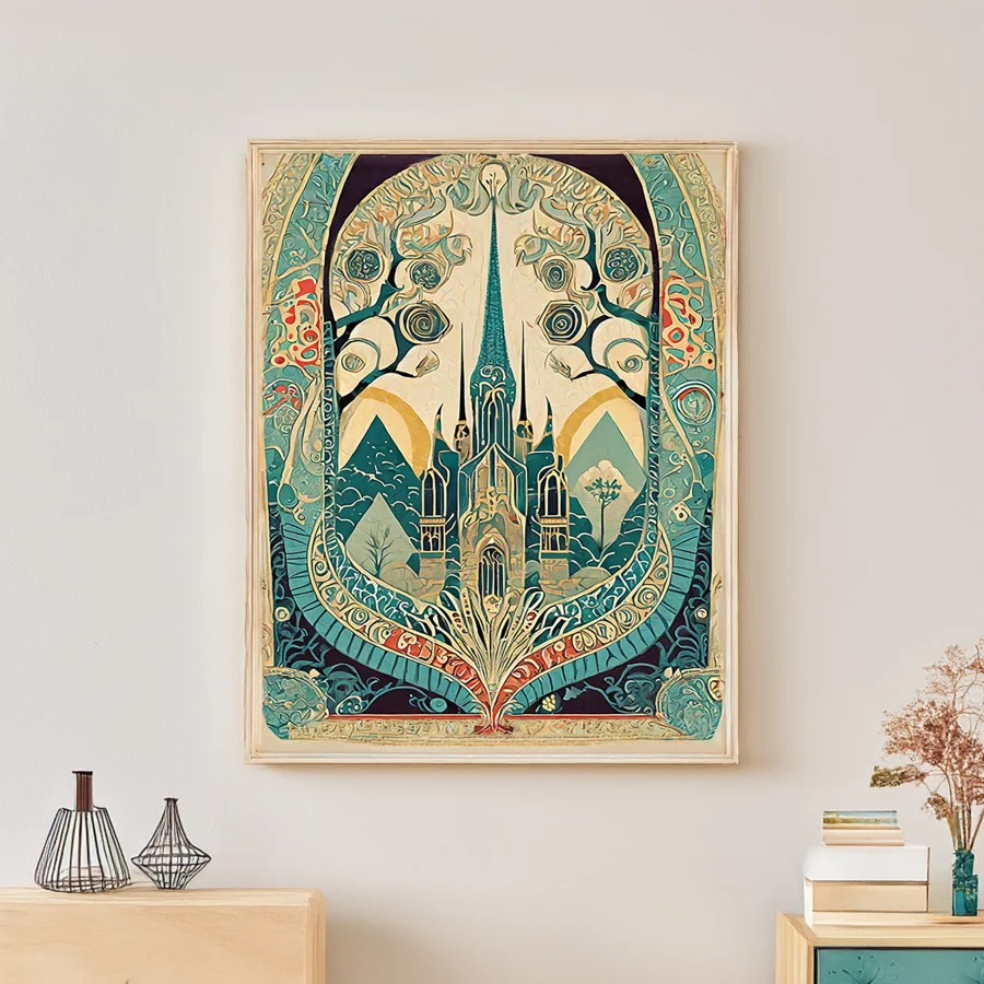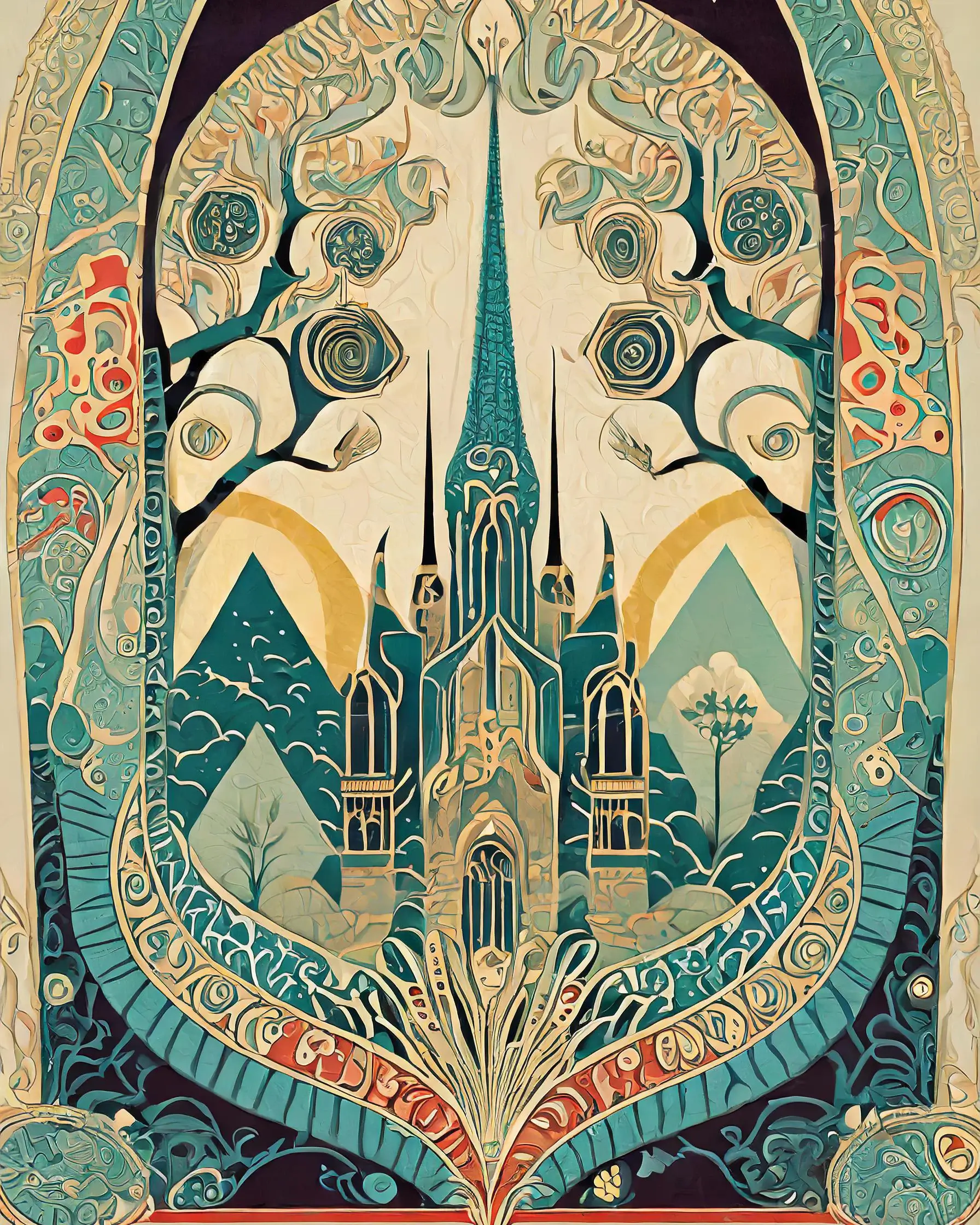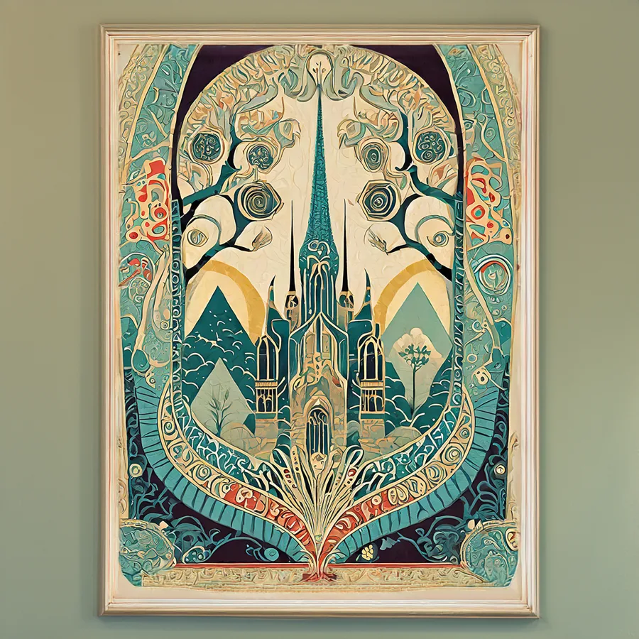 Towering spires wrapped in impossibly delicate golden vines pierce an otherworldly teal sky, their swooping curves practically hypnotizing you into a trance. The piece masterfully merges Art Nouveau's signature organic swirls with Gothic architecture's dramatic flair, creating a sanctuary that feels more Rivendell than Vatican City. Listen, if you're not already planning to redecorate your entire living space around this ethereal fever dream of a cathedral, are you even living your best witchy life?