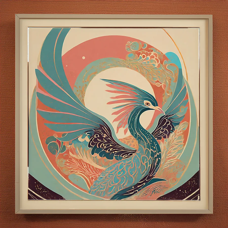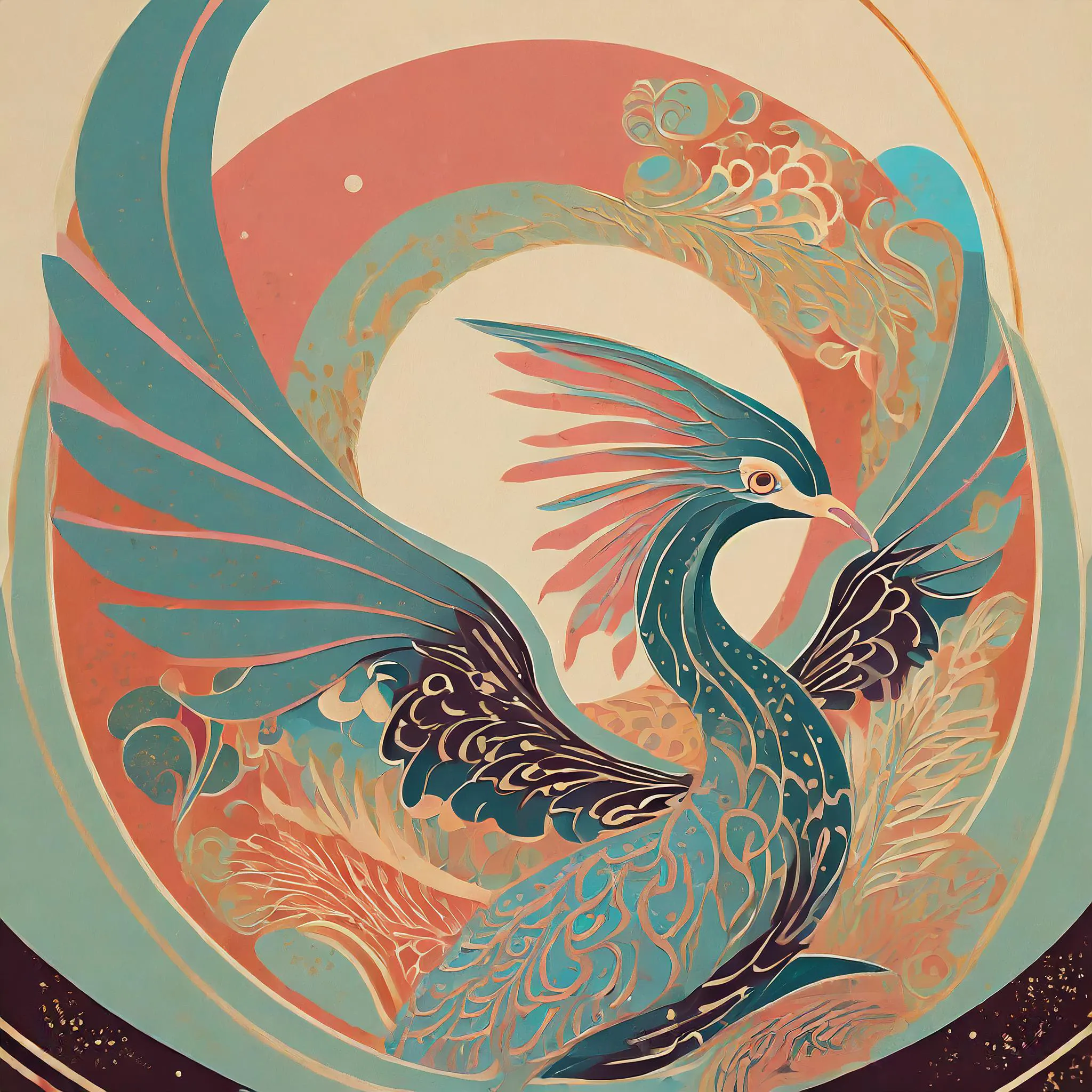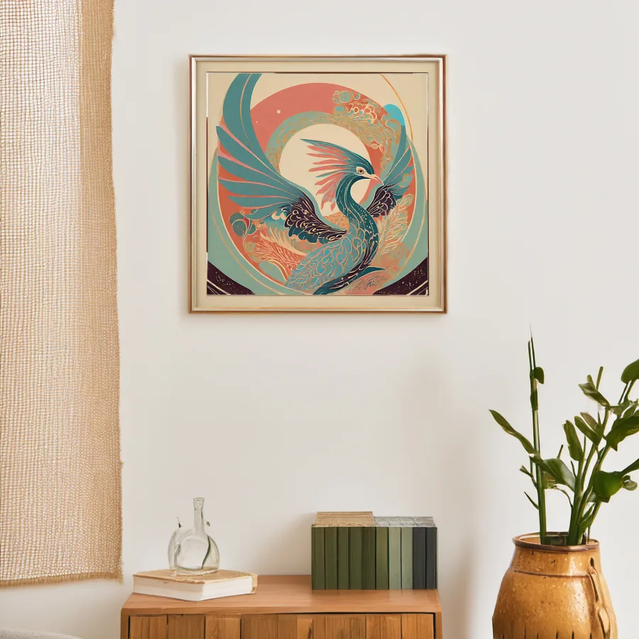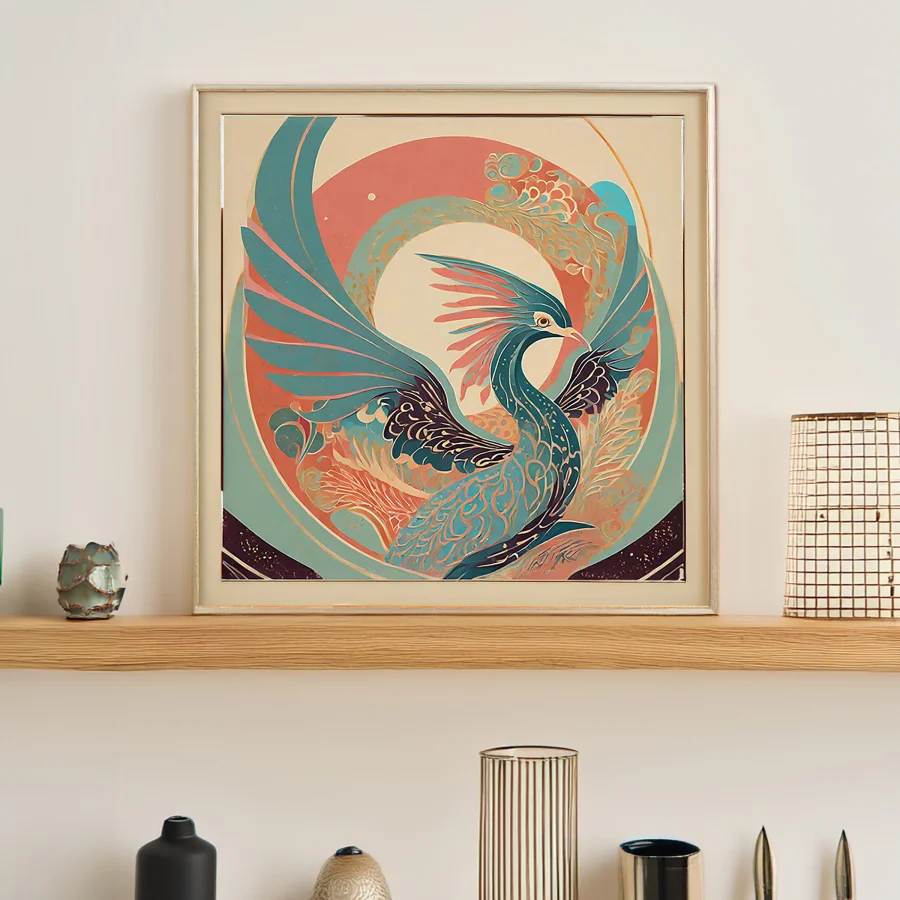 A regal peacock unfurls its magnificent tail in a mesmerizing swirl of teal and coral, each feather an intricate Art Nouveau fever dream that practically vibrates off the canvas. The fusion of Japanese-inspired linework with Art Deco geometry creates an ethereal dance between Eastern spirituality and Western decorative excess, all wrapped in a dreamy turquoise and salmon color palette. Perfect for that corner of your meditation room where you pretend to achieve enlightenment but actually just scroll through Instagram while sitting cross-legged on an overpriced cushion.