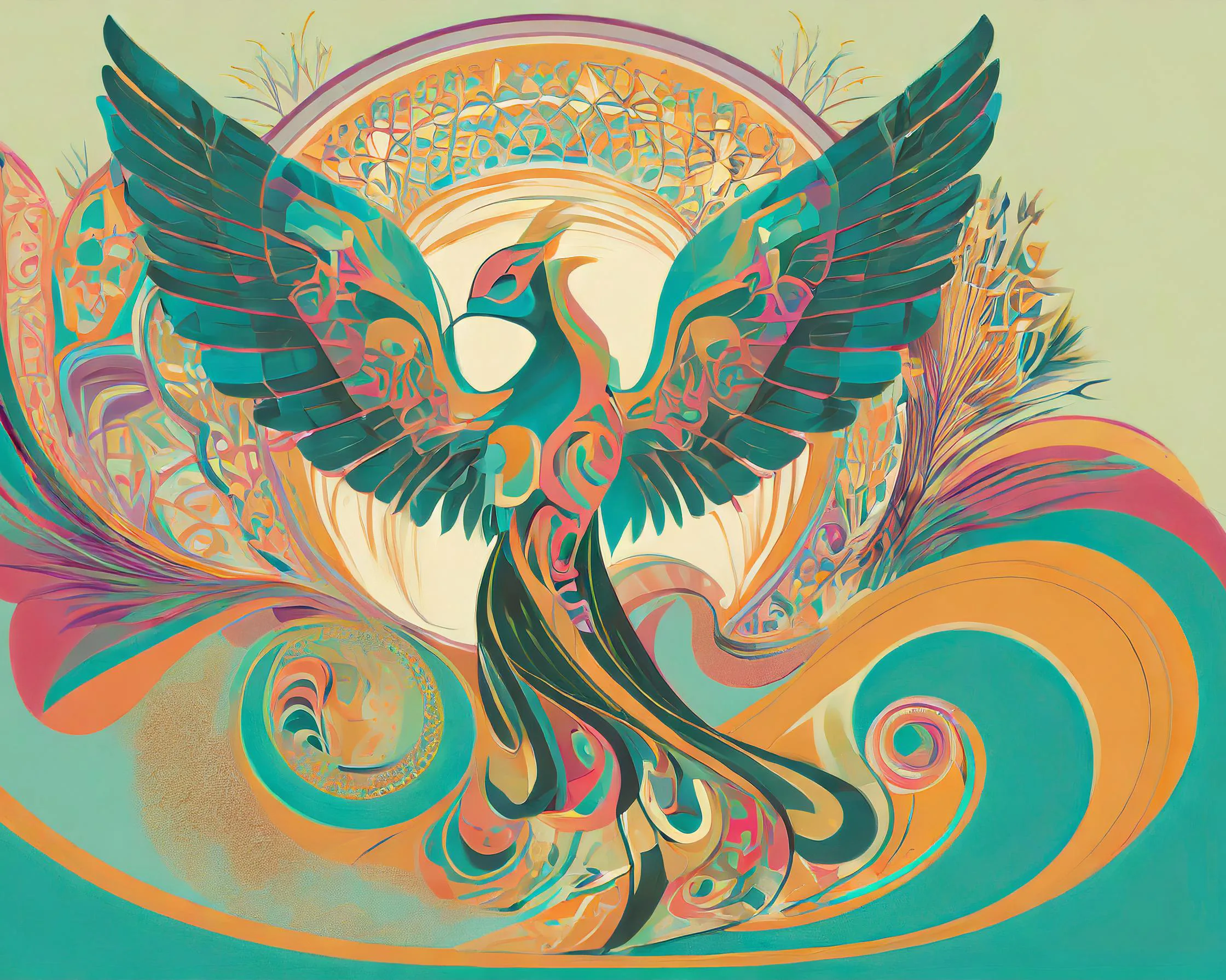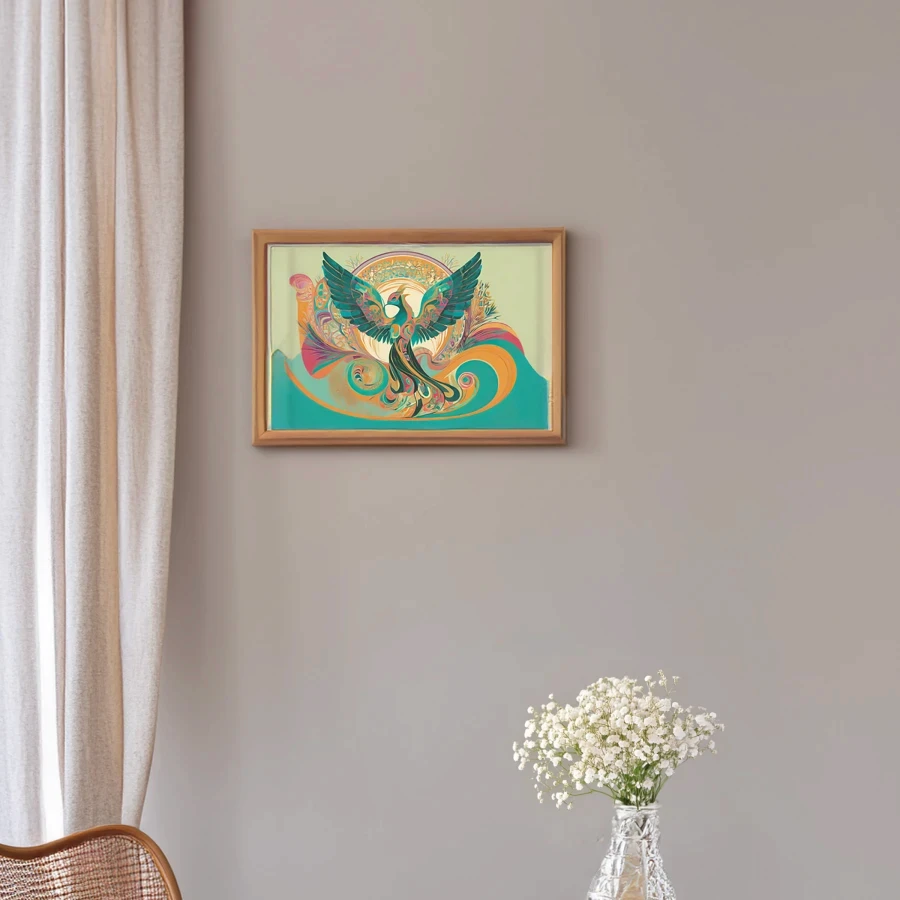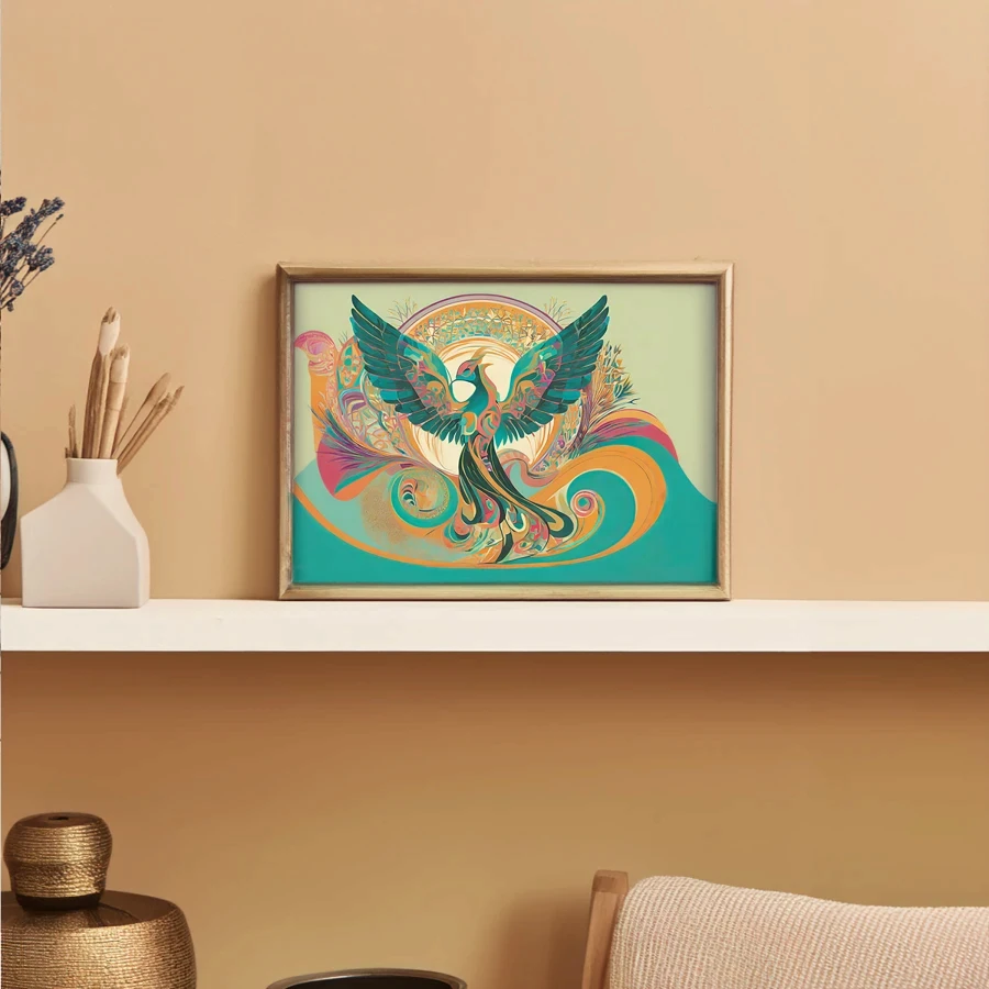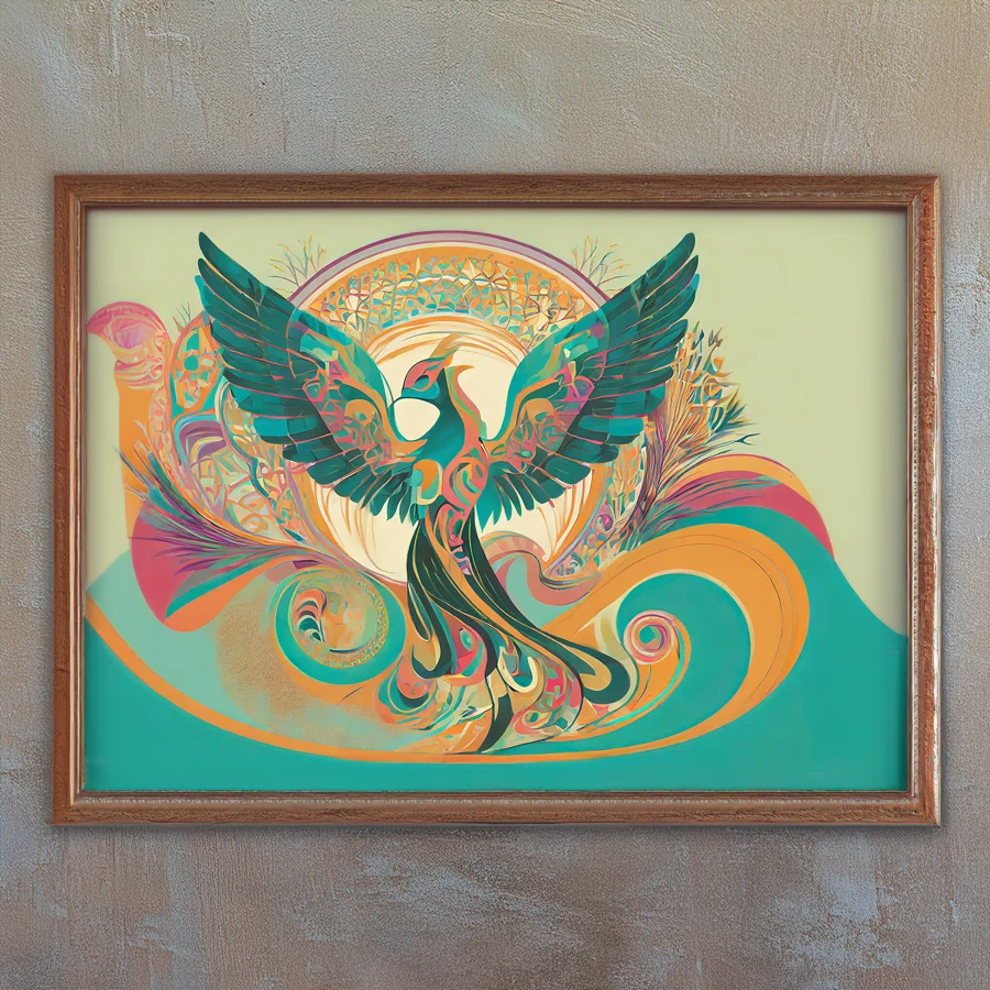 The majestic phoenix erupts from the canvas in a mesmerizing dance of turquoise and coral swirls, its ethereal feathers dissolving into sacred geometric patterns that seem to pulse with mystical energy. Art nouveau sensibilities collide with modern boho aesthetics, creating a perfectly balanced piece that wouldn't look out of place in either a Victorian parlor or your cousin's crystal-filled meditation room. Listen, if you're not already plotting to either get this tattooed somewhere scandalous or hang it in your yoga studio to make everyone else's basic mandala prints look tragically mundane, we probably can't be friends.