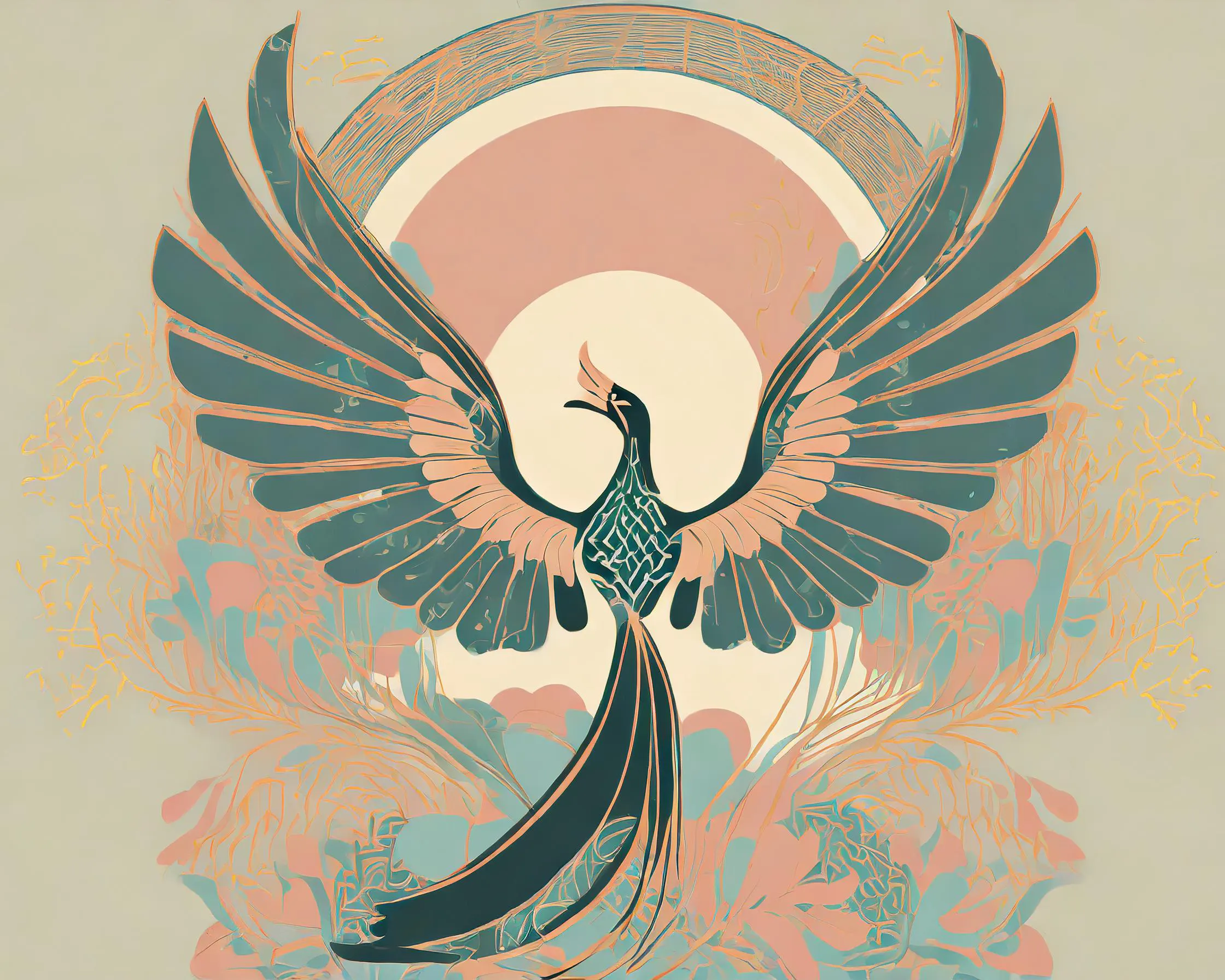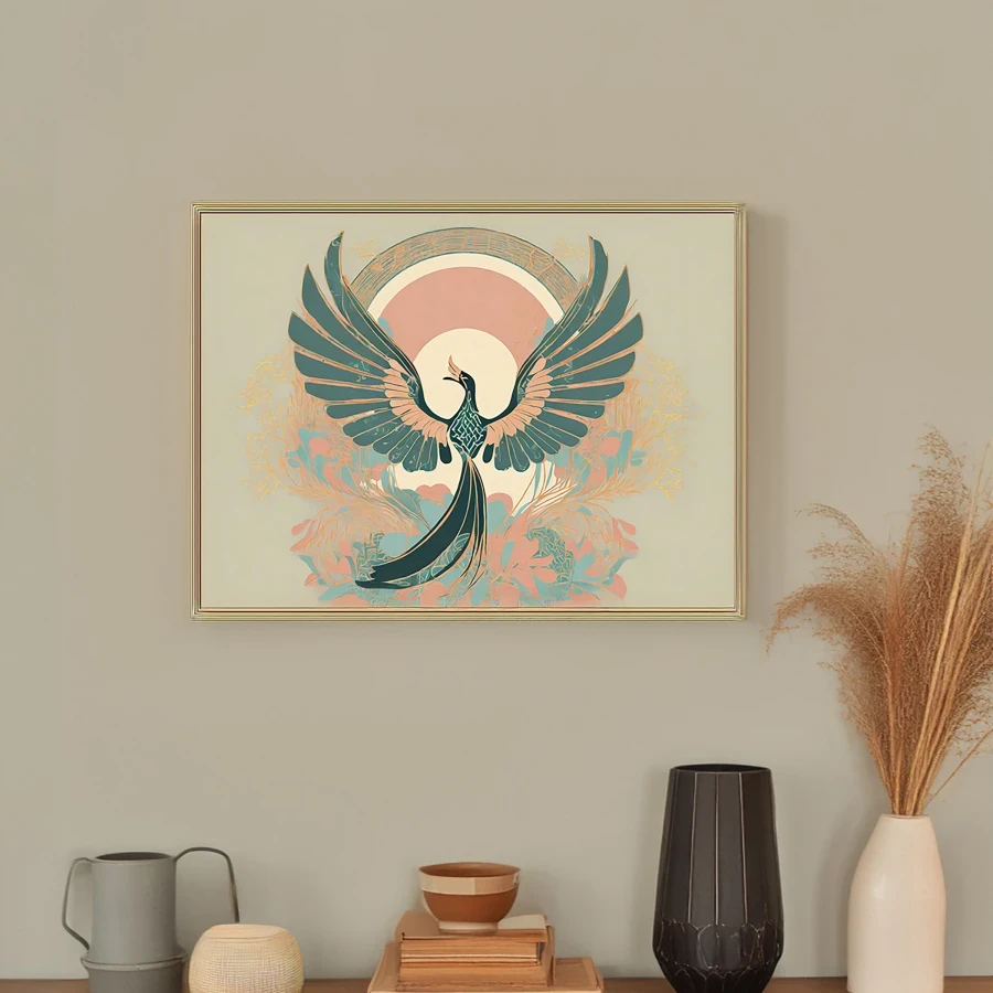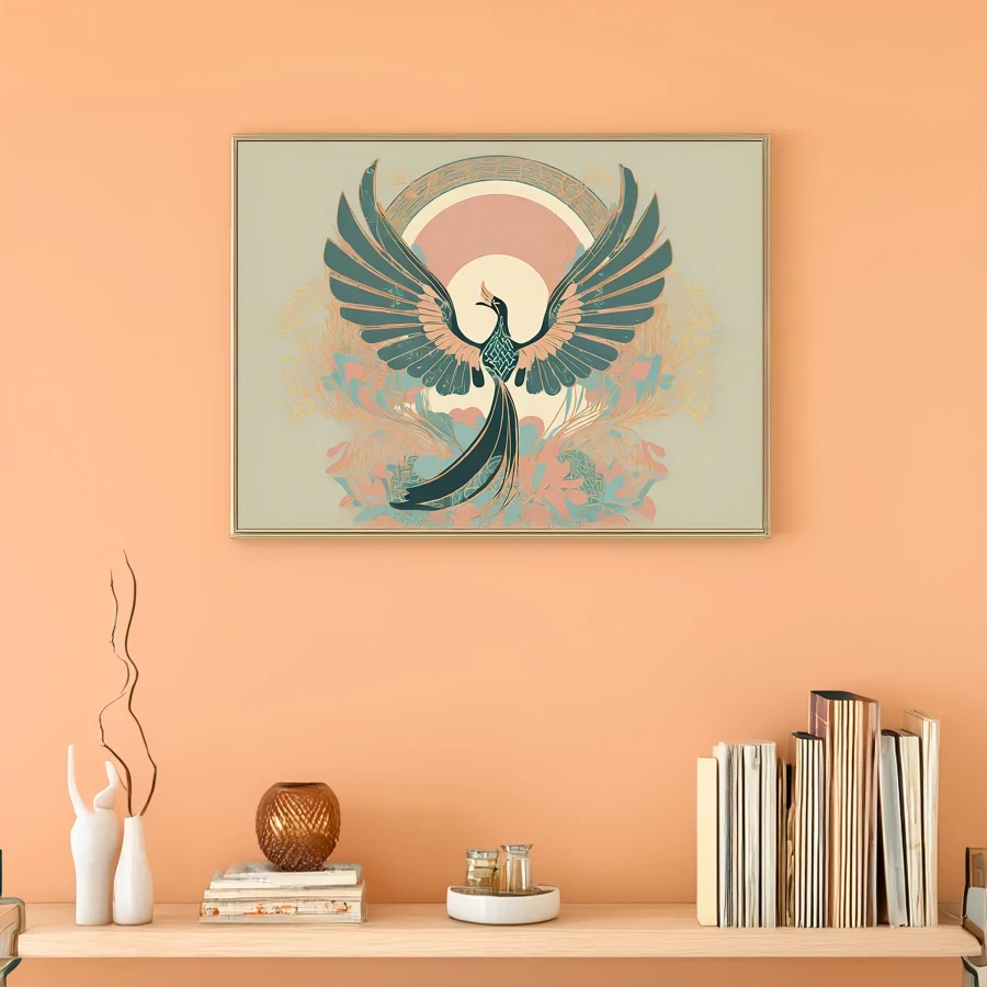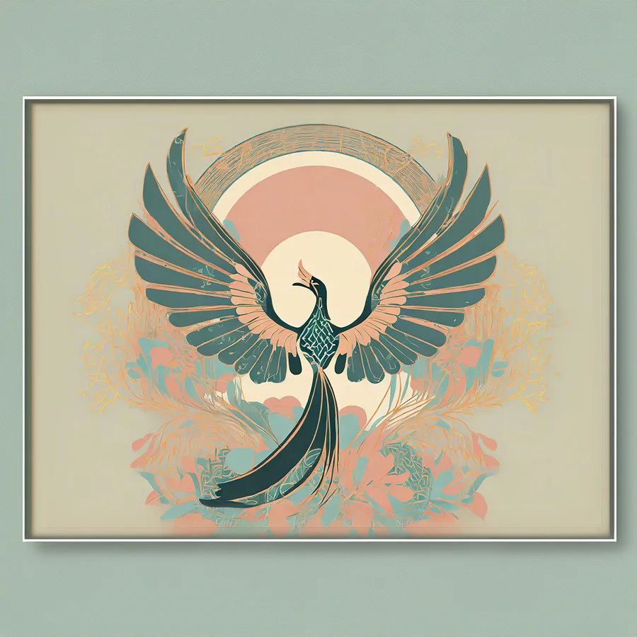 A mystical phoenix bursts forth in a mesmerizing dance of teal and coral flames, its Art Deco-inspired plumage creating perfect geometric symmetry against a celestial backdrop. The design masterfully blends the ornate flourishes of Art Nouveau with sleek digital precision, while sacred geometry patterns ripple through each feather like a cosmic blueprint. Listen, if you're not already imagining this as either your next tattoo or the centerpiece of your meditation room where you pretend to have your life together, I don't even know what to tell you.