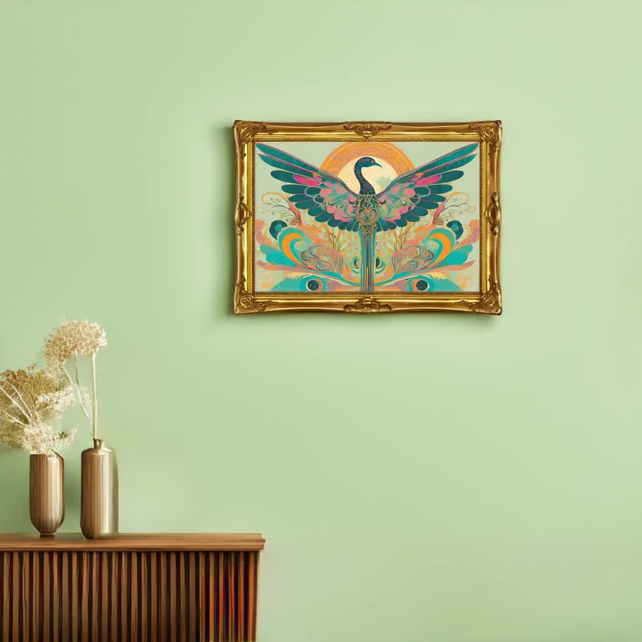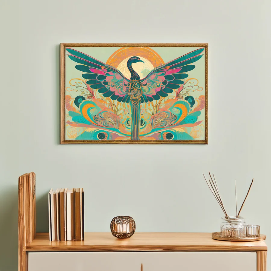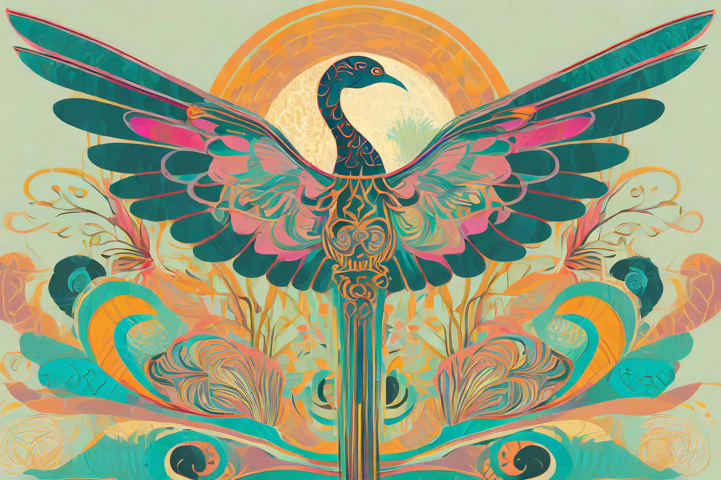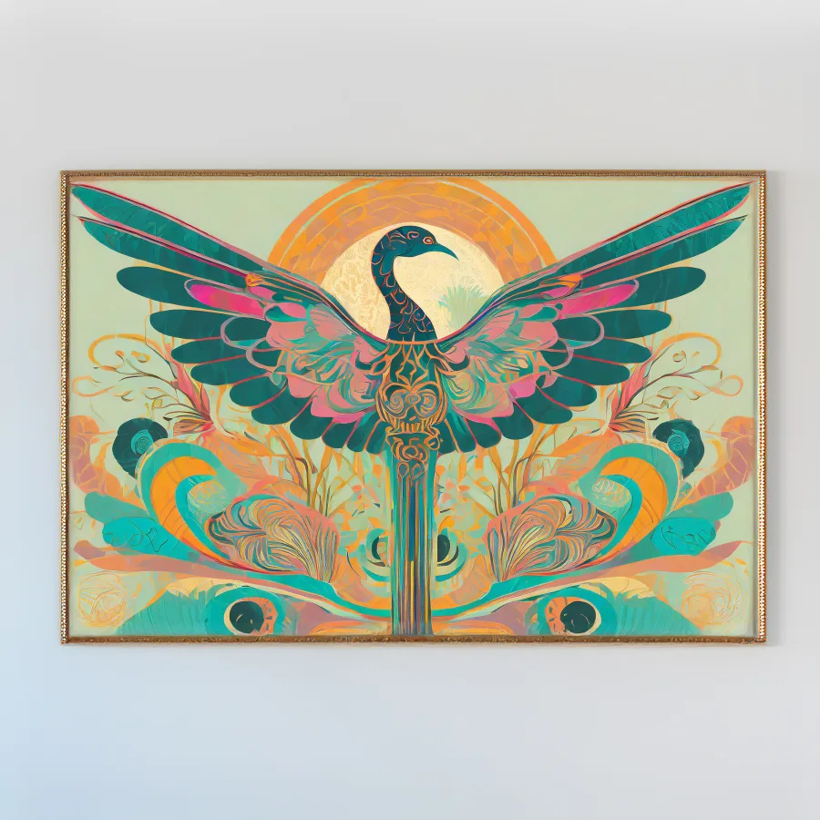 A cosmic phoenix bursts forth in hypnotic swirls of teal and coral, its sacred geometry patterns rippling outward like sound waves made visible in the cosmos. The design masterfully fuses Art Nouveau's flowing lines with indigenous motifs, creating a mesmerizing dance between ancient tribal wisdom and modern psychedelic aesthetics. Listen, I know you're already planning to get this tattooed somewhere visible enough to show off at yoga class, and honestly, I don't blame you - this bird absolutely slaps.