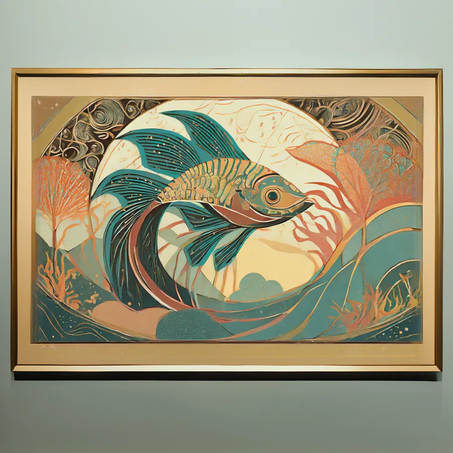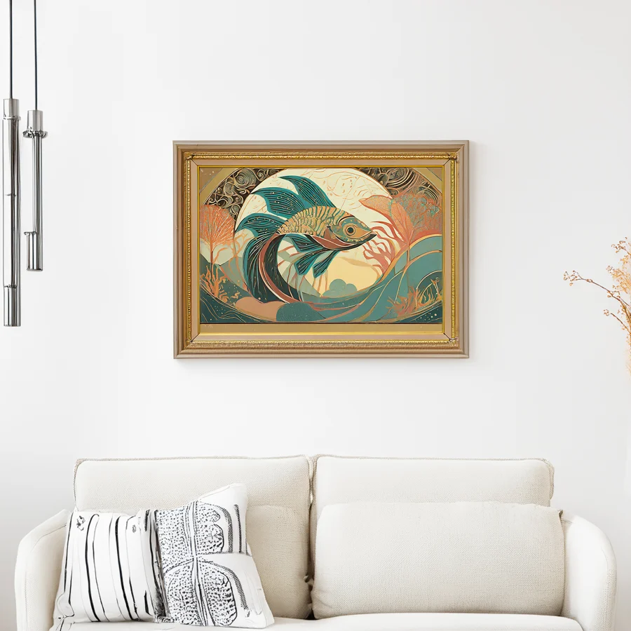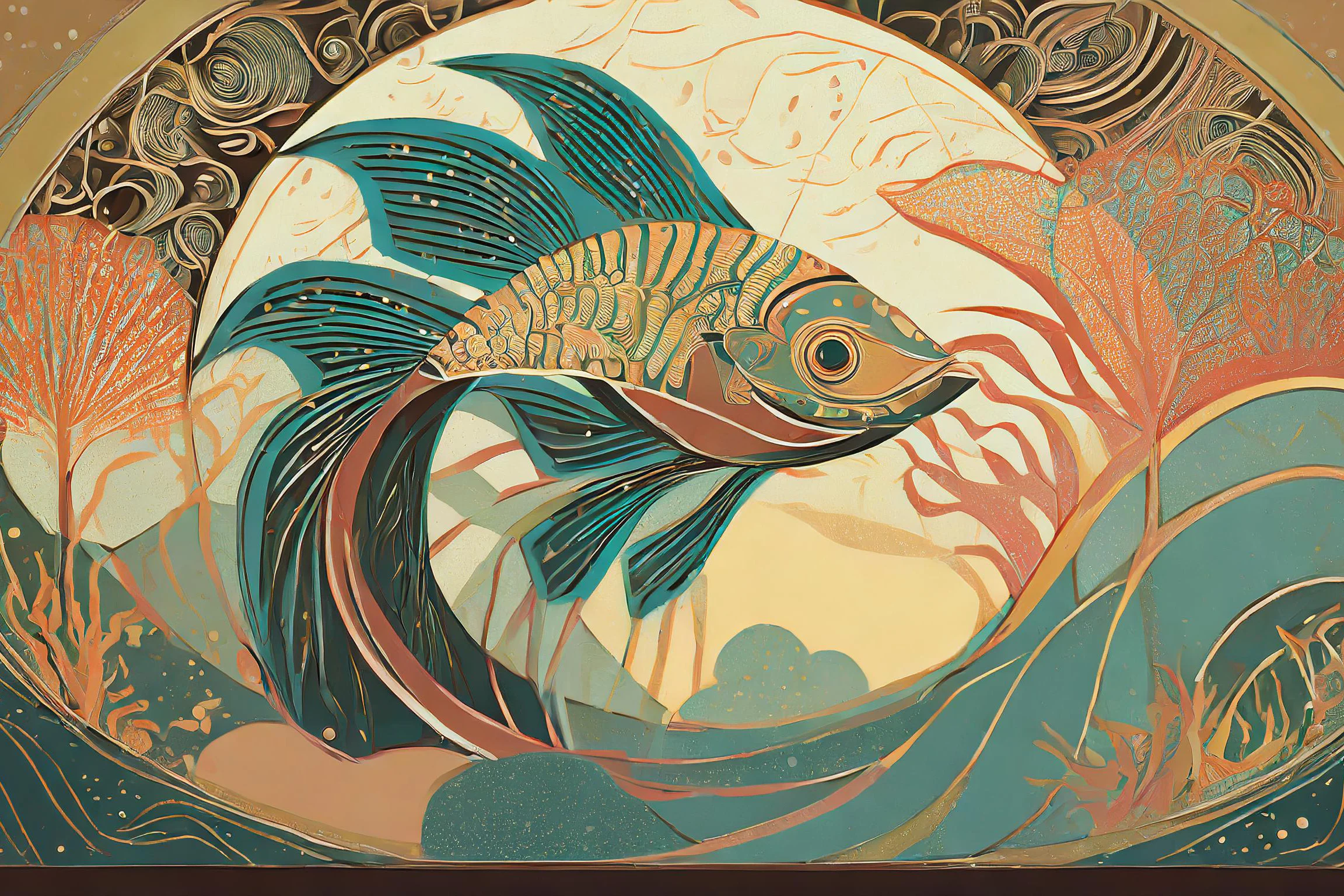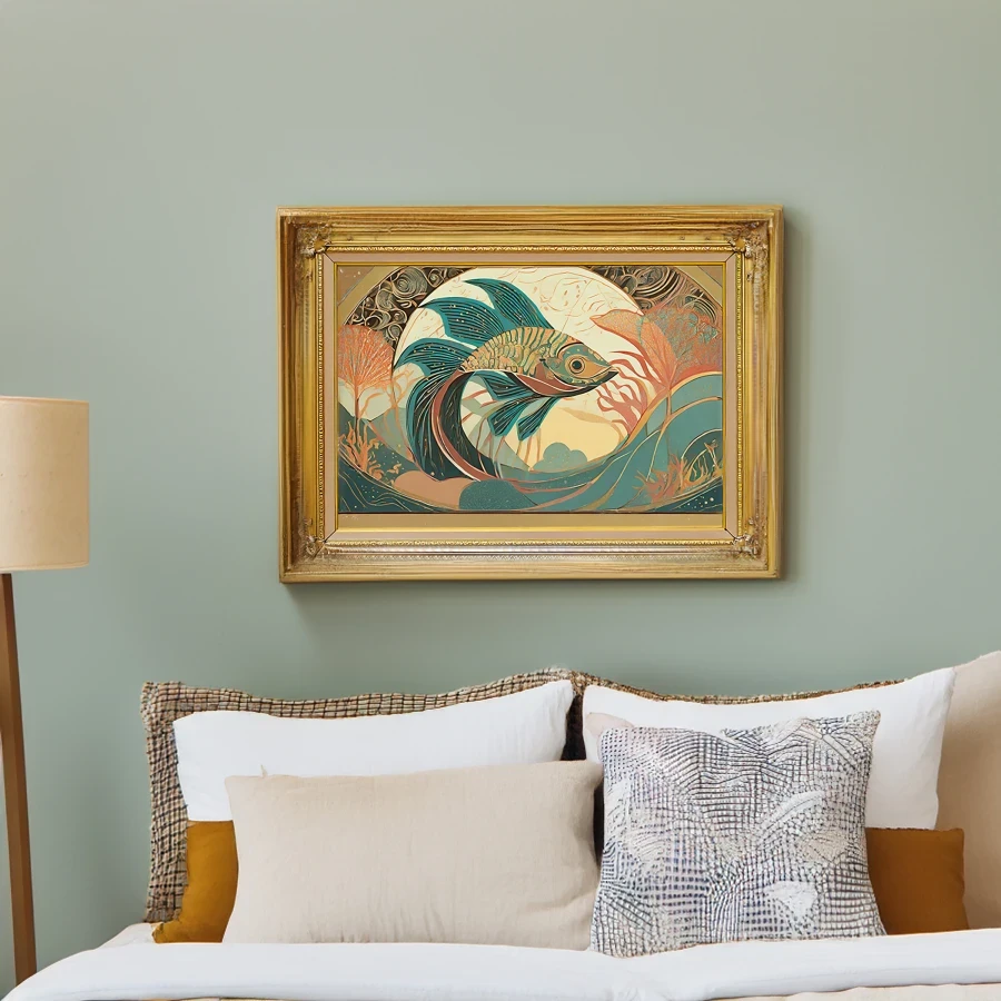 Iridescent beta fish swirl through an art nouveau dreamscape, their impossibly flowing fins creating hypnotic patterns in shimmering teal and coral. The design masterfully blends traditional Japanese woodblock sensibilities with the curvilinear extravagance of art nouveau, creating a mesmerizing dance between geometric structure and fluid natural forms. Listen, if you're not already imagining this as the statement piece in your supposedly "zen" meditation room while secretly hoping it makes your guests slightly dizzy, we need to have a serious talk about your design priorities.