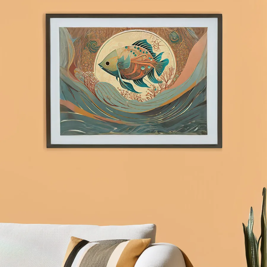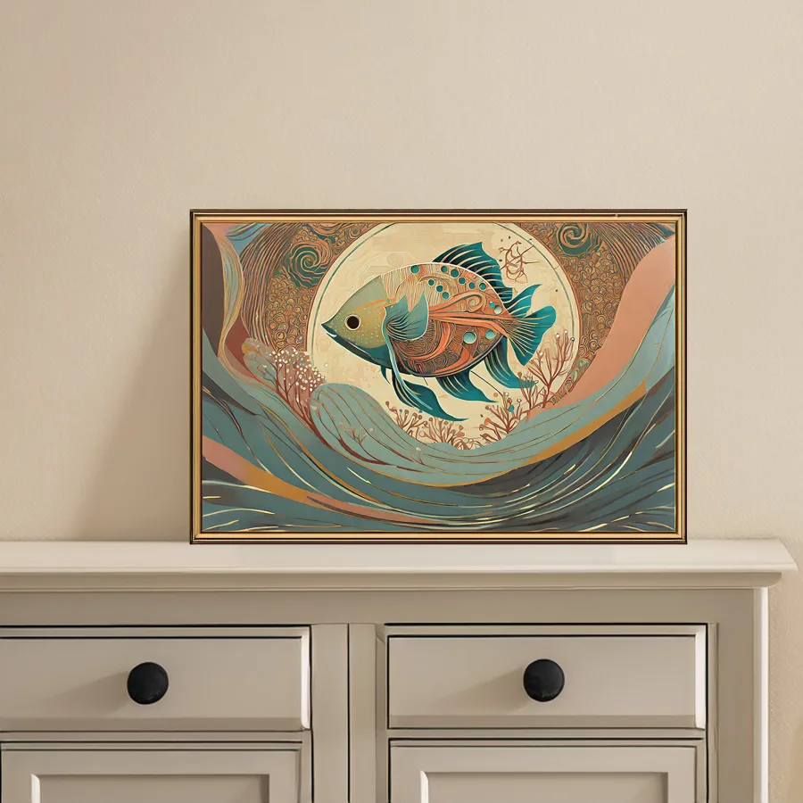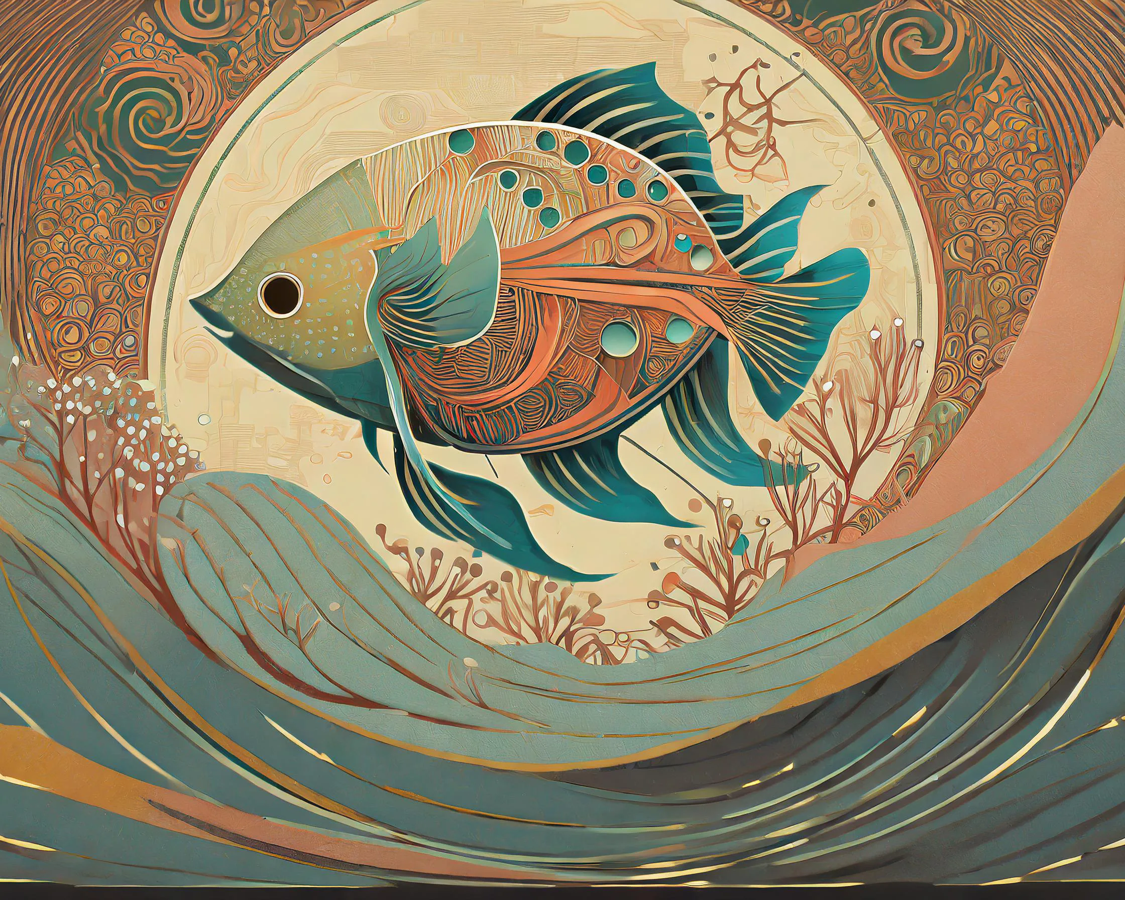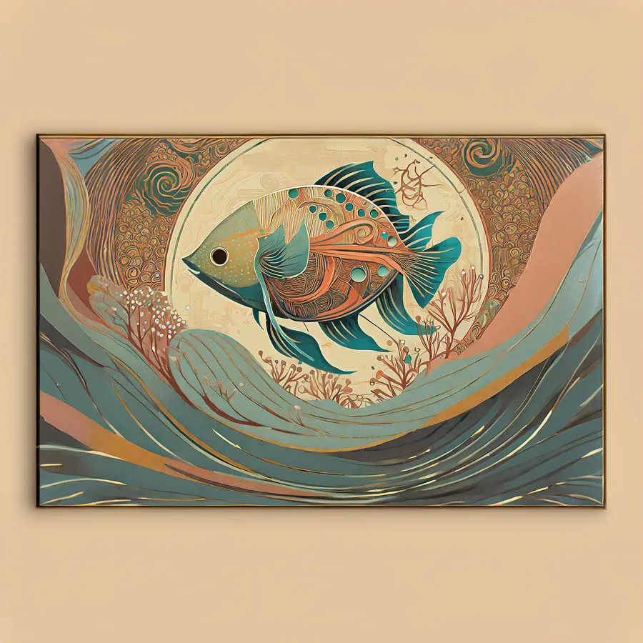 A luminescent mechanical fish radiates an otherworldly teal glow through its copper-plated scales, its body a hypnotic fusion of art nouveau swirls and steampunk gears. The piece masterfully blends the elegant fluidity of aquatic movement with the structured geometry of art deco, creating a mandala-like pattern that ripples outward like waves in a metallic ocean. Look, if you're not already planning to hang this bad boy in your fancy bathroom or that overpriced sushi spot downtown, you're honestly missing the point of having walls.