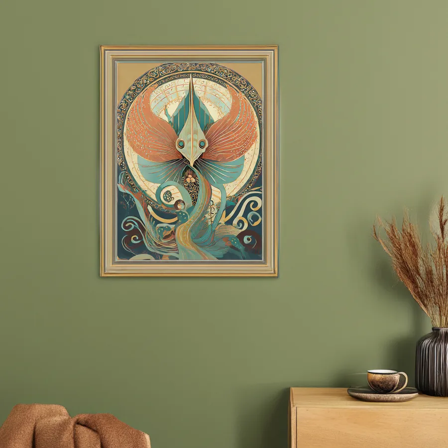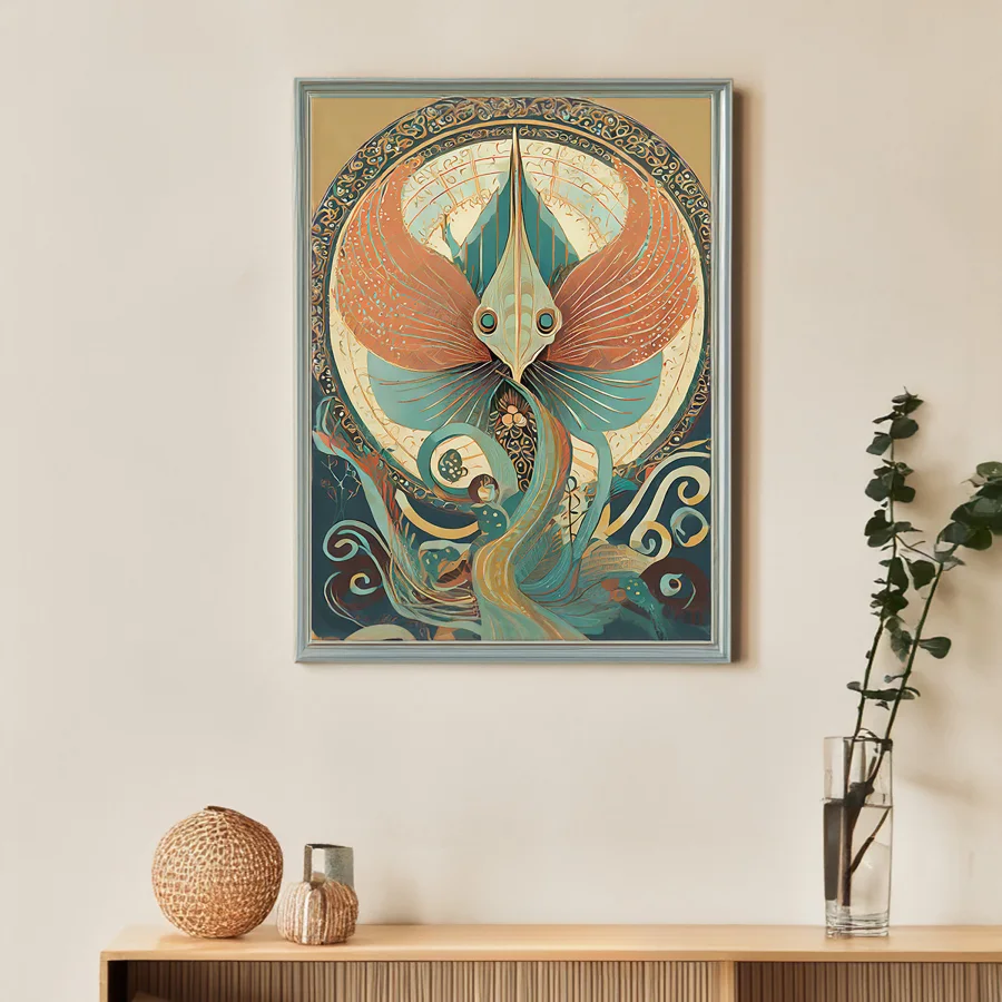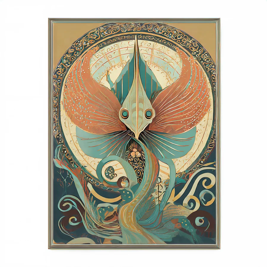 A mesmerizing peacock-phoenix hybrid bursts forth in swirling tendrils of teal and coral, its ethereal feathers morphing into Celtic knotwork that dances across the canvas. The Art Nouveau treatment elevates this mystical creature beyond mere decoration, transforming it into a spiritual totem through sacred geometric patterns and flowing, organic lines. Listen, if you're not already planning to hang this in your crystal-filled meditation nook while burning sage and channeling your inner peacock goddess, I honestly don't know what you're doing with your life.