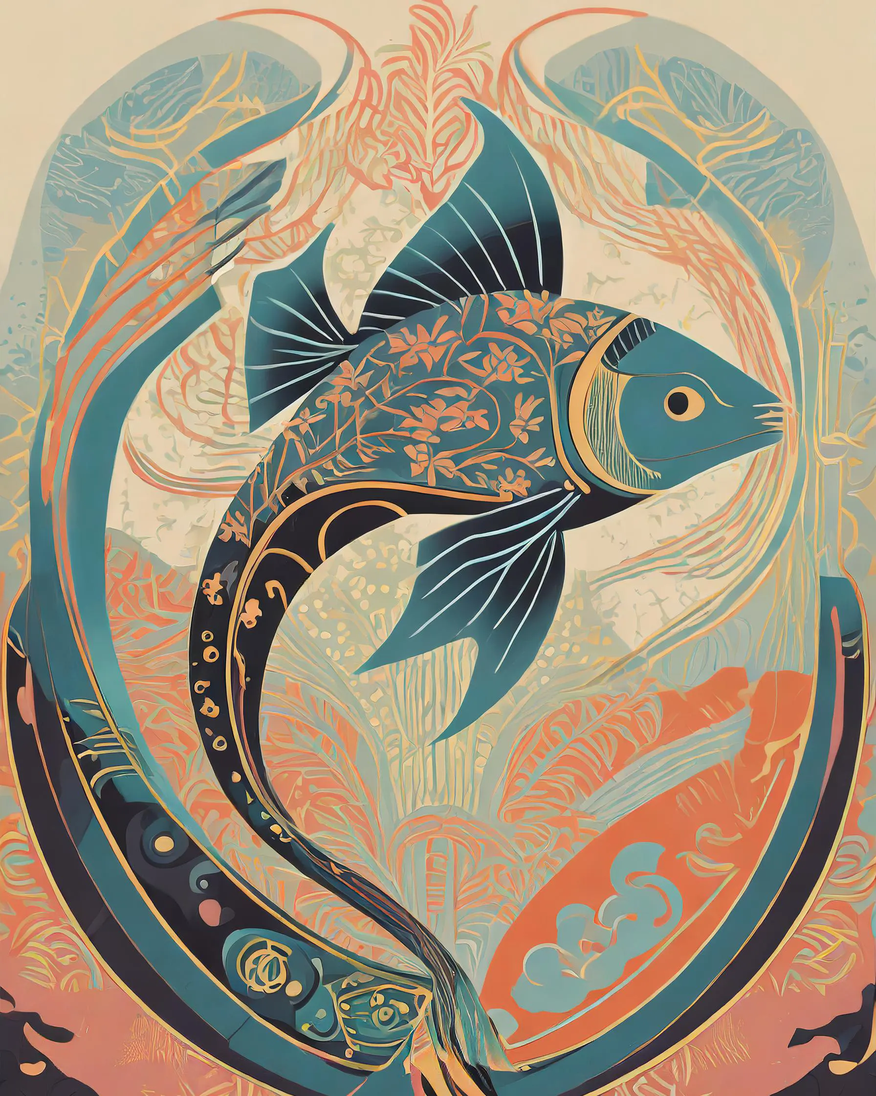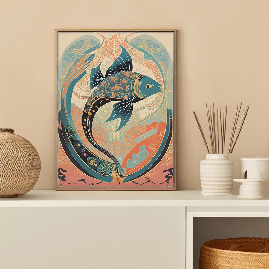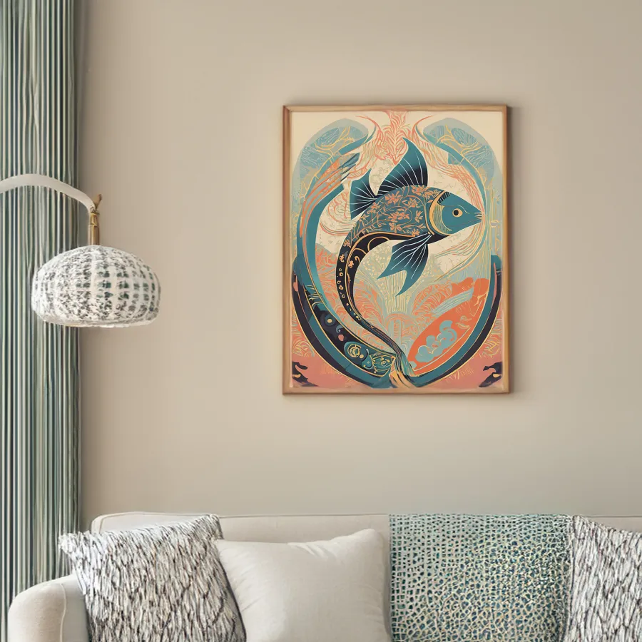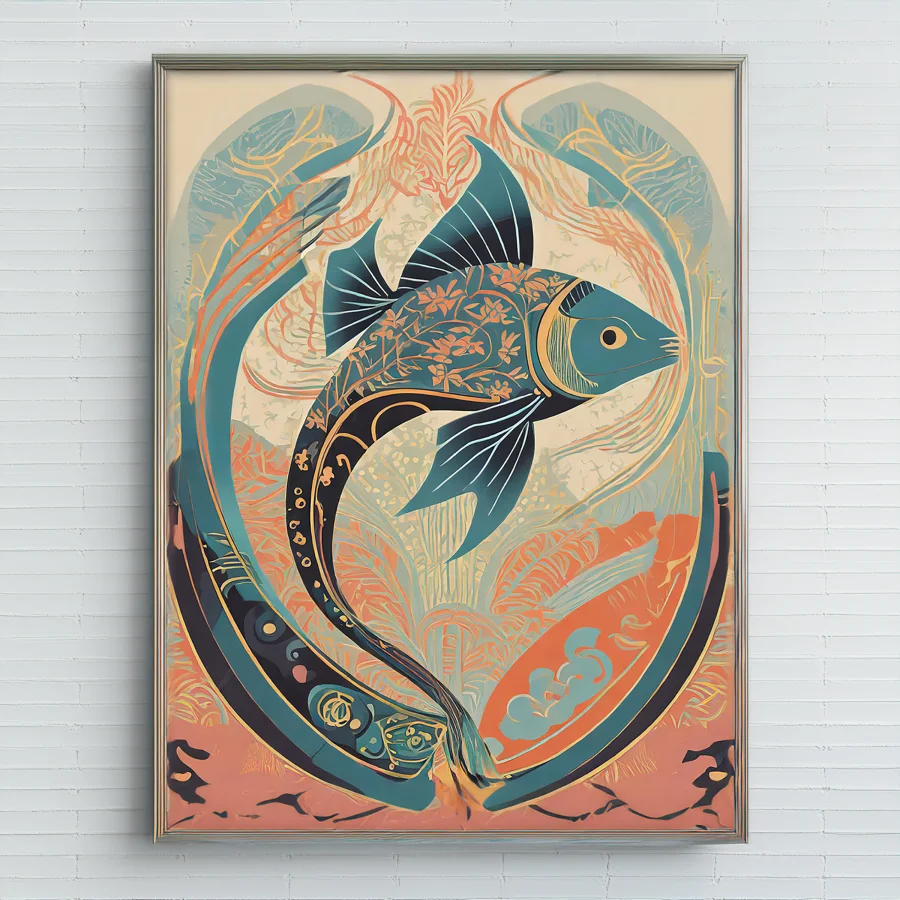 A hypnotic school of ethereal koi fish swirls through space in an endless dance of teal and coral, their fluid forms creating a mesmerizing vortex that's impossible to look away from. The piece masterfully blends the ornate flourishes of art nouveau with the precise elegance of traditional Japanese woodblock prints, creating a dreamy underwater symphony that would make Alphonse Mucha weep into his absinthe. Listen, if you're not already imagining this as the focal point of your meditation room while pretending you're in a Miyazaki film, I don't even know what to tell you.