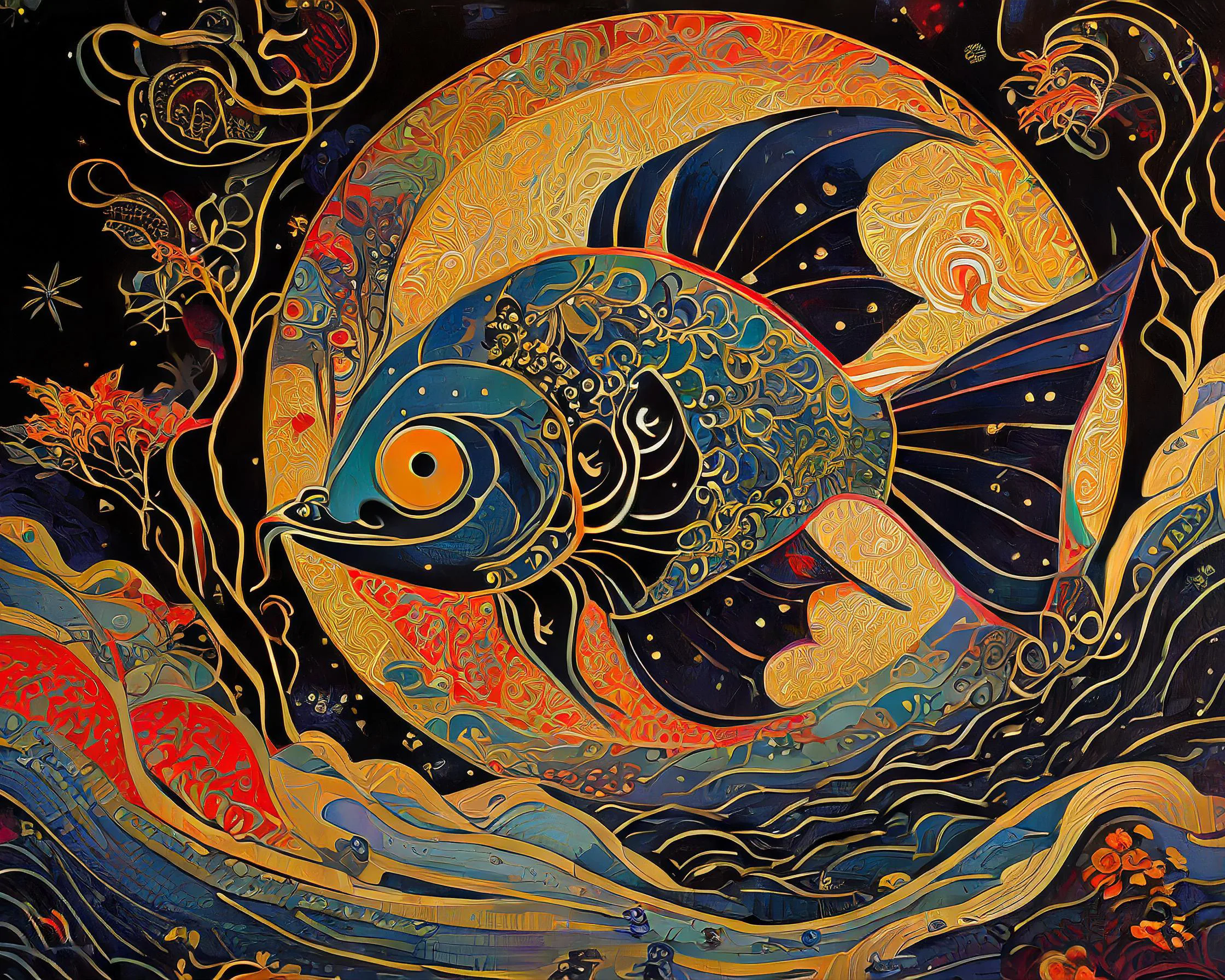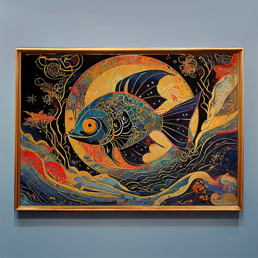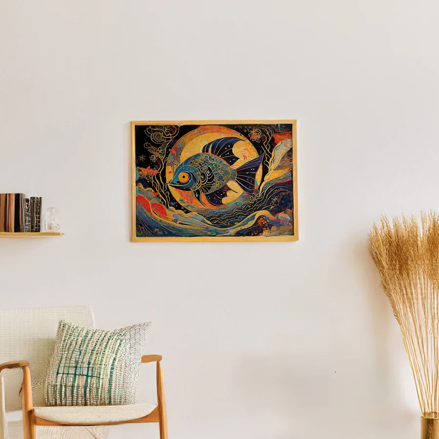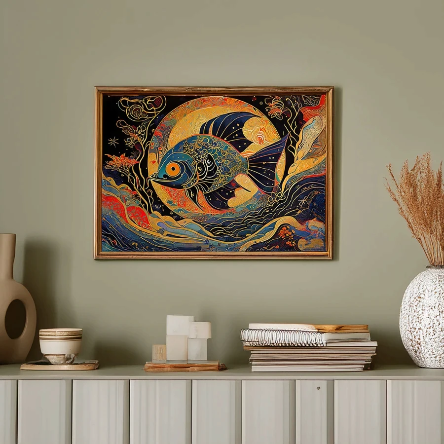 A luminous koi fish radiates otherworldly golden light, its scales creating a hypnotic dance of ethereal patterns that seem to pulse with their own cosmic heartbeat. The Art Nouveau-inspired piece flows with curving teal and metallic flourishes, blending Japanese aesthetics with psychedelic stained-glass sensibilities in a way that would make Alphonse Mucha high-five a Zen master. Listen, if you're not already planning to hang this in your meditation room or that overpriced sushi spot downtown, you're seriously missing out on some next-level enlightenment vibes.