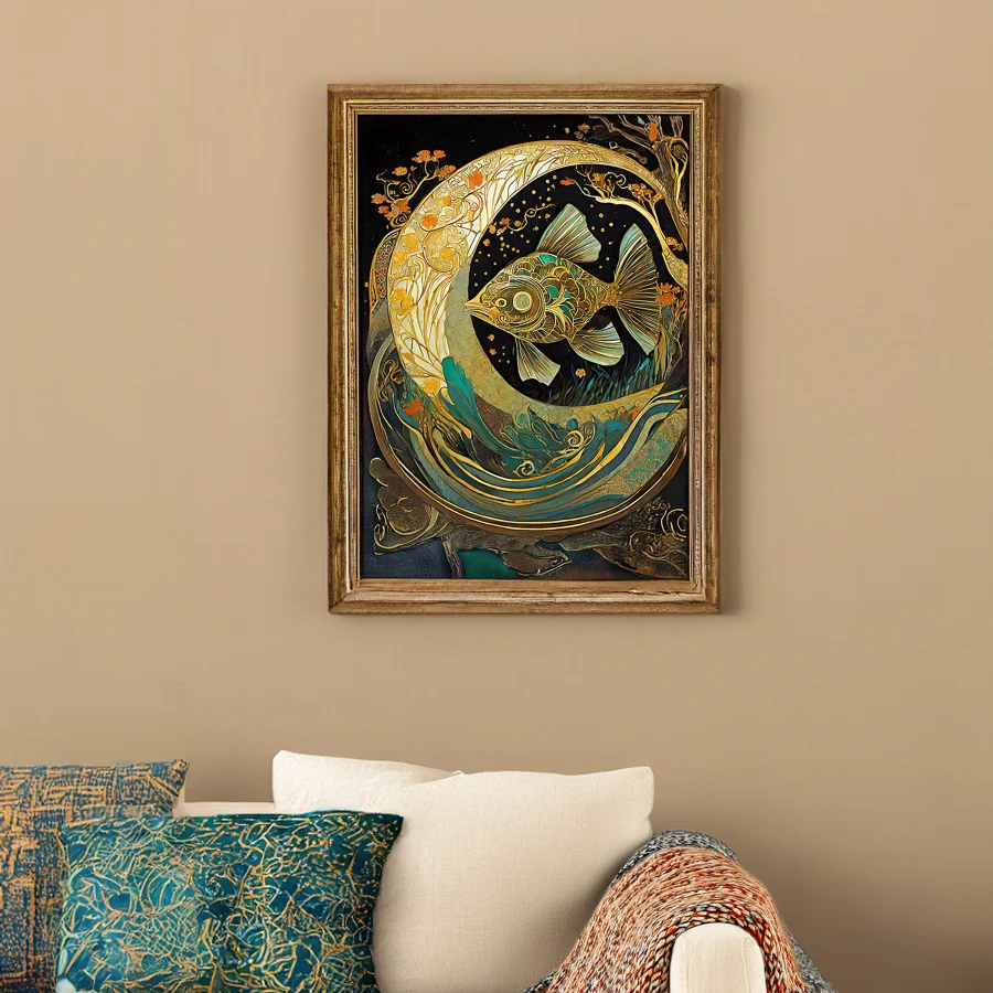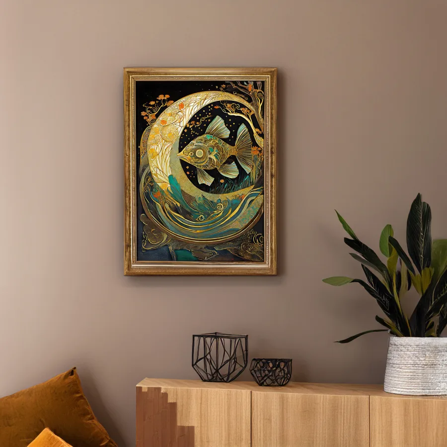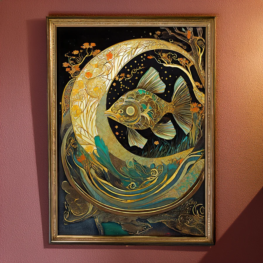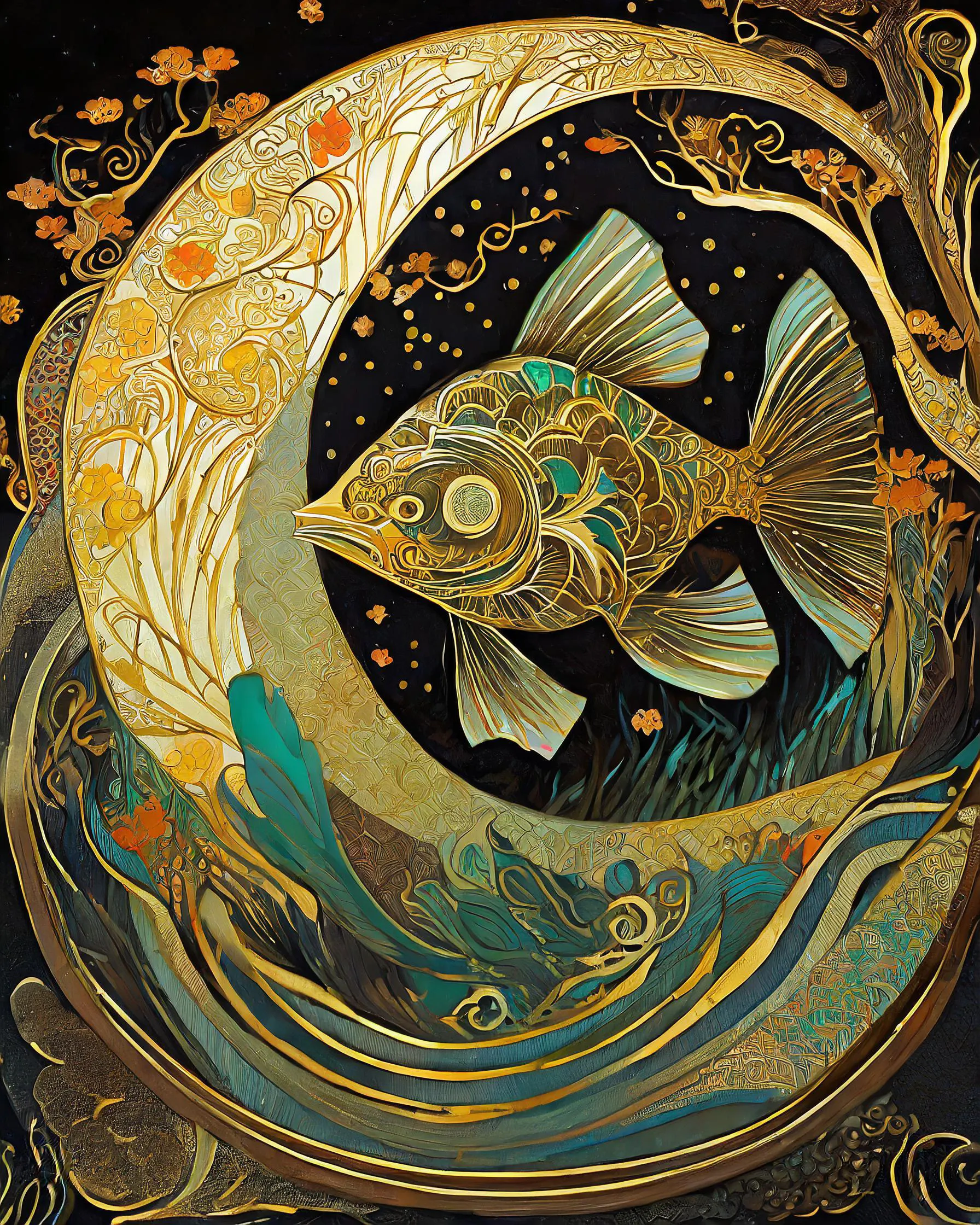 A mesmerizing mechanical fish gleams in liquid gold, its gears and fins crafted with impossibly precise detail that catches light like sun-dappled waves. This stunning fusion of Art Nouveau curves and steampunk machinery creates an underwater fantasy piece that would make both Jules Verne and Gustav Klimt weep into their respective beards. Look, if you're not already imagining this hanging in your meditation room while you pretend to be a fabulously wealthy mermaid with impeccable taste, we probably can't be friends.