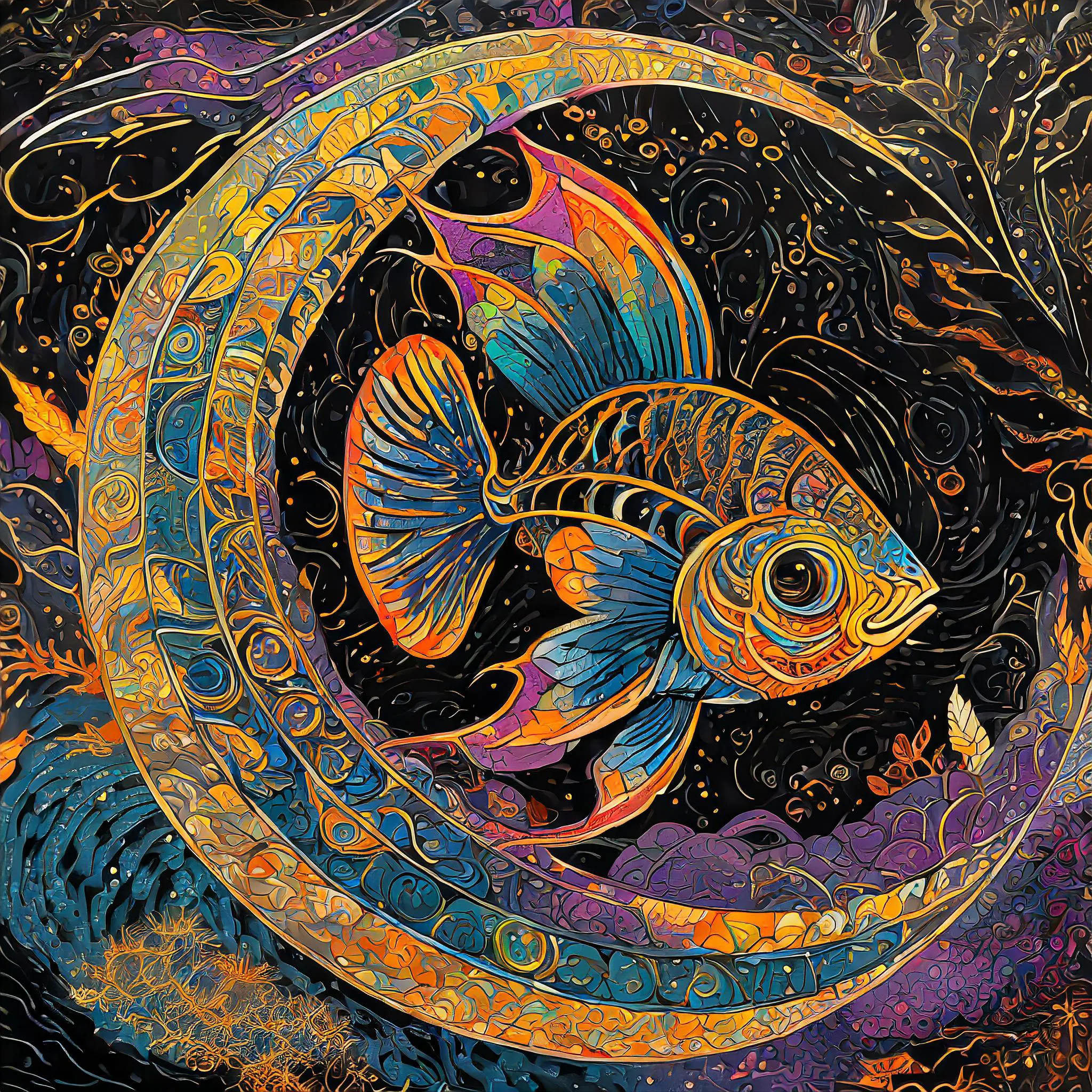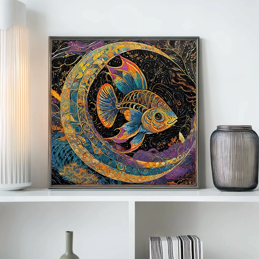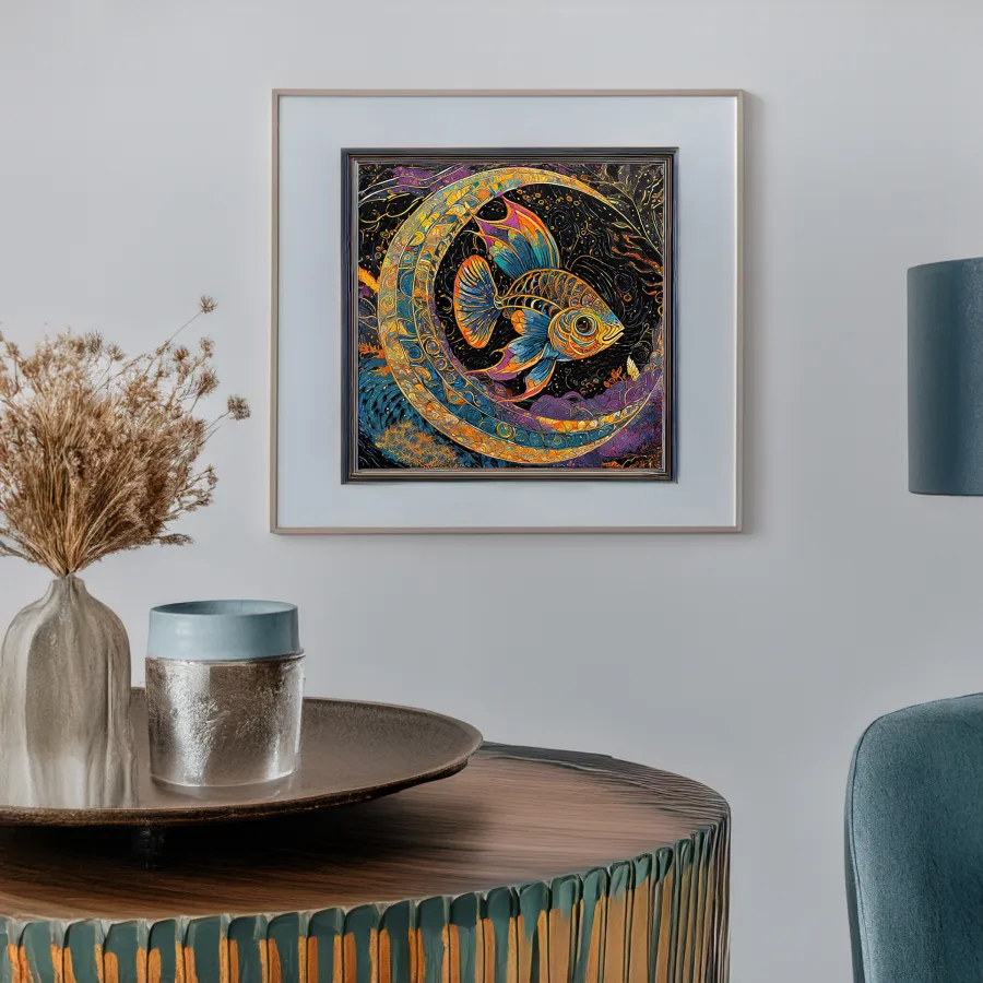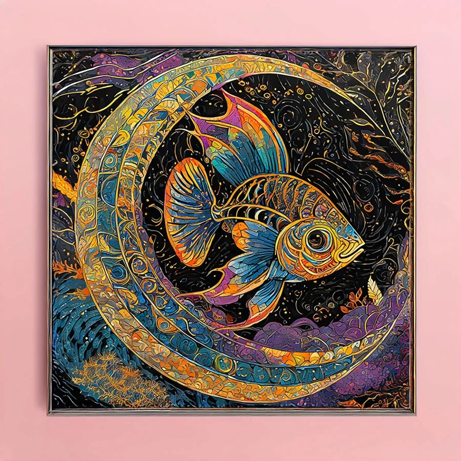 A kaleidoscopic school of cosmic fish swirls through a nebula of neon purples and electric blues, their scales reflecting starlight like living disco balls in the depths of space. The sacred geometry-inspired patterns and stained glass aesthetic create a mesmerizing fusion of aquatic and astral elements, perfectly balanced between mystical meditation vibes and that "3am watching Finding Nemo after eating questionable mushrooms" energy. Look, if you don't immediately want this as either a tattoo or a statement piece in your bohemian meditation room, we probably can't be friends.
