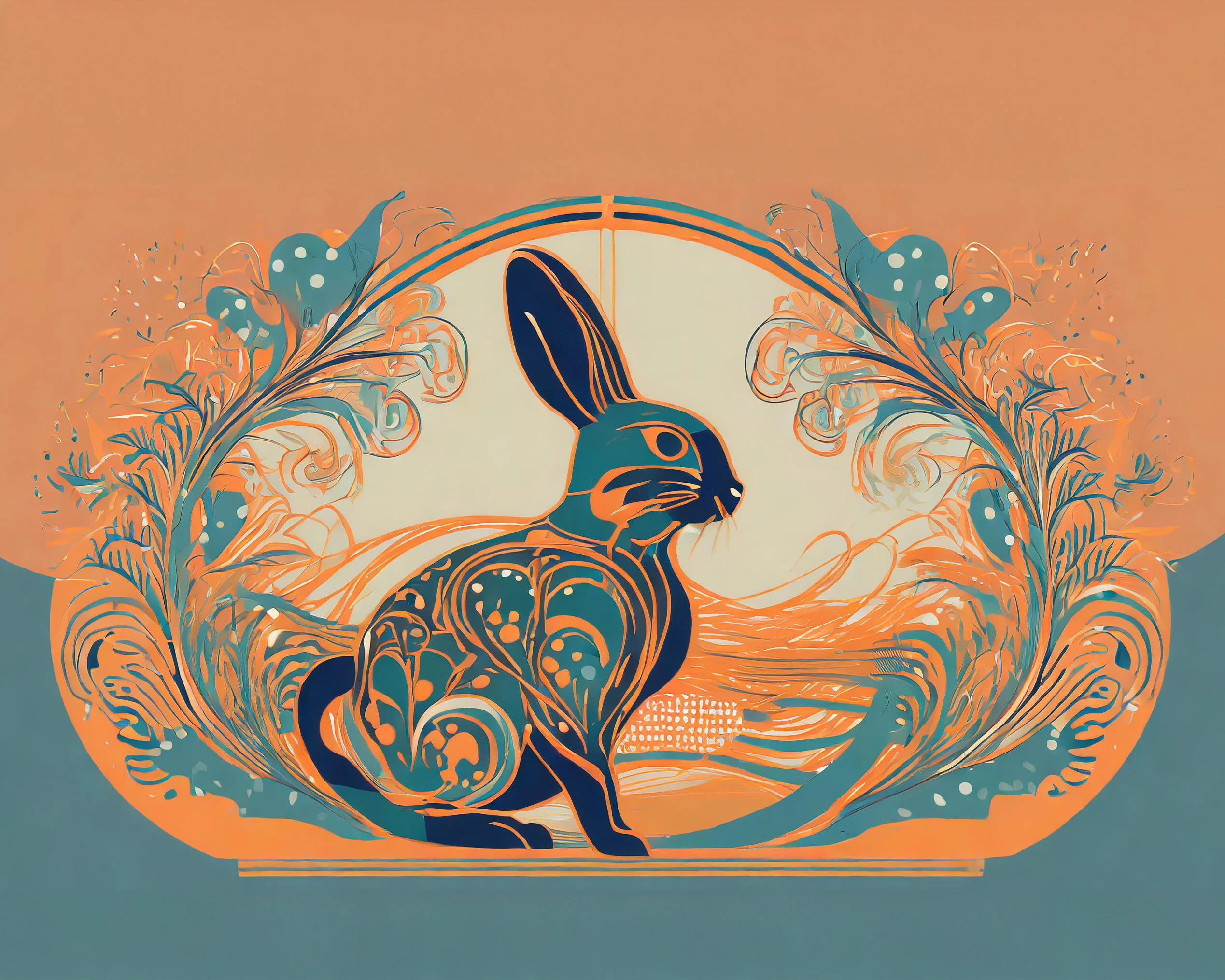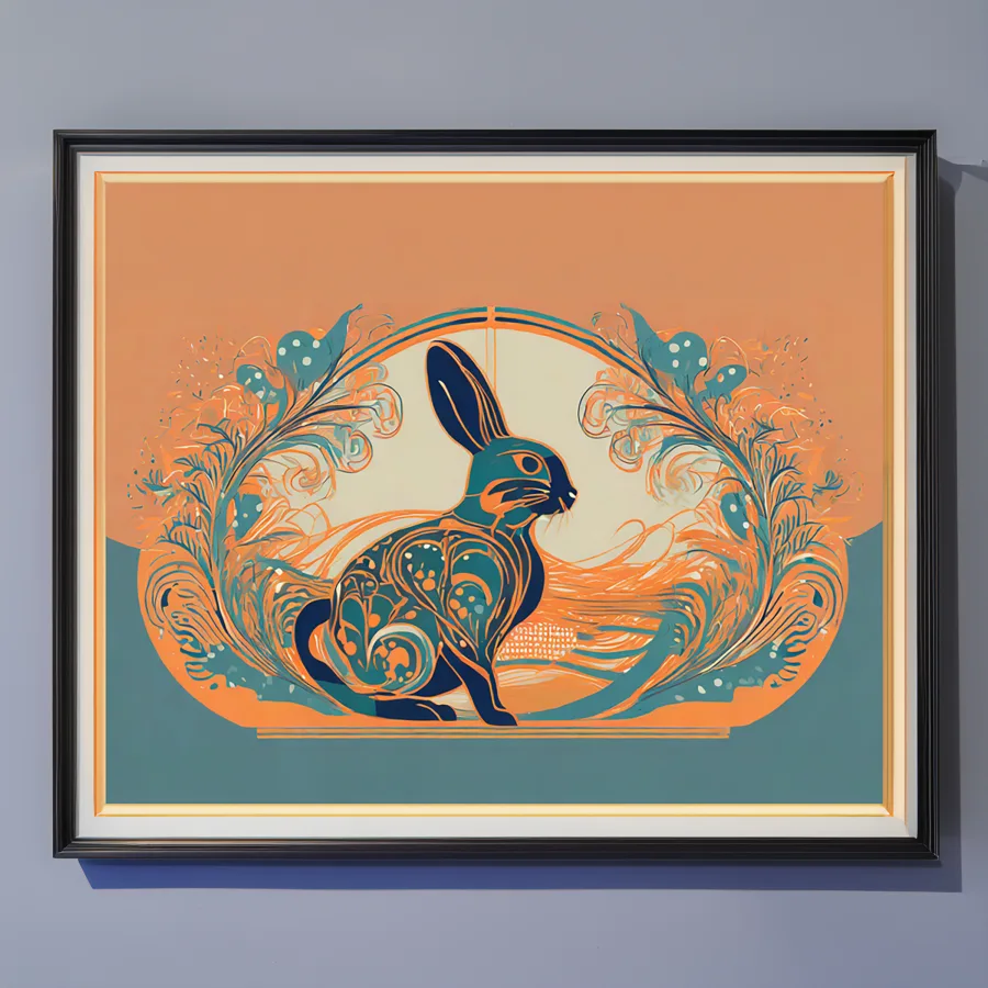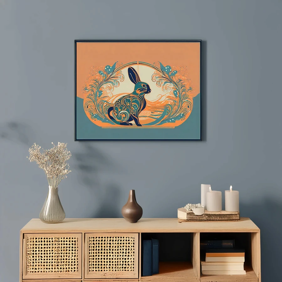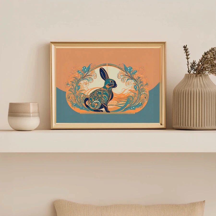 A majestic rabbit emerges from swirling Art Nouveau curves in a hypnotic dance of teal and burnt orange, its form both earthly and ethereal against a backdrop of botanical flourishes. Like Alphonse Mucha decided to drop acid and redesign Peter Rabbit, this whimsical spirit bunny represents the perfect marriage of mystical folklore and sophisticated design sensibility. Listen, if you're not immediately imagining this as the centerpiece of your cottagecore dreams, bringing big magical energy to your nursery or boho space, we probably can't be friends.