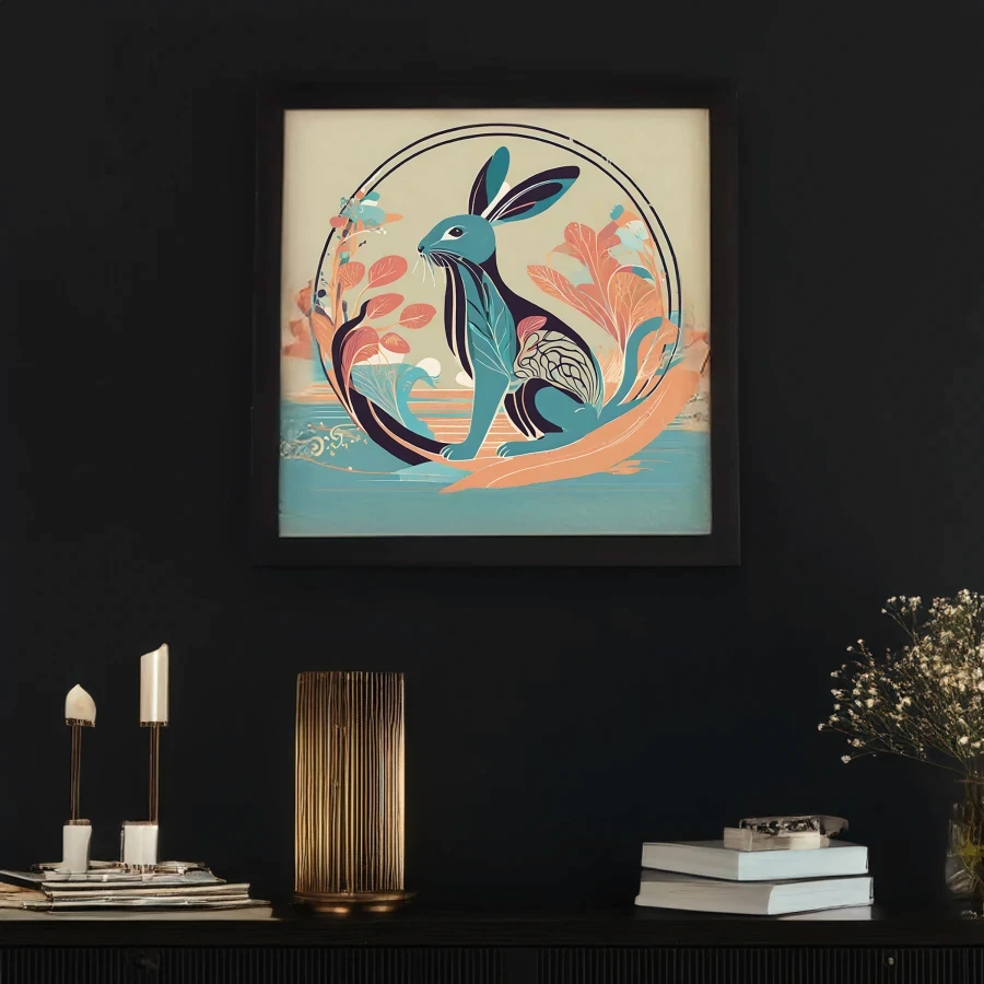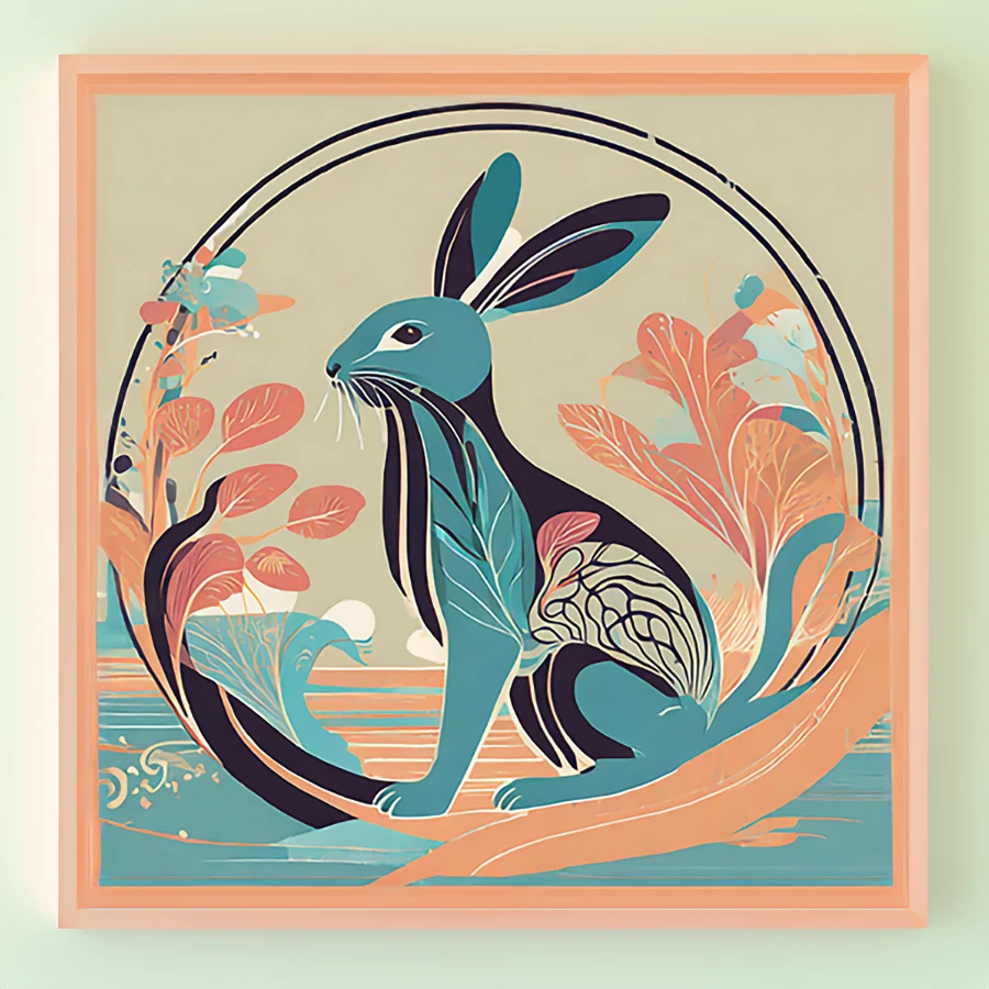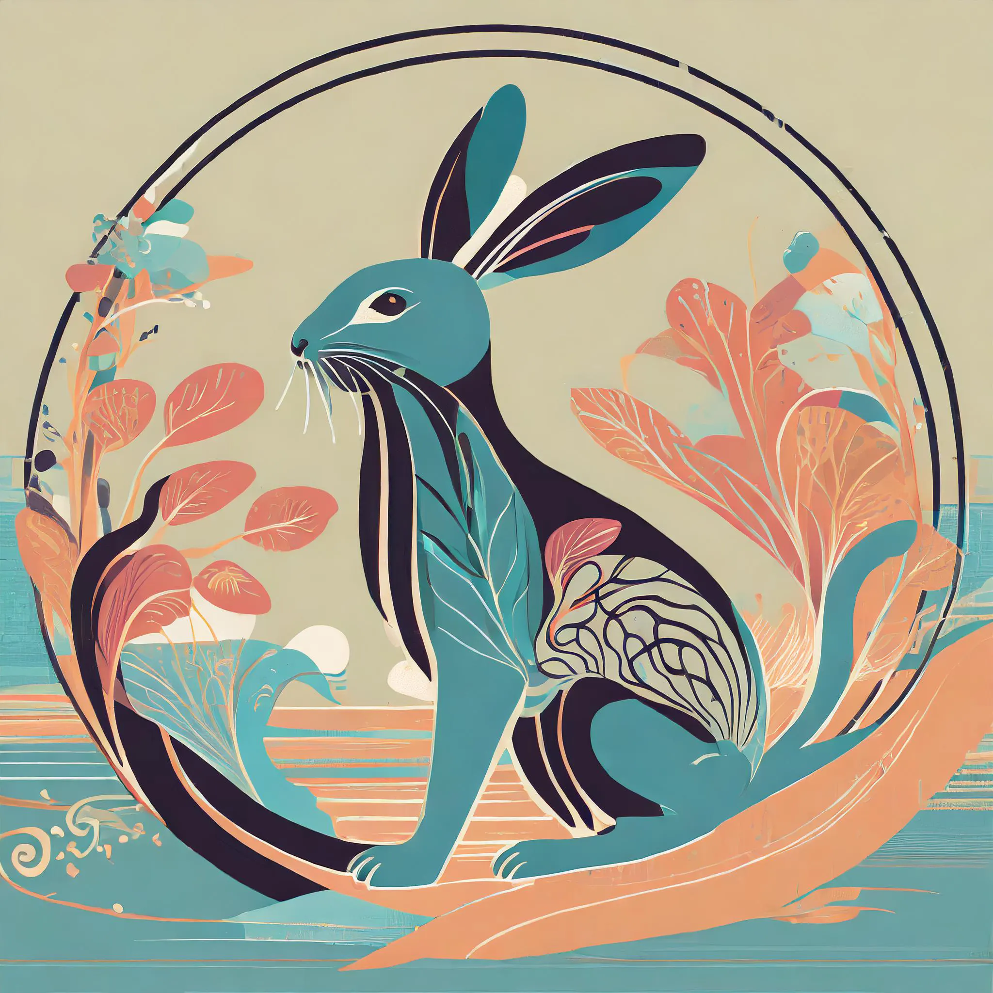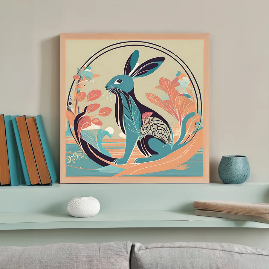 A mesmerizing geometric hare leaps through swirling patterns of teal and coral, its form pieced together from botanical fragments and mystic symbols that practically pulse with spiritual energy. The illustration masterfully blends Art Nouveau's flowing lines with modern indie sensibilities, creating a dreamy cottagecore aesthetic that would make even Studio Ghibli's artists do a double-take. Look, if this piece doesn't immediately make you want to curl up in a reading nook with a $7 oat milk latte and contemplate your connection to the universe, I honestly don't know what will.