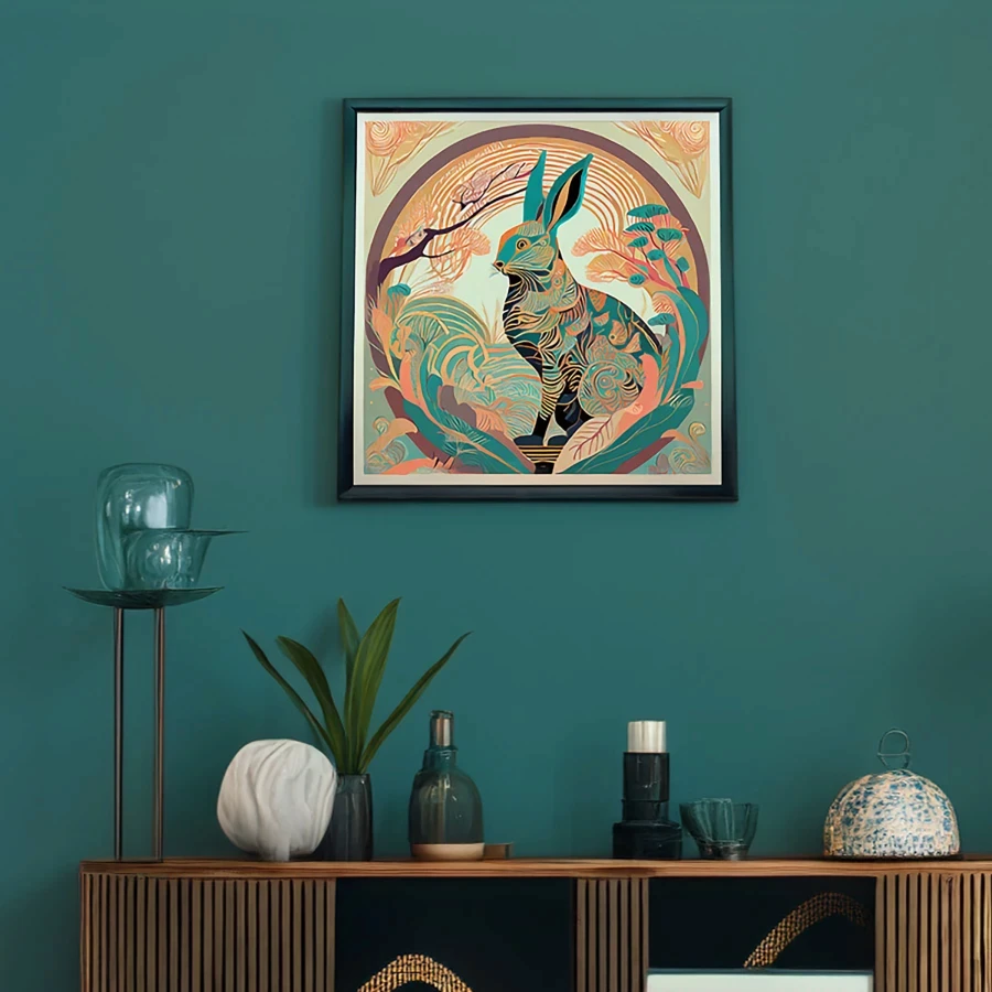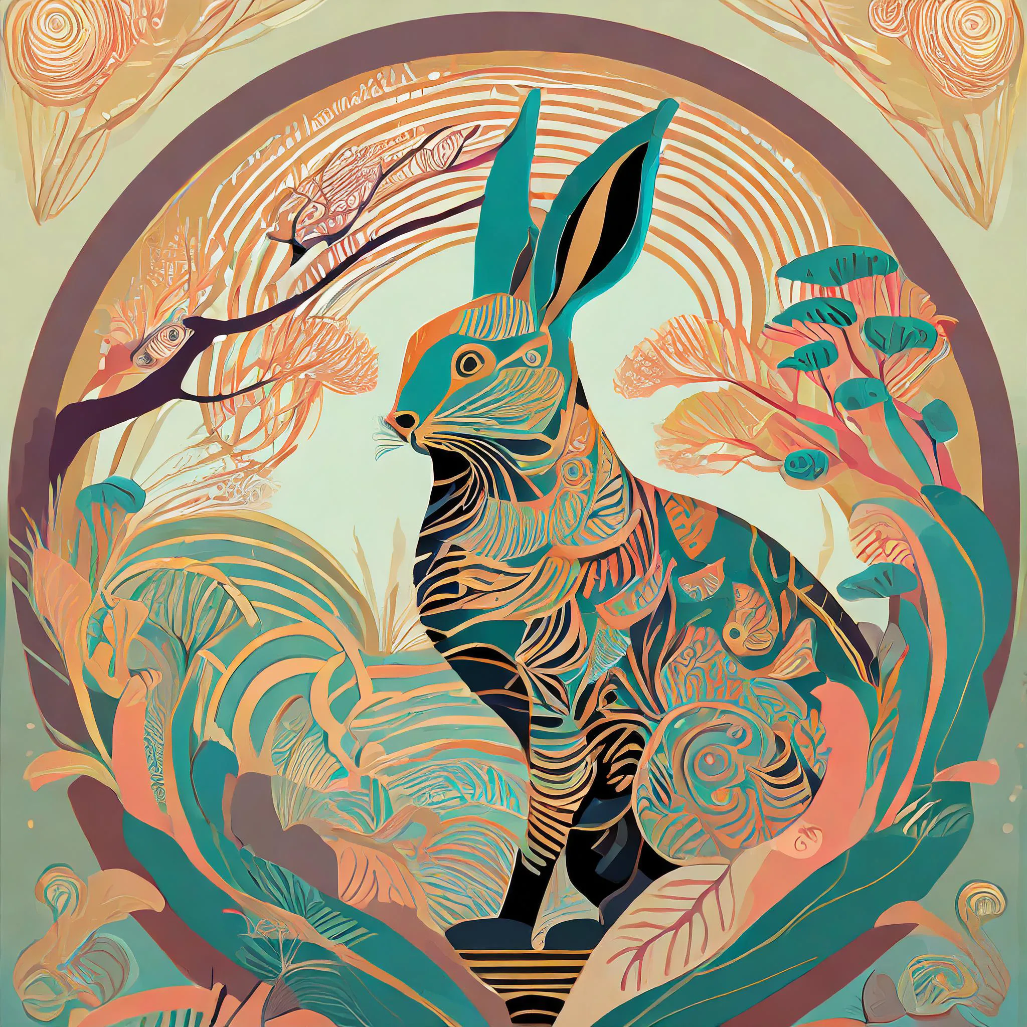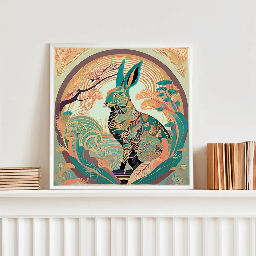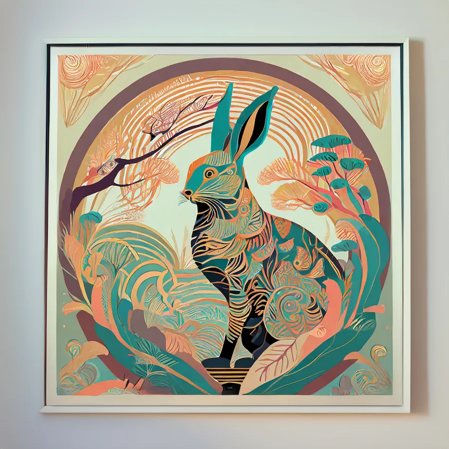 A mesmerizing hare emerges from swirling art nouveau patterns, its form traced in delicate teal and coral lines that seem to pulse with their own mystical energy. The intricate mandala-like designs surrounding our woodland friend merge the spiritual with the psychedelic, creating a perfect balance between Alice in Wonderland whimsy and sacred geometry. Listen, if this piece doesn't immediately make you want to quit your job, start an indie coffee shop, and build your entire aesthetic around magical forest creature vibes, I don't know what will.