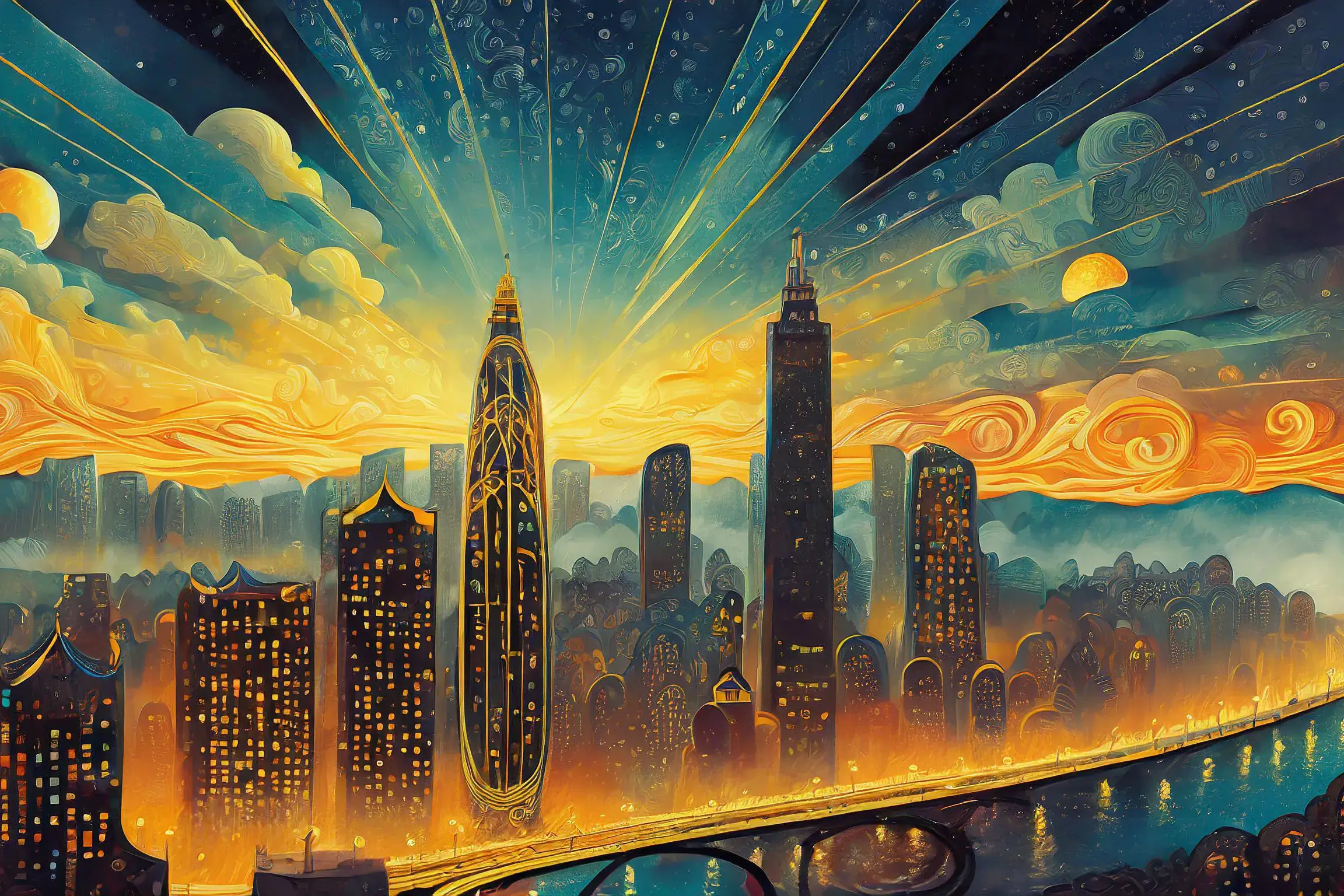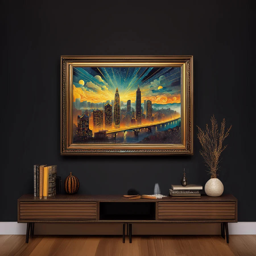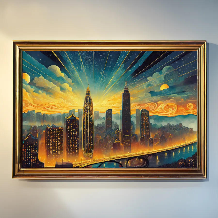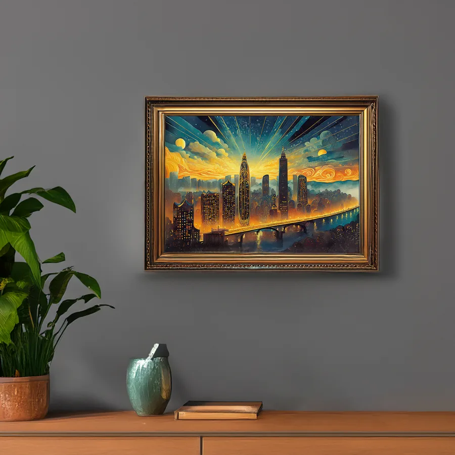 The Empire State Building pierces through swirling golden clouds like a needle through silk, while the surrounding skyscrapers dance and ripple as if reflected in cosmic water. The piece channels pure Van Gogh energy with its thick, dreamy brushstrokes transforming Manhattan's rigid geometry into an impressionist fever dream of ochres and ultramarines. Look, if you're not immediately making this your Zoom background to flex on Karen from accounting during the next budget meeting, you're honestly doing life wrong.