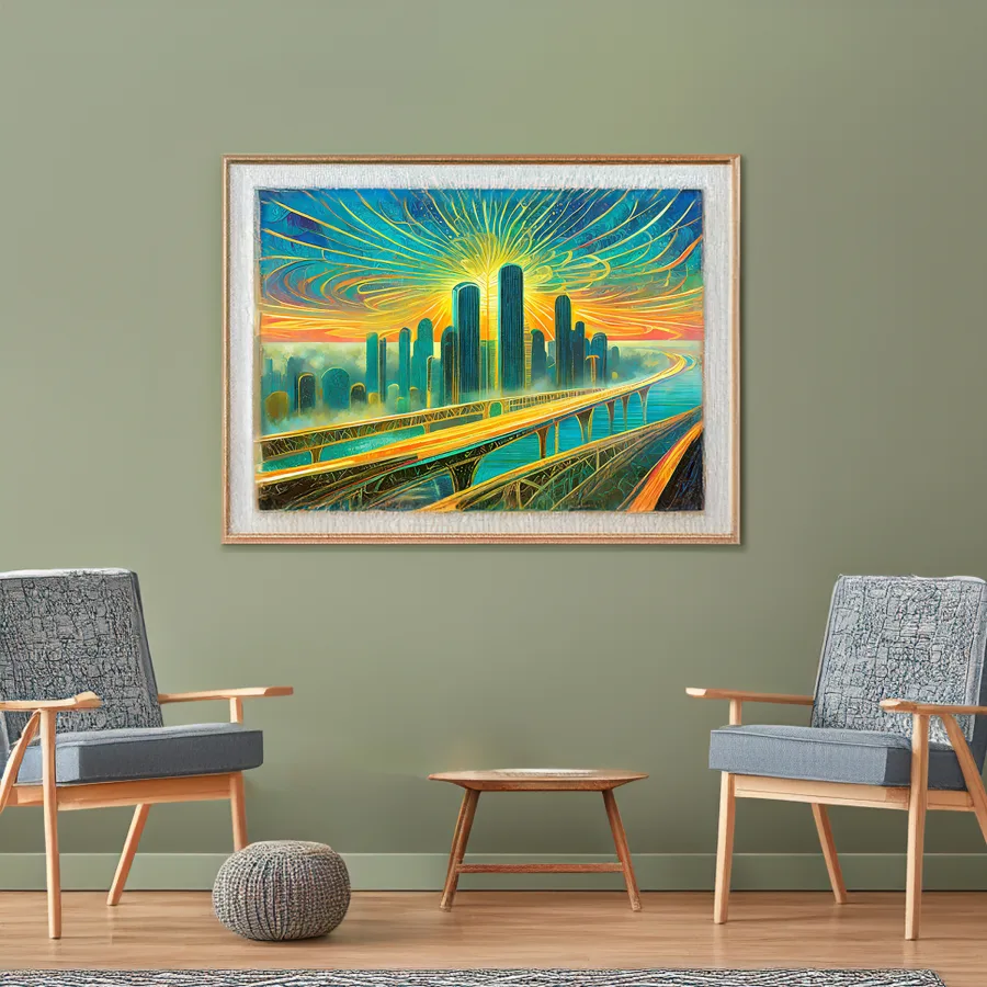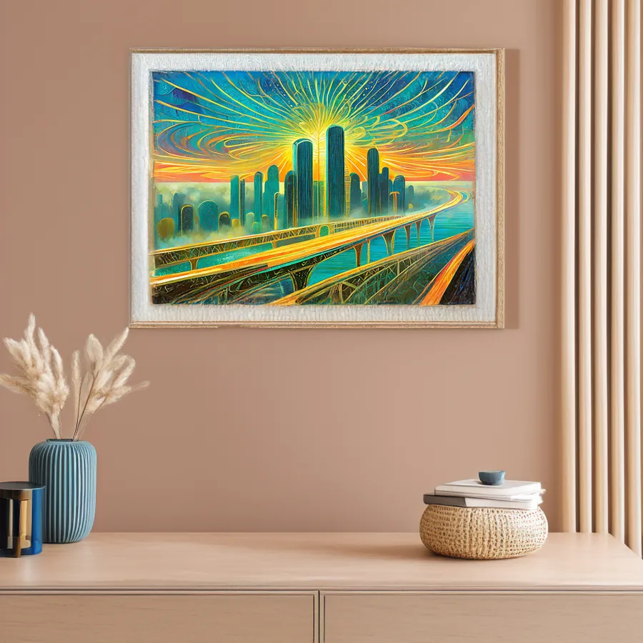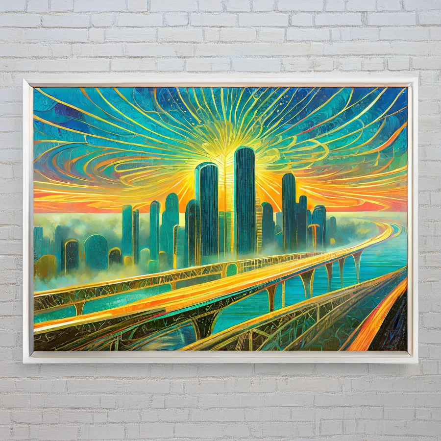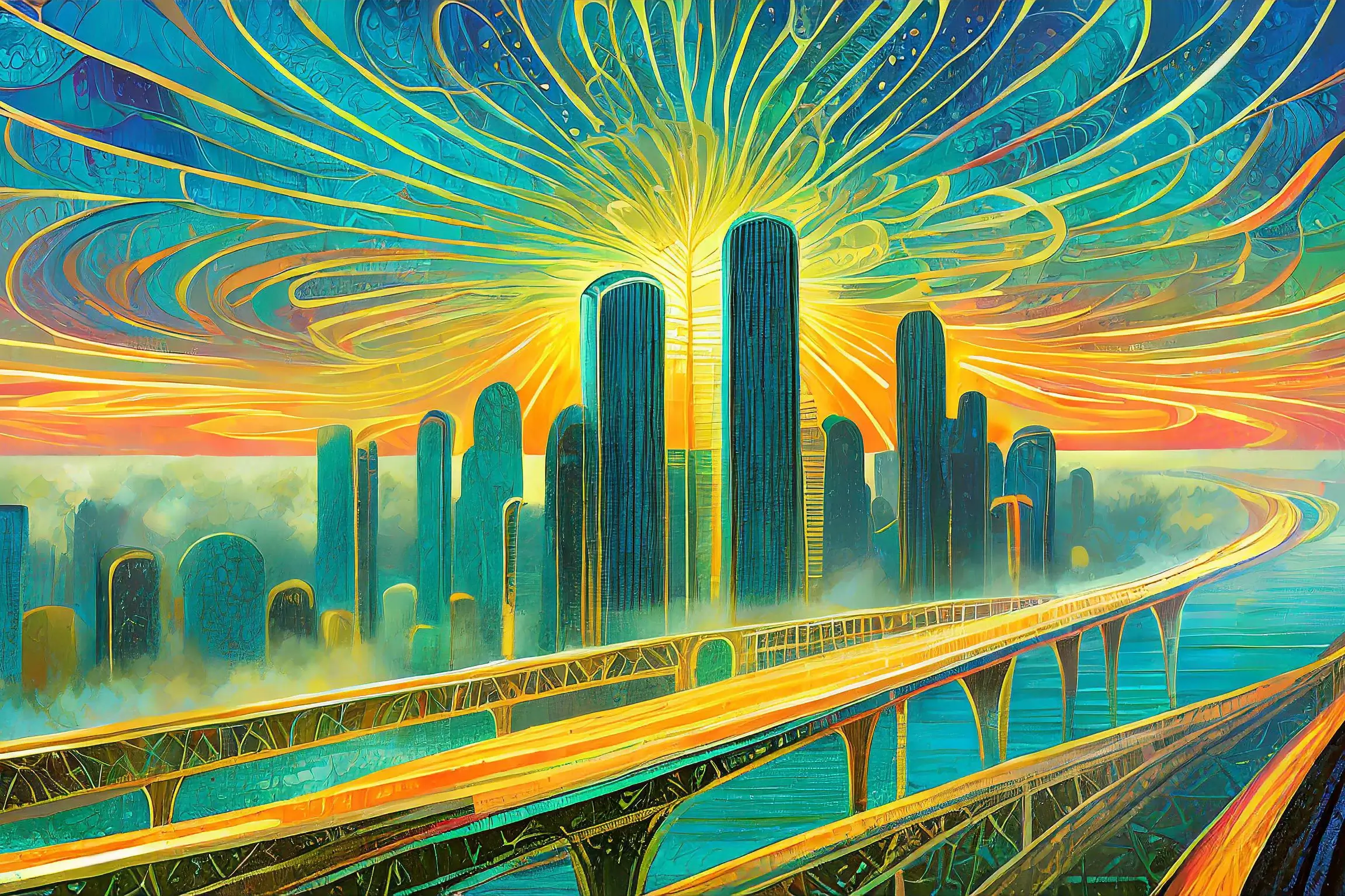 A mind-bending sunset bleeds impossible shades of turquoise and gold across towering crystalline skyscrapers that pierce the heavens like ancient cosmic spears. The composition masterfully blends retrofuturistic architectural precision with dreamy vaporwave aesthetics, creating a psychedelic urban paradise that would make both Blade Runner and Miami Vice jealous. Look, if this doesn't make you want to hop into your hover-convertible and cruise down that endless highway while blasting synthwave at 3 AM, I honestly don't know what will.