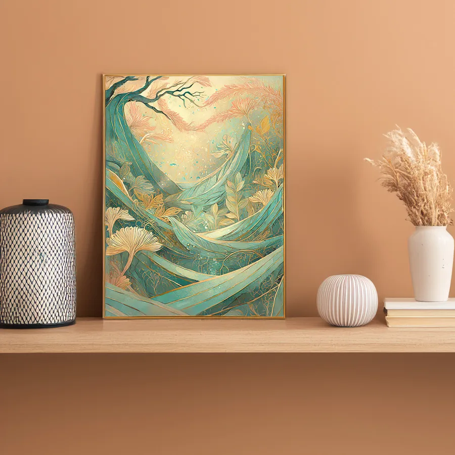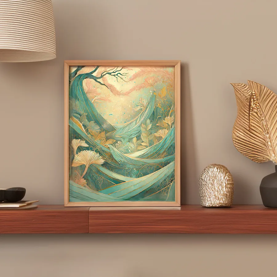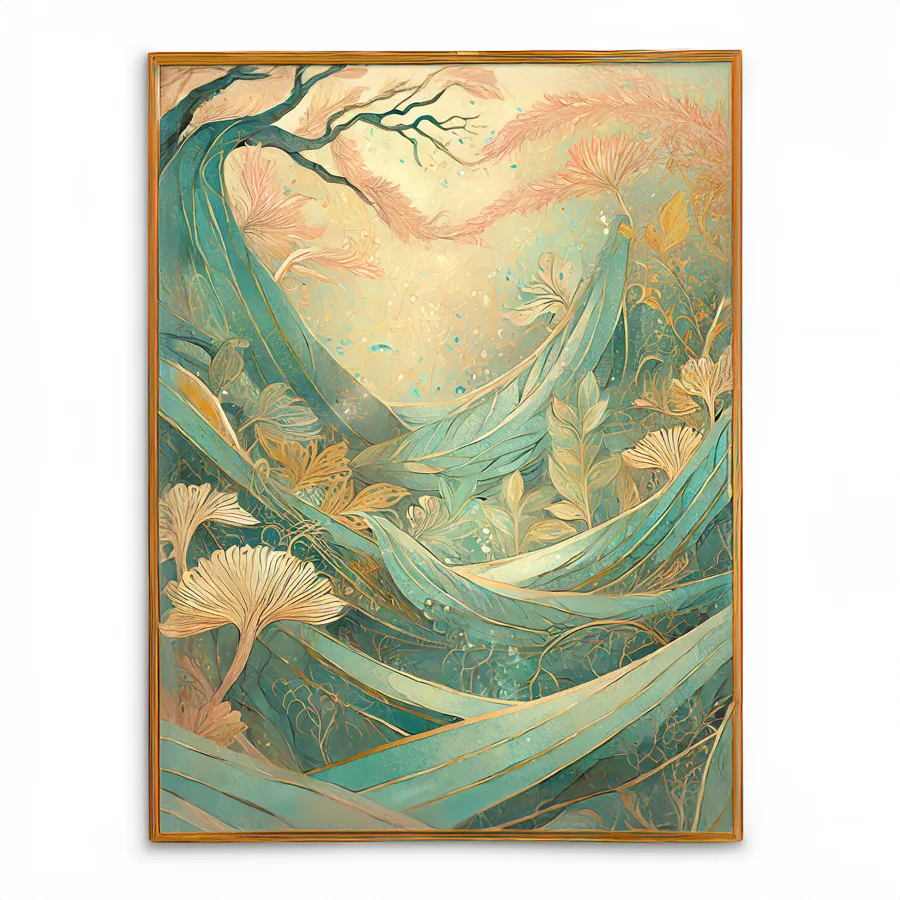Floating through an ethereal mist, delicate golden dandelion seeds dance across a teal-washed canvas like wishes caught in an underwater breeze. The piece masterfully blends Art Nouveau's flowing organic lines with modern digital painting techniques, creating a dreamlike botanical symphony that would make Alphonse Mucha weep into his absinthe. Listen, if you're not already imagining yourself as a tiny forest sprite living in this aqua wonderland while doing your morning meditation, you're honestly just not vibing hard enough.