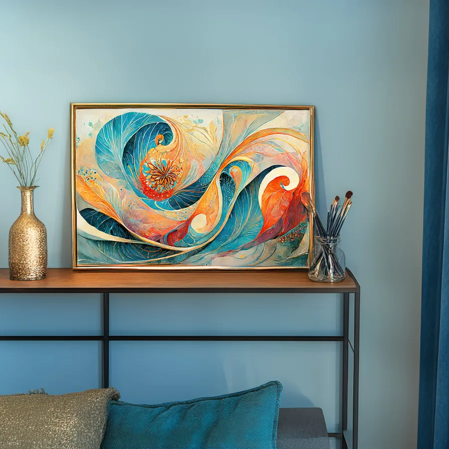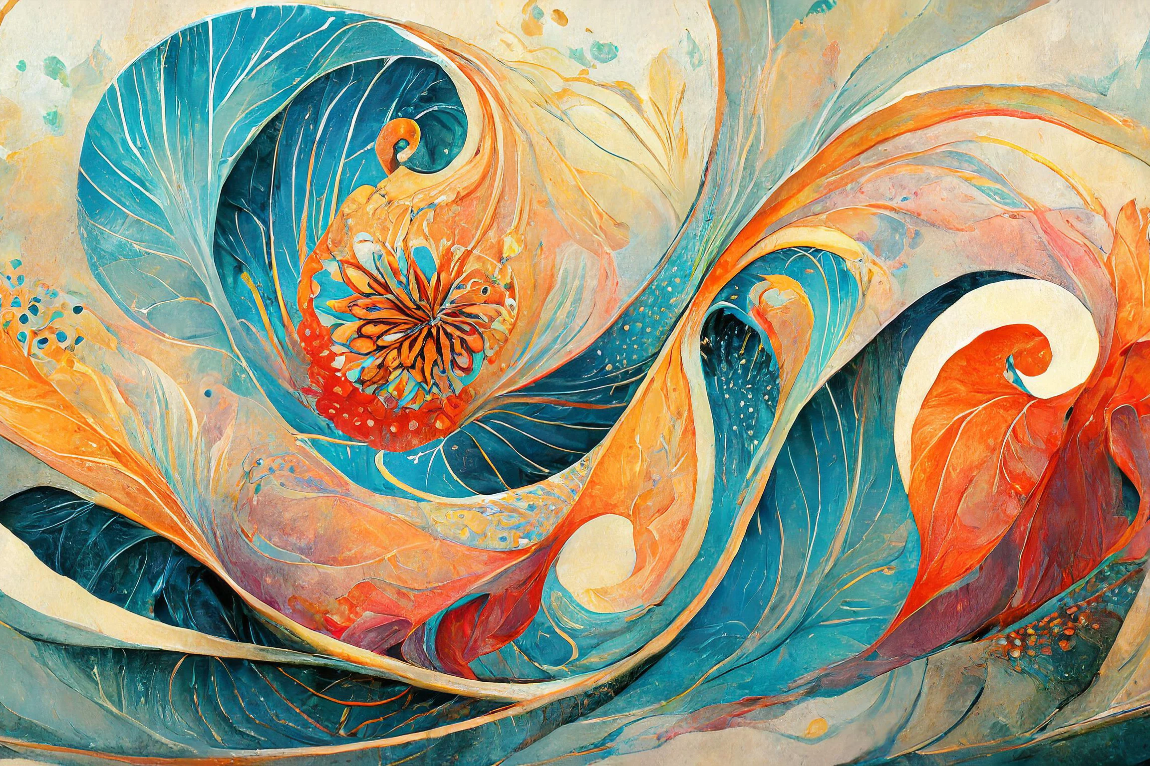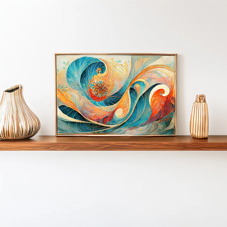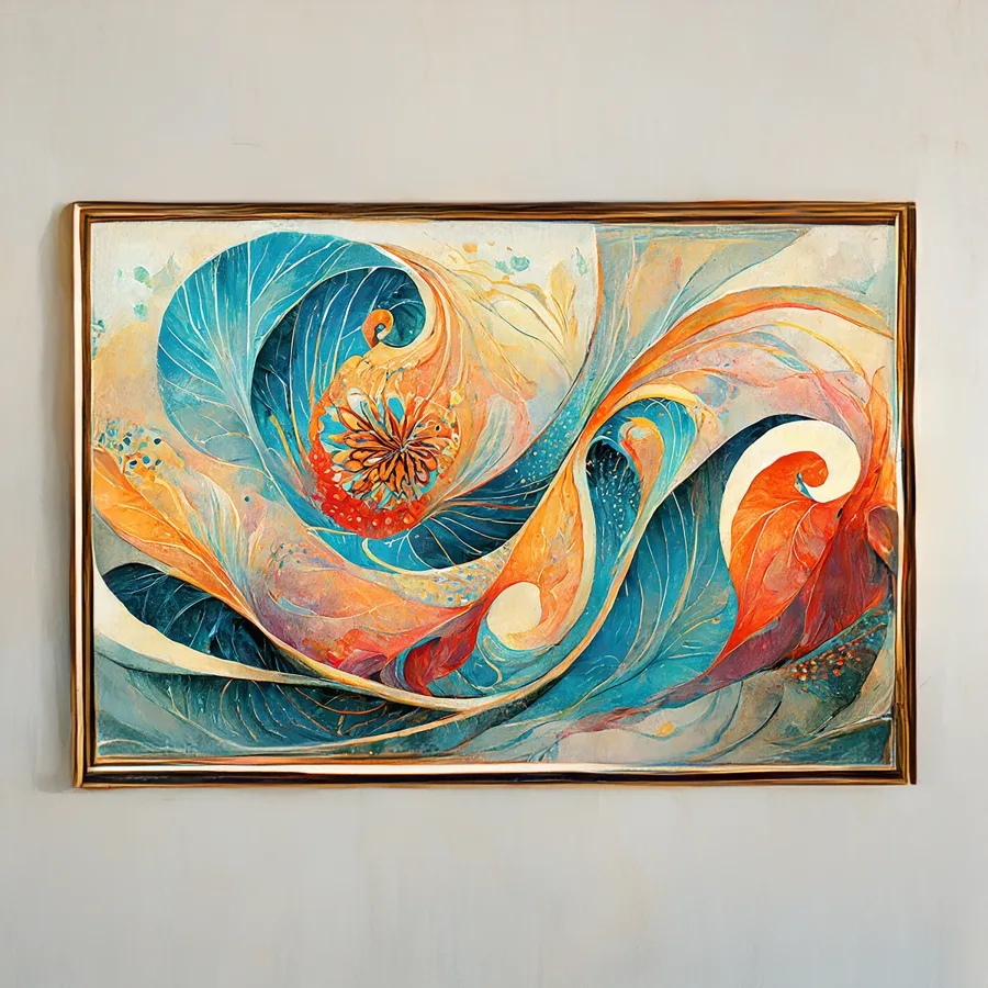 Like a cosmic dance between fire and ice, these swirling teal and coral spirals hypnotically weave together in perfect Fibonacci harmony. This ethereal piece channels major Studio Ghibli-meets-Van Gogh energy, with its dreamy underwater aesthetic and psychedelic sacred geometry that somehow feels both ancient and totally modern. Look, if you need me at 3 AM, I'll be here staring at this like it's a portal to another dimension - and honestly, with those colors, maybe it is.