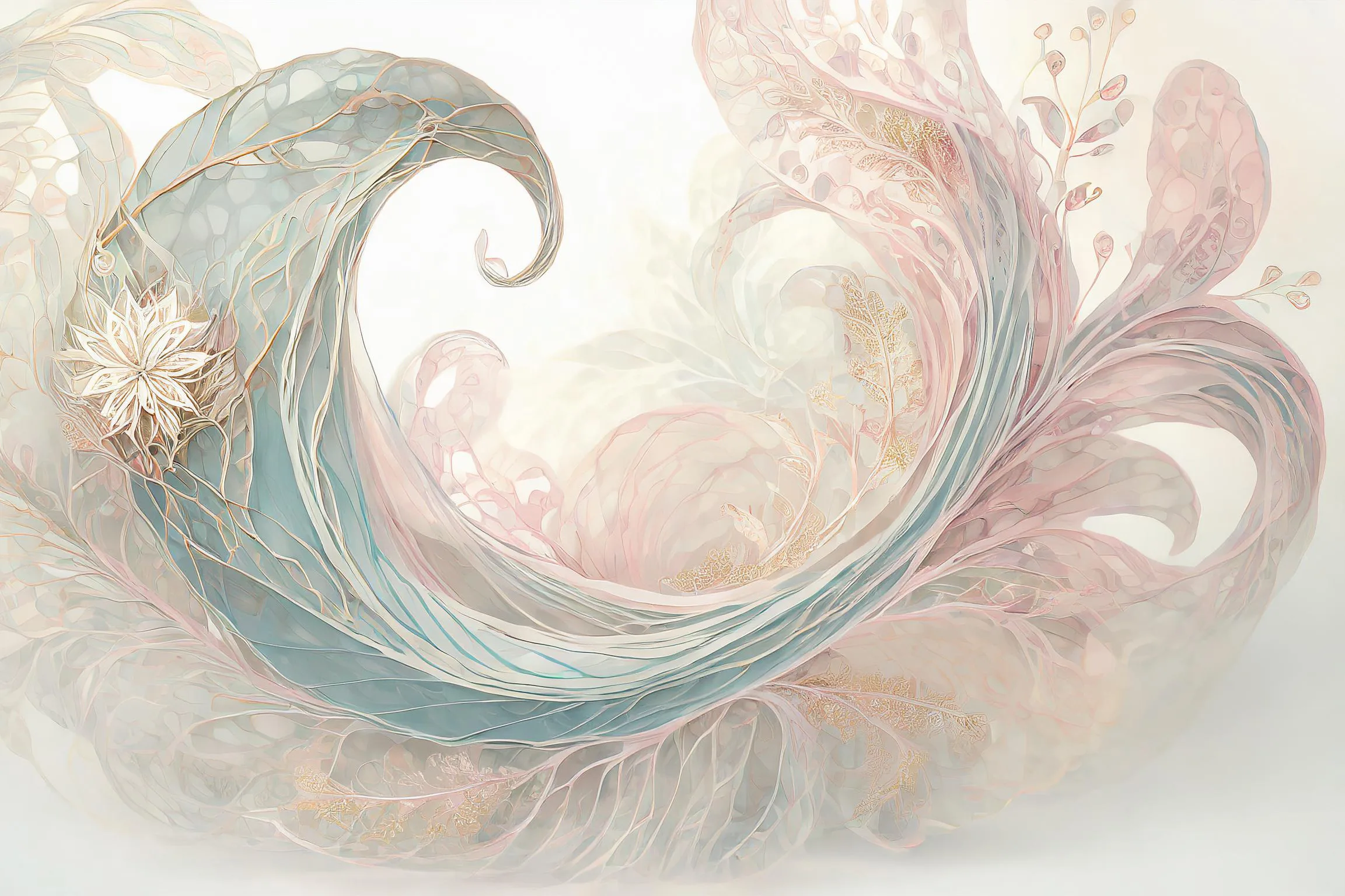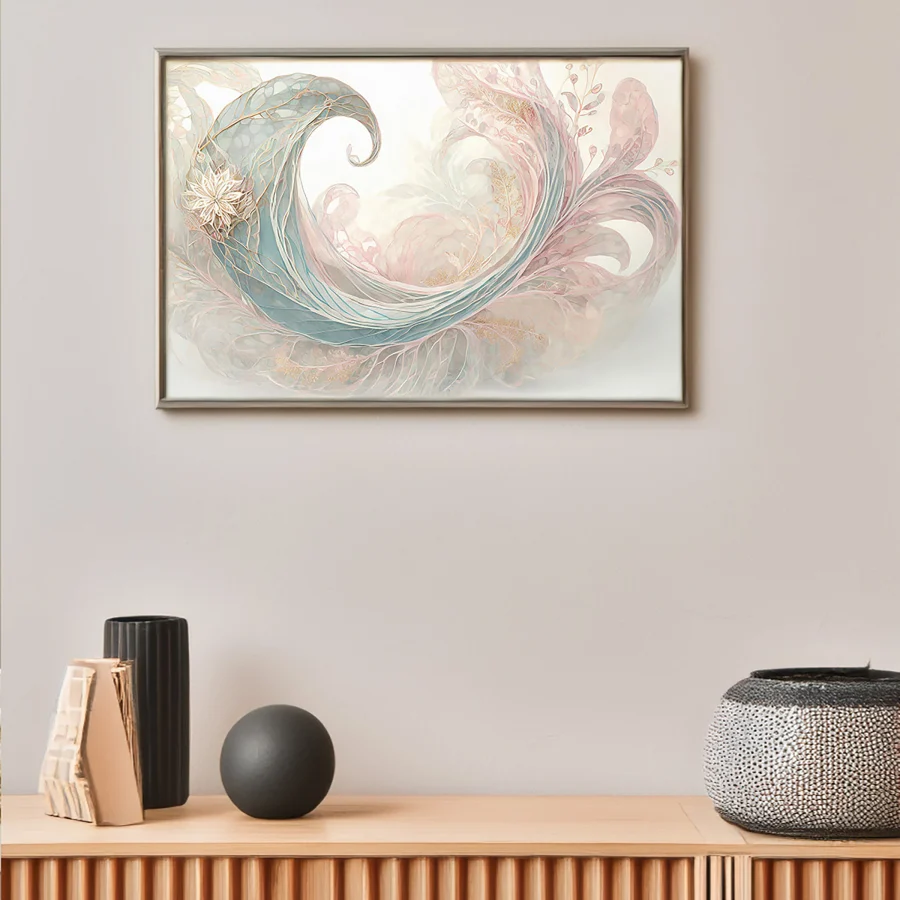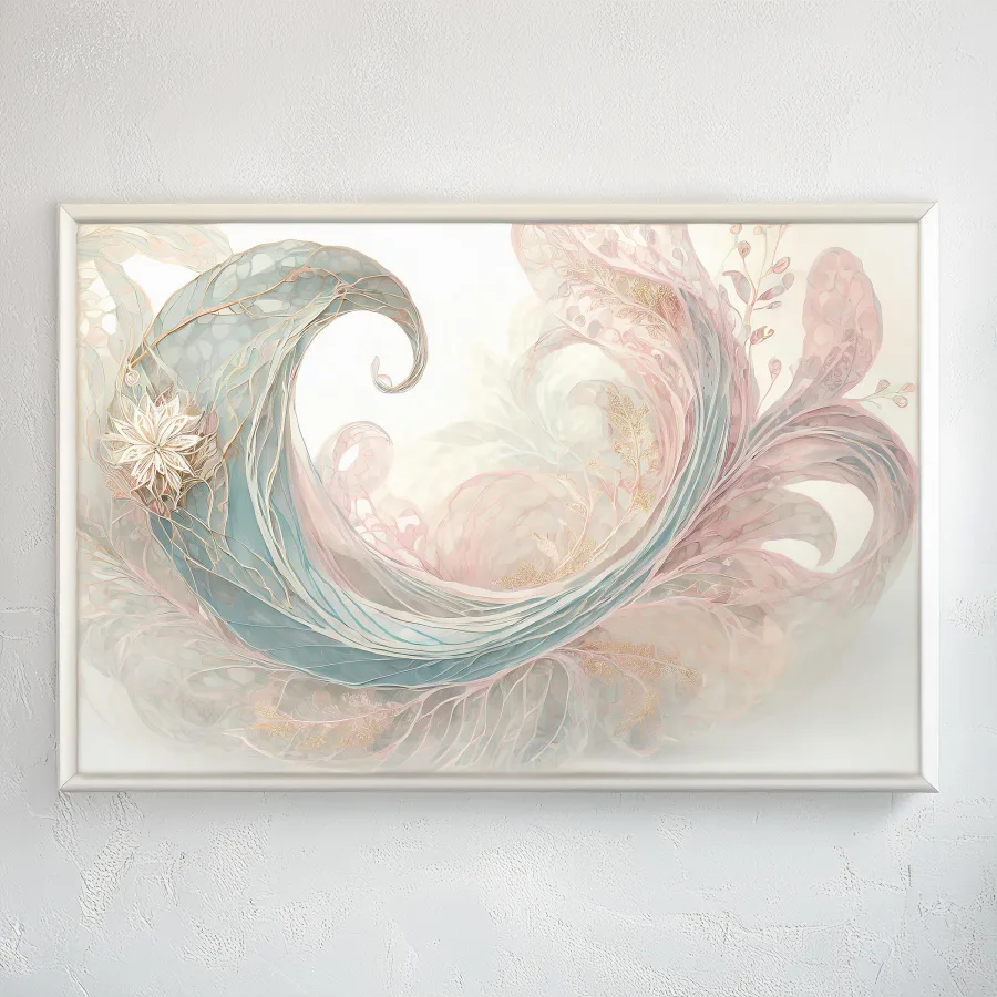 Swirling waves of rose gold and turquoise dance together like some magical underwater ballet that's honestly making me question if I accidentally took NyQuil instead of my morning coffee. The ethereal composition merges delicate digital brushstrokes with crystalline patterns, creating a dreamy abstraction that would make both mermaids and minimalist interior designers weep with joy. Look, if you're not already imagining this as the centerpiece of your meditation room/secret fairy grotto, you need to get on my level of whimsical appreciation right now.