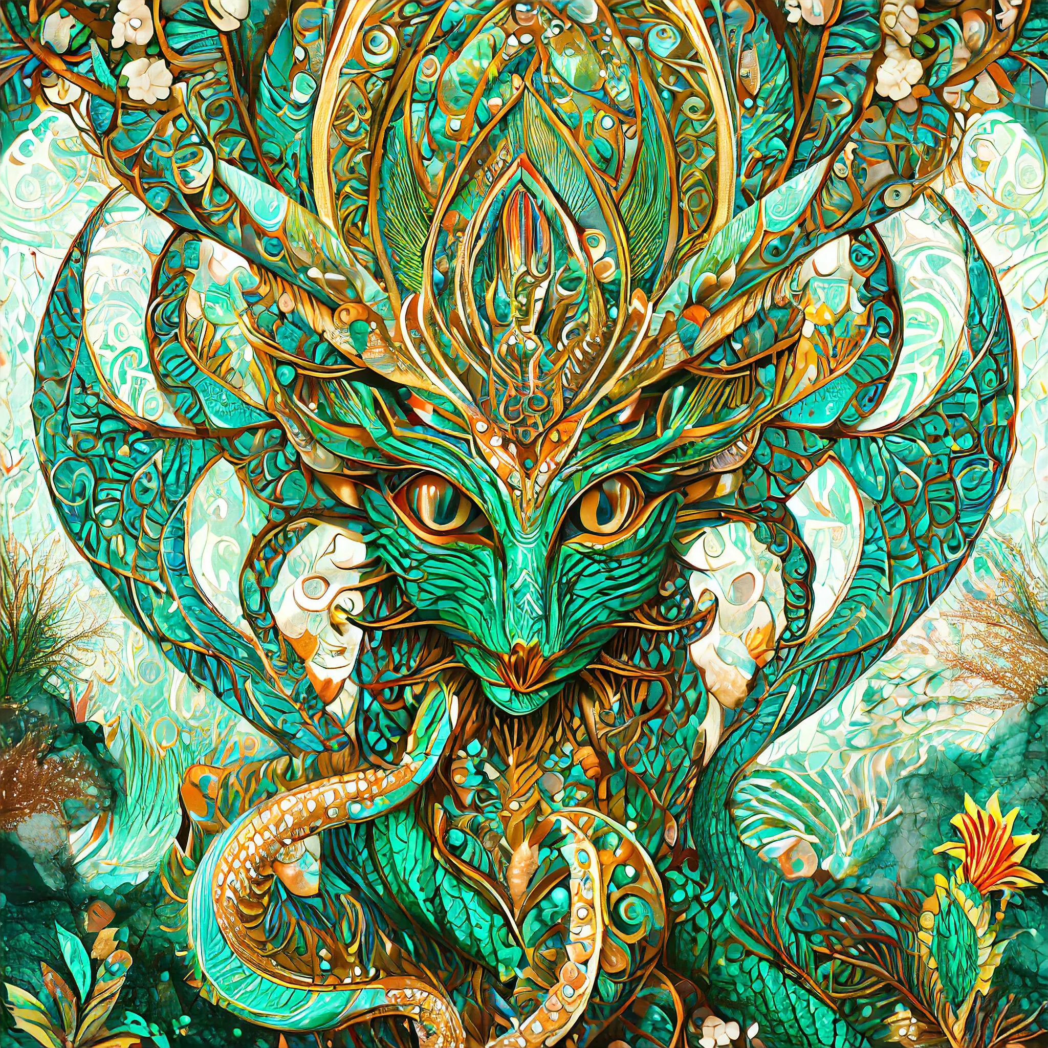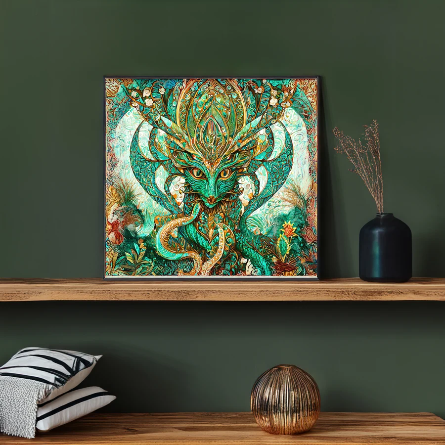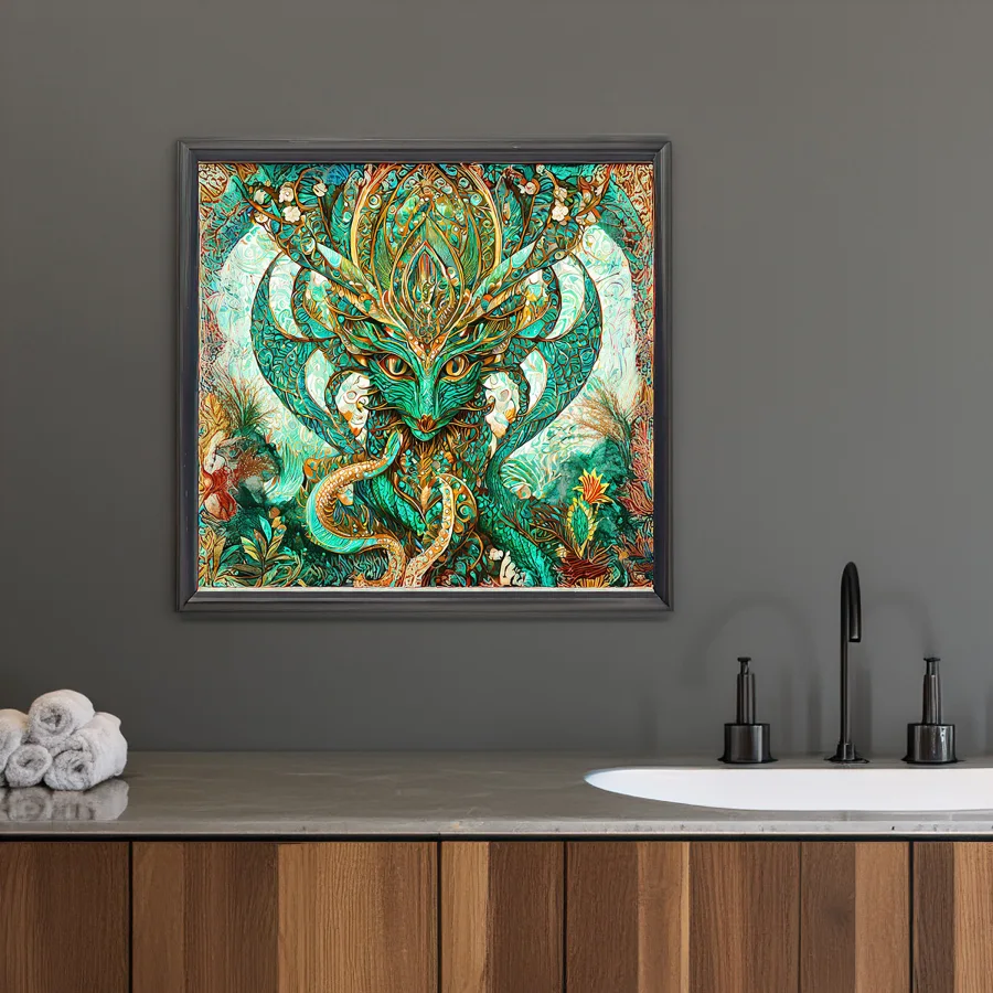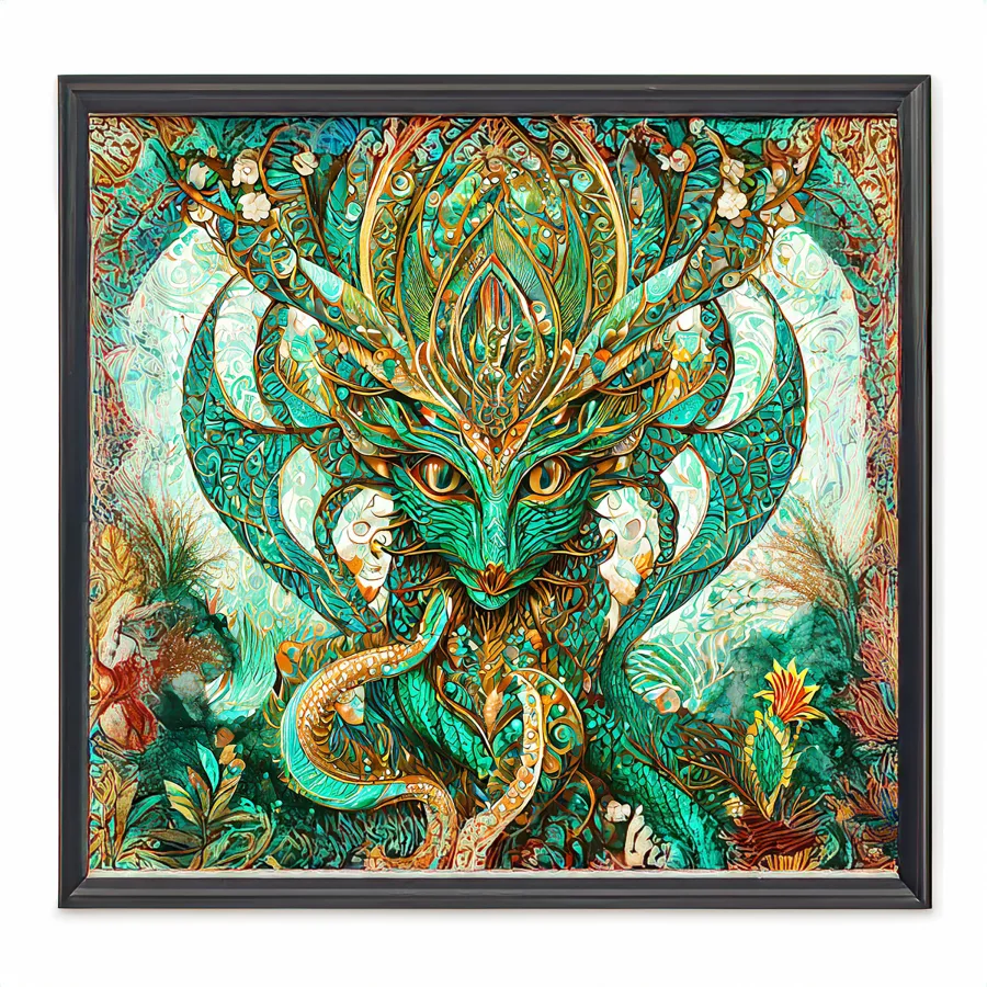 A regal feline deity with piercing turquoise eyes commands attention from her ethereal forest throne, her gaze practically burning through your mortal soul. The psychedelic swirls of emerald and gold intertwine around her form like sacred geometry gone wild, creating this totally Studio-Ghibli-meets-mystic-priestess aesthetic that's honestly kind of breaking my brain right now. Listen, if you're not already planning to hang this over your crystal altar while burning sage and apologizing to your actual cat for not treating them like the deity they clearly are, what are you even doing with your life?