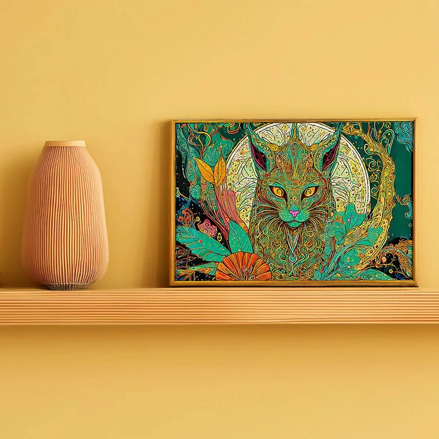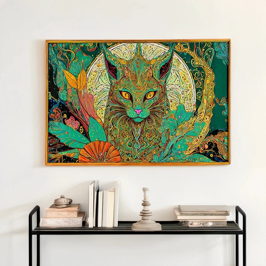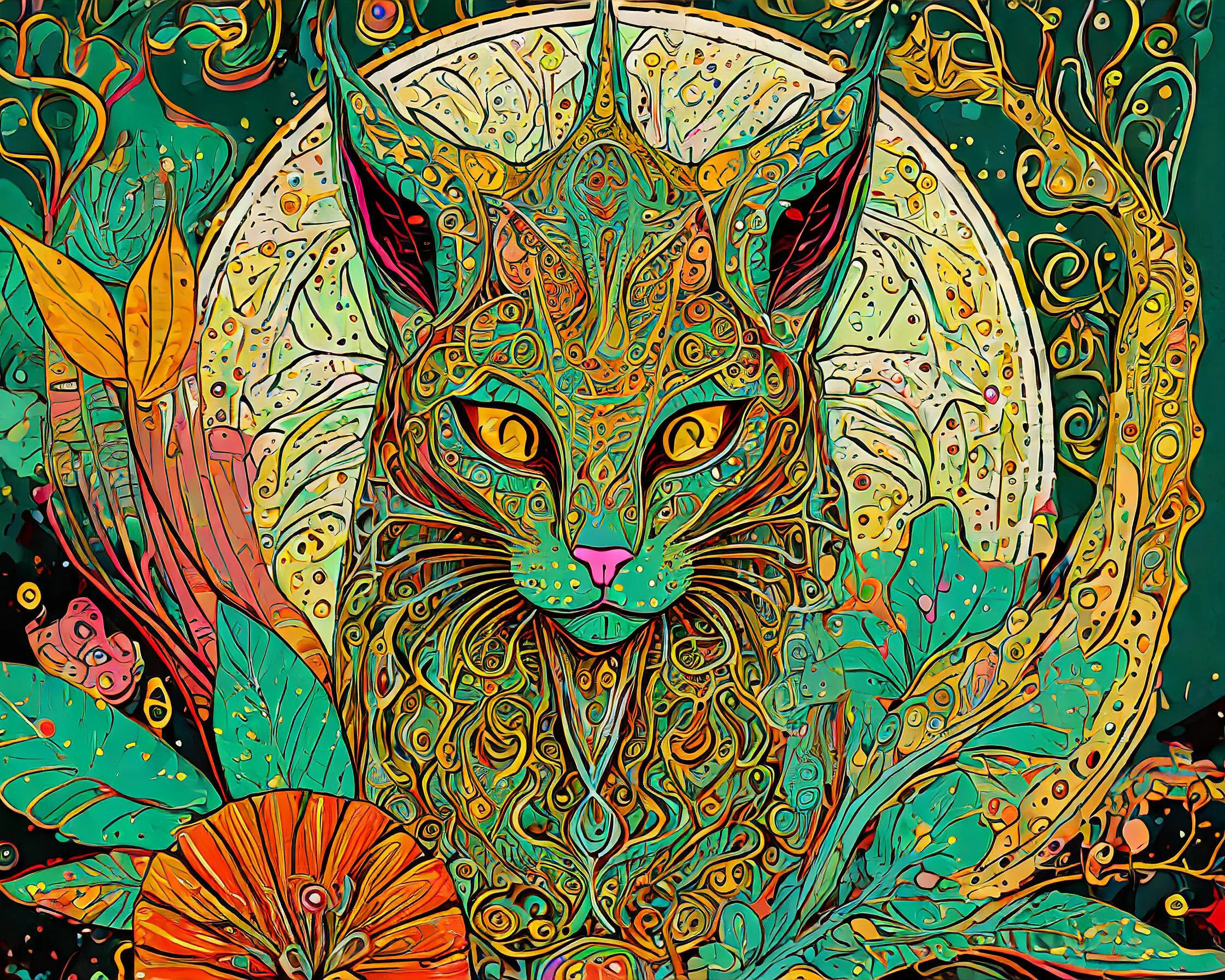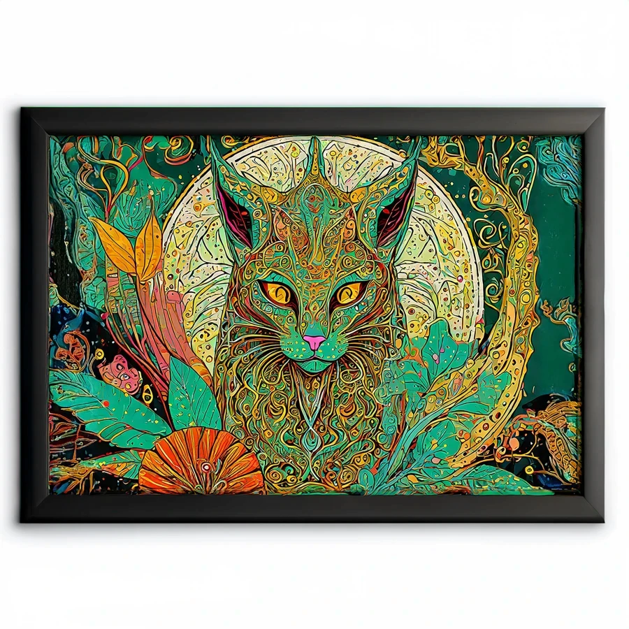 A mystical feline goddess stares directly into your soul with hypnotic golden eyes, adorned with swirling patterns of Celtic knotwork that seem to pulse with otherworldly energy. The psychedelic illustration melds sacred geometry with lush tropical foliage in a stained-glass style, creating a mesmerizing fusion of spiritual and jungle aesthetics that would make even Alice question her Wonderland experiences. Look, I'm not saying this cat art will guide you through your next meditation session, but I am saying your third eye might actually start purring.