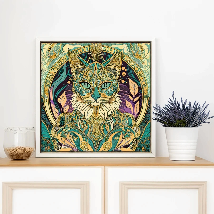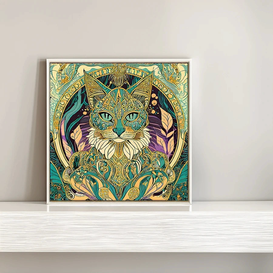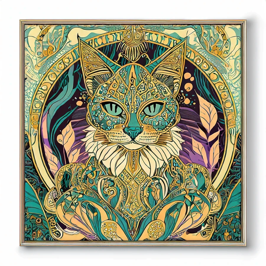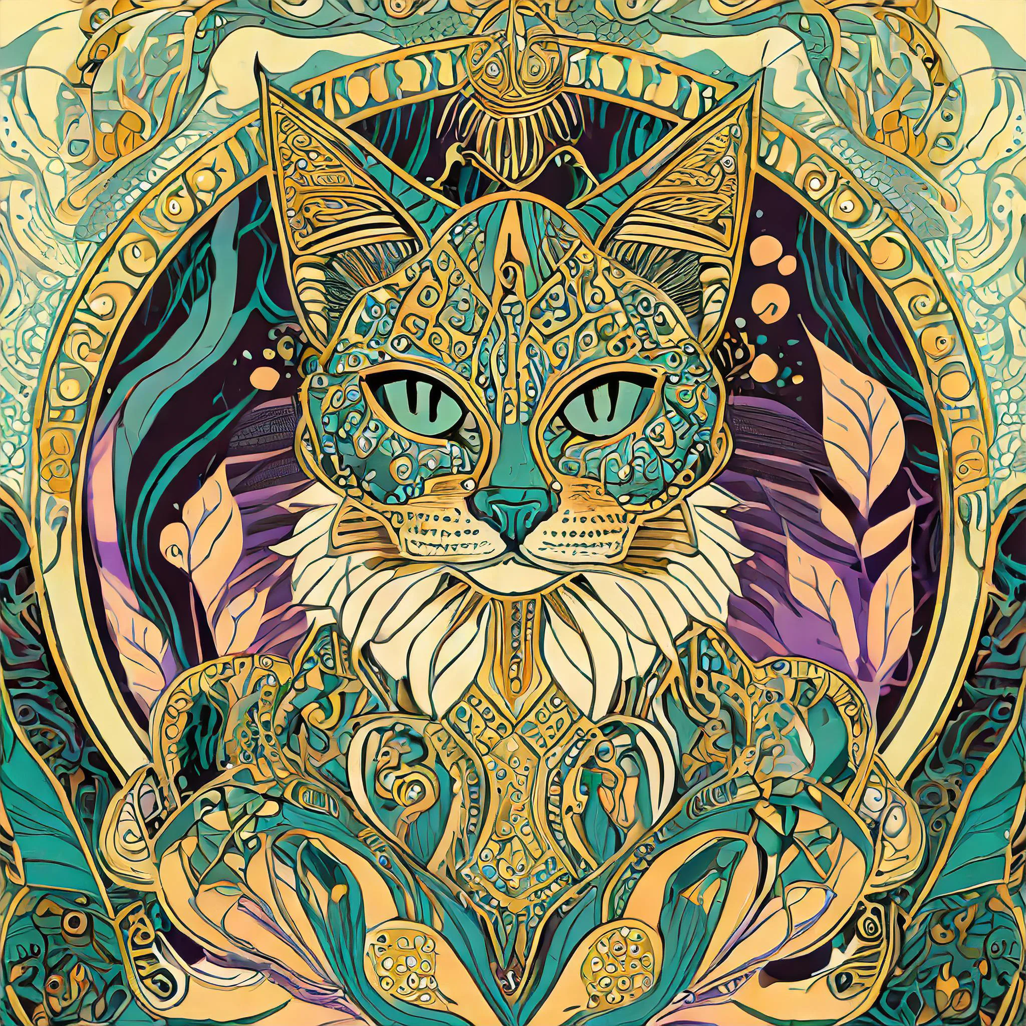 Those haunting feline eyes pierce straight into your soul from within a mesmerizing swirl of art nouveau curves and mystical symbols that would make Alphonse Mucha himself do a double-take. The turquoise and gold color palette weaves through intricate mandala patterns and sacred geometry, creating a perfect fusion of Egyptian goddess energy and psychedelic bohemian vibes. Listen, if you don't immediately make this your phone background or seriously consider getting it tattooed somewhere visible, are you even living your best witchy cat person life?