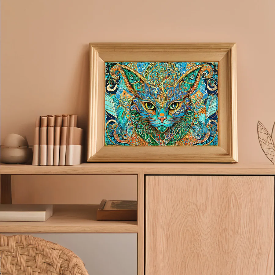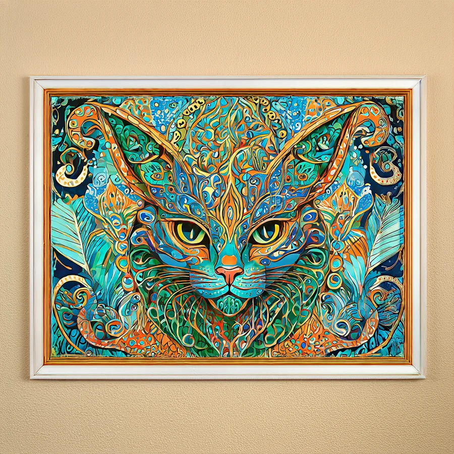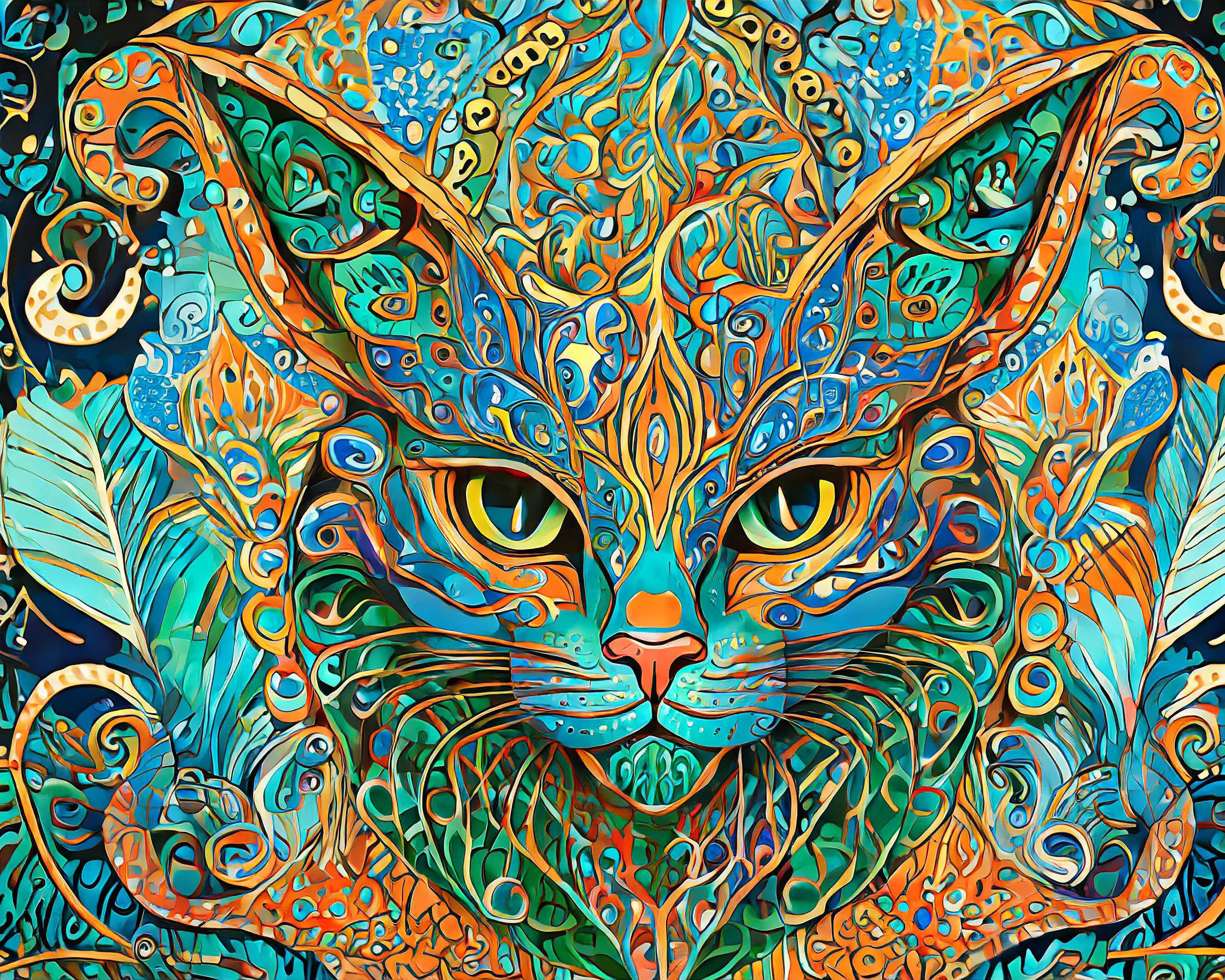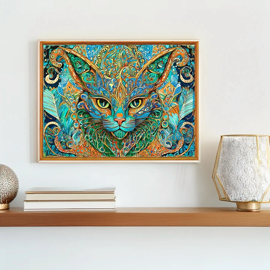 A mesmerizing feline deity floats in space, her hypnotic kaleidoscope eyes boring straight into your mortal soul with ancient wisdom and possibly judgment. The swirling mandala patterns in electric turquoise and blazing orange transform this cosmic cat into a portal of sacred geometry that would make the Cheshire Cat question his reality. Listen, if you're not already ordering this for your meditation room while burning sage and consulting your crystals, you're clearly not living your best interdimensional cat lady life.