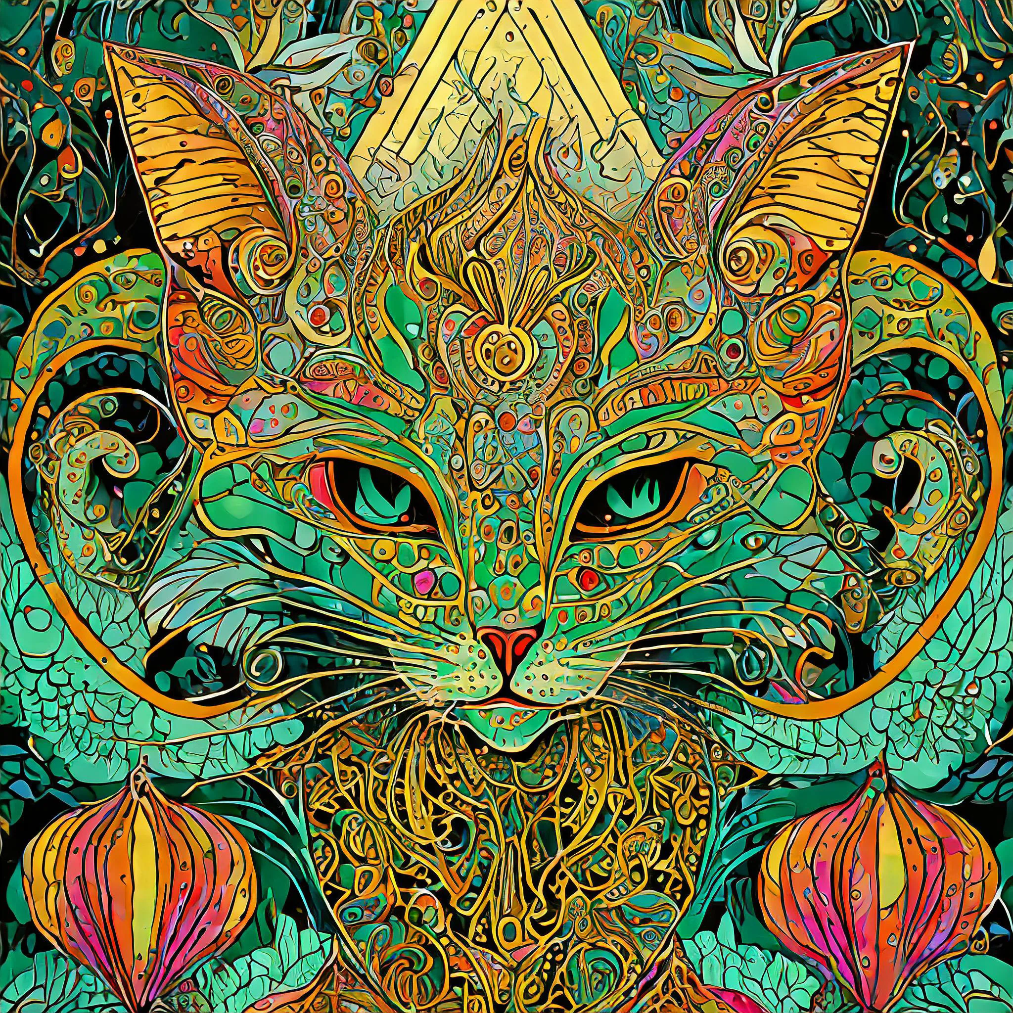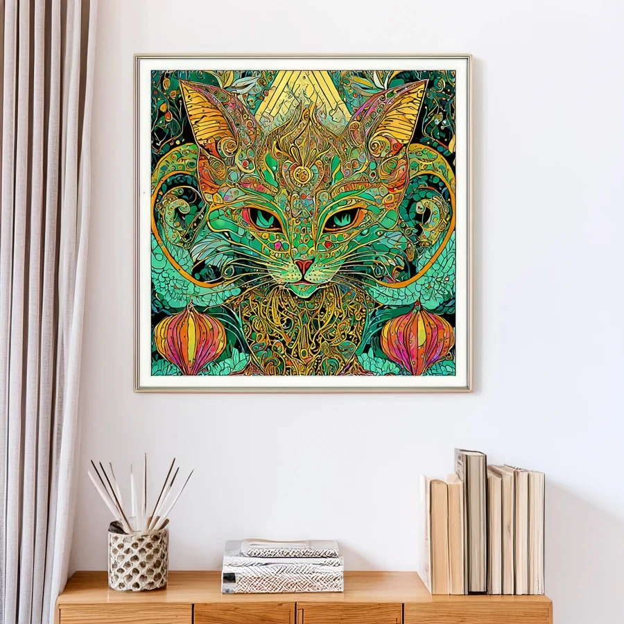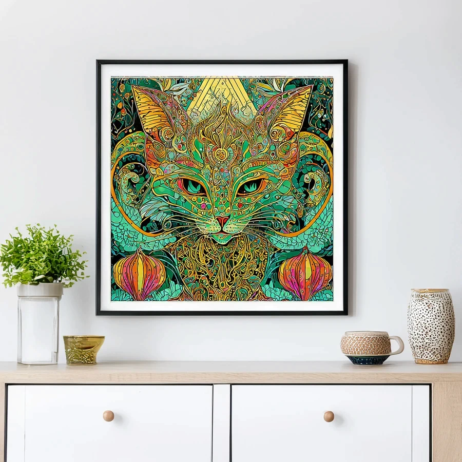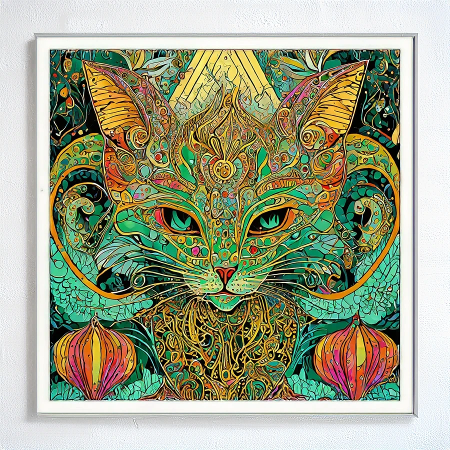 The piercing emerald eyes of this mystical feline deity seem to stare straight through the veil between worlds, glowing with ancient wisdom against a kaleidoscopic backdrop of jade and gold sacred geometry. Like a fever dream mashup of Egyptian cat goddesses and that time you ate suspicious mushrooms at a spiritual retreat, the stained-glass style artwork pulses with ethereal energy and boho-witch vibes. If you're not already clearing space on your meditation room wall while burning sage and apologizing to your actual cat for never realizing they were a cosmic being, you're doing it wrong.
