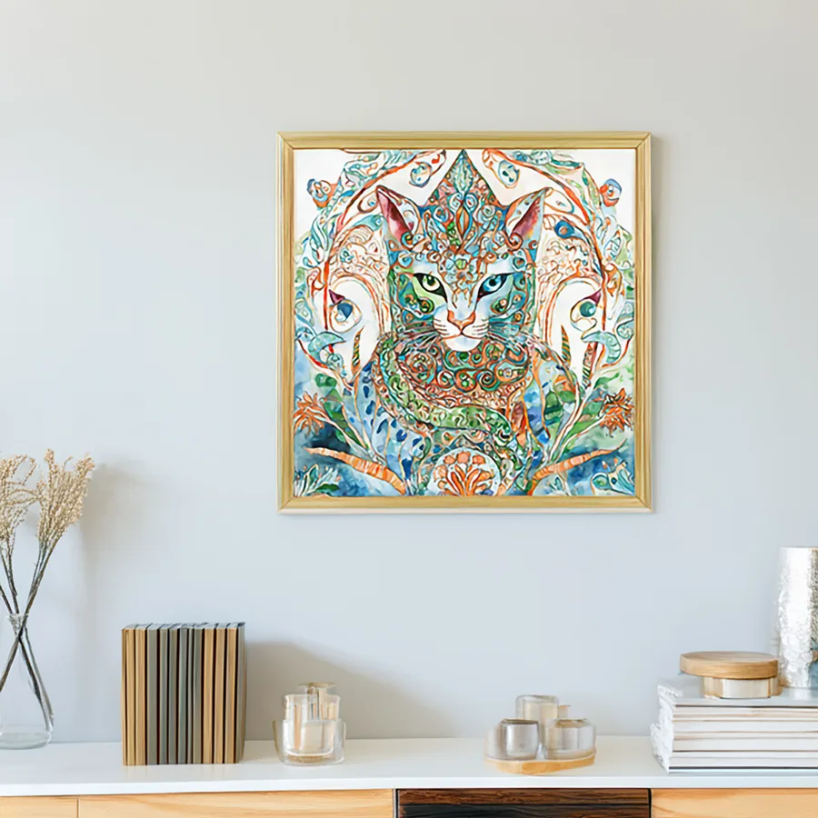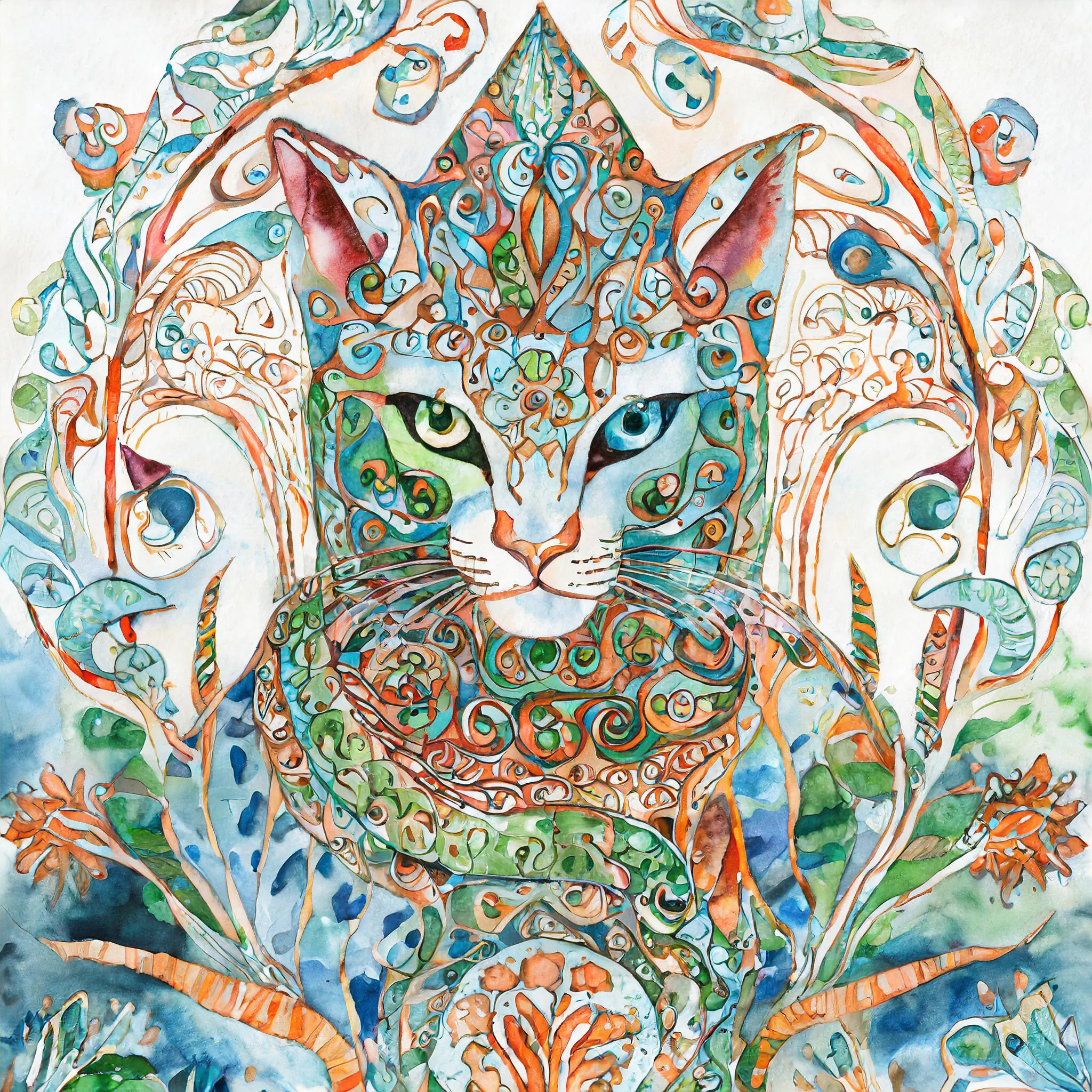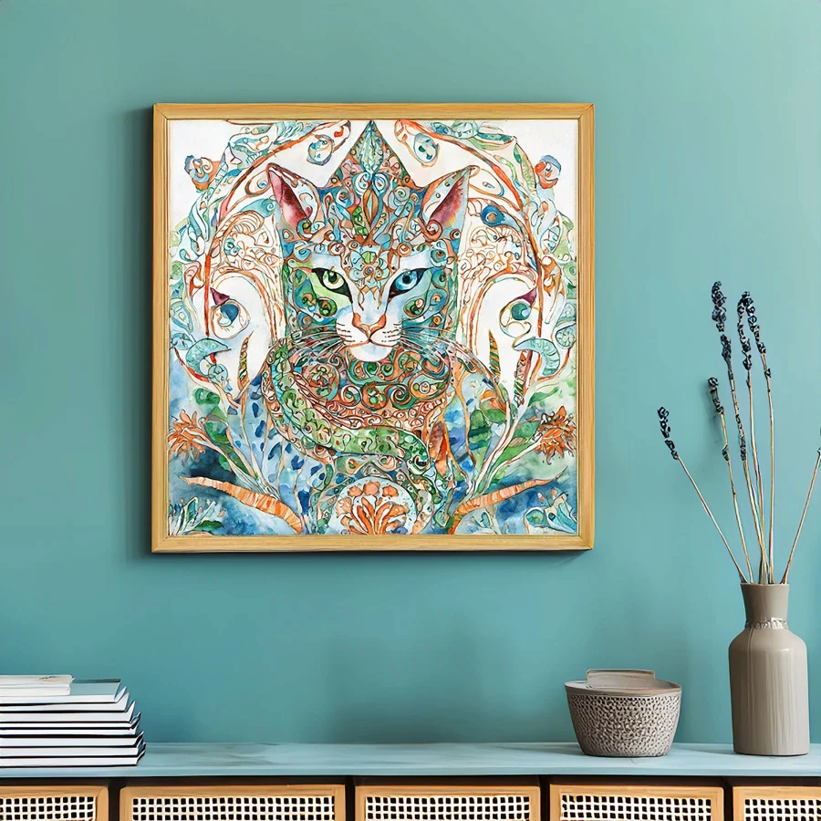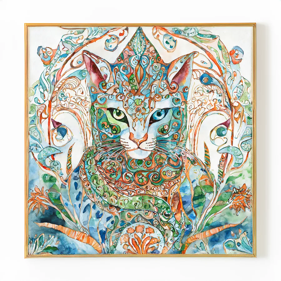 A mesmerizing feline peers through kaleidoscopic eyes that seem to hold the secrets of multiple dimensions, surrounded by intricate swirls of turquoise and coral that dance across the ethereal watercolor composition. This mystical cat channels both Celtic wisdom and Alice in Wonderland whimsy, with ornate mandala patterns flowing through its fur like visual poetry set to the rhythm of the cosmos. Look, if you're not already planning to mount this spiritual familiar above your meditation altar while burning sage and contemplating the infinite wisdom of cat-kind, you're honestly doing it wrong.