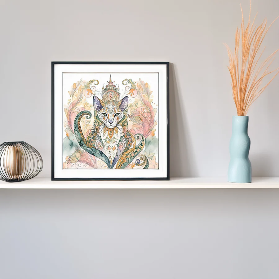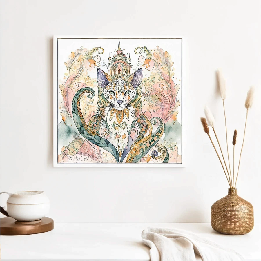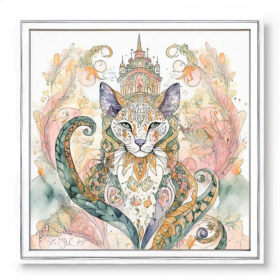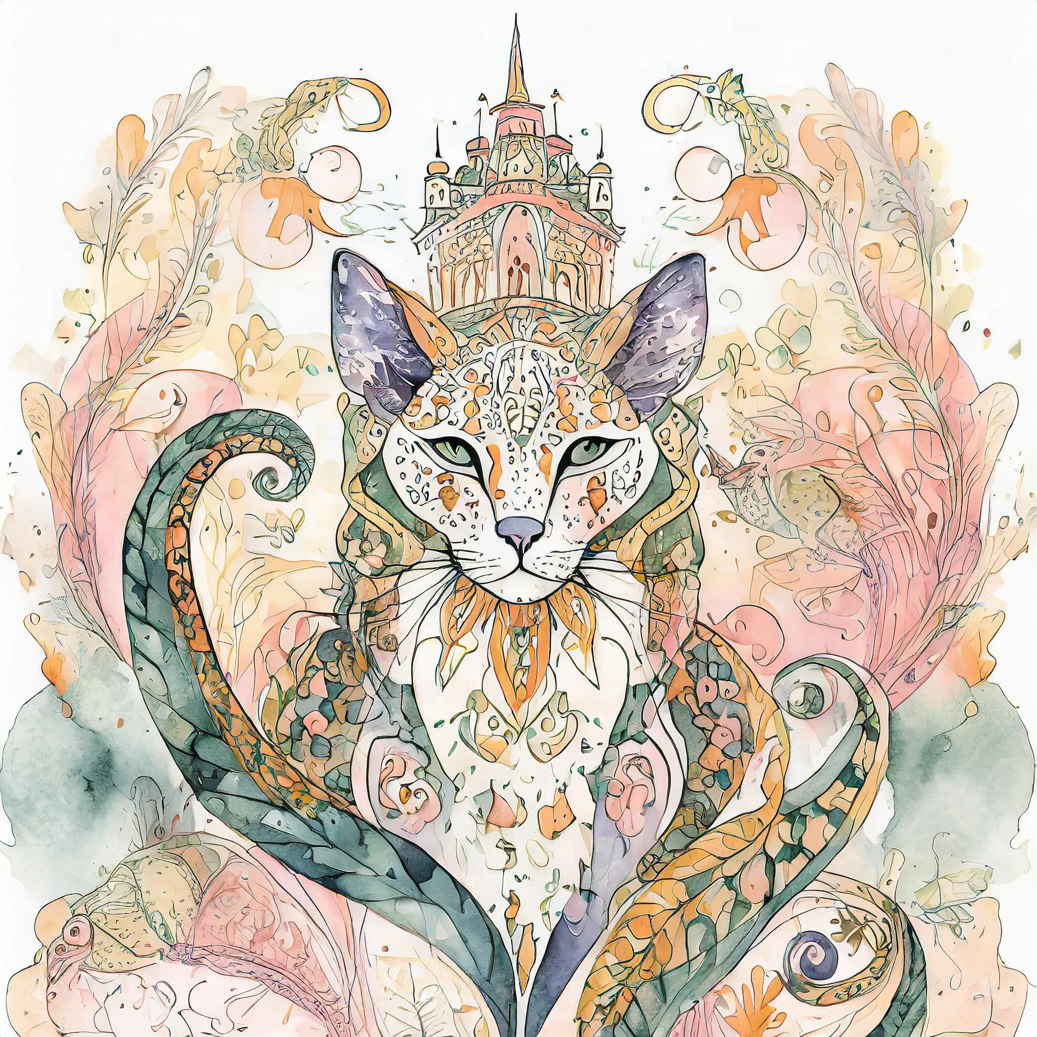A majestic feline guardian perches atop crystalline castle spires, its knowing golden eyes and ethereal whiskers seeming to hold ancient secrets of the cosmos. The delicate watercolor technique creates a dreamy pastel wonderland where each brushstroke flows like liquid magic, channeling serious Studio Ghibli-meets-cottagecore energy that would make Miyazaki himself purr with approval. Listen, if you don't immediately want to shrink yourself down and live in this whimsical cat-ruled kingdom while wearing a tiny crown, we probably can't be friends.