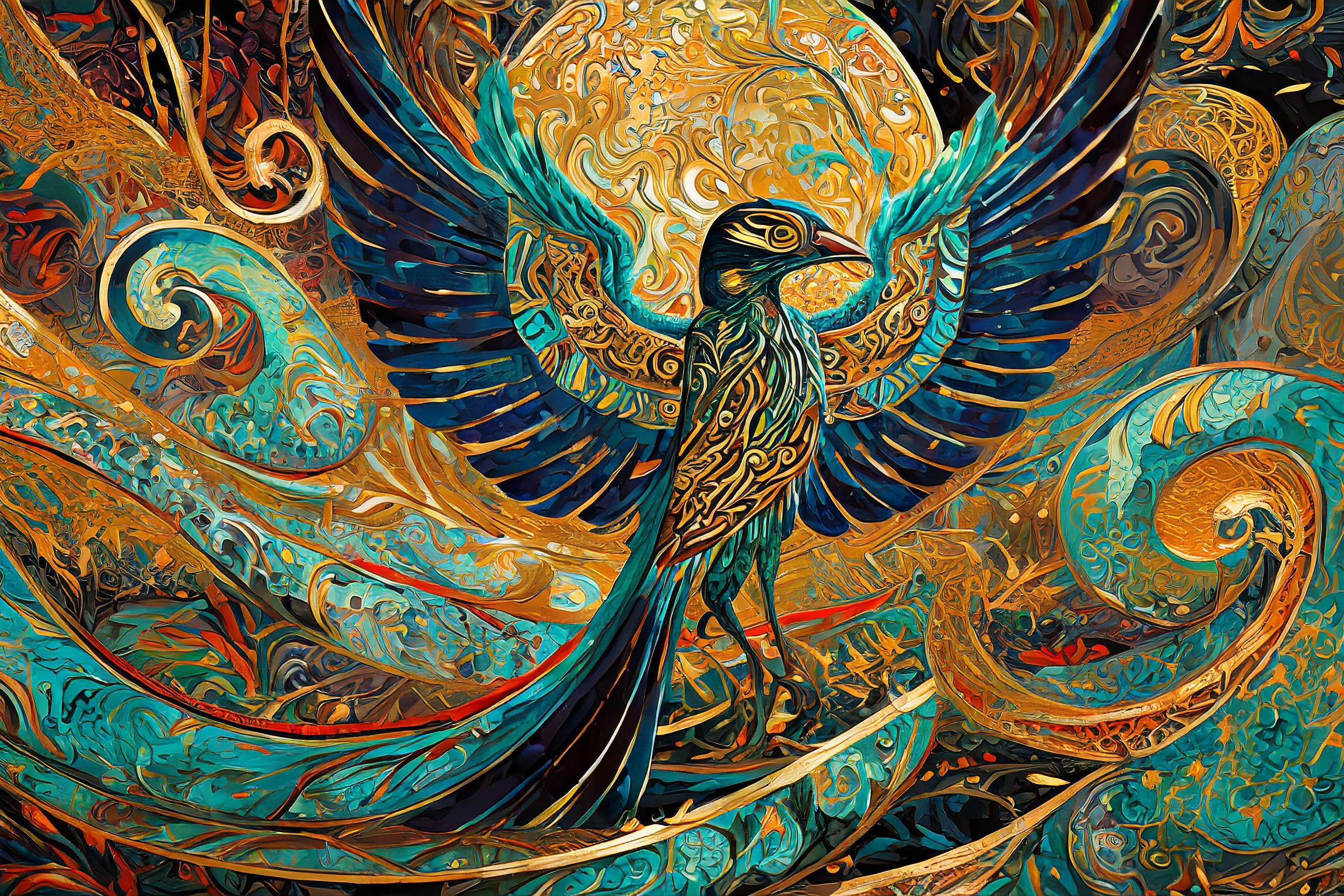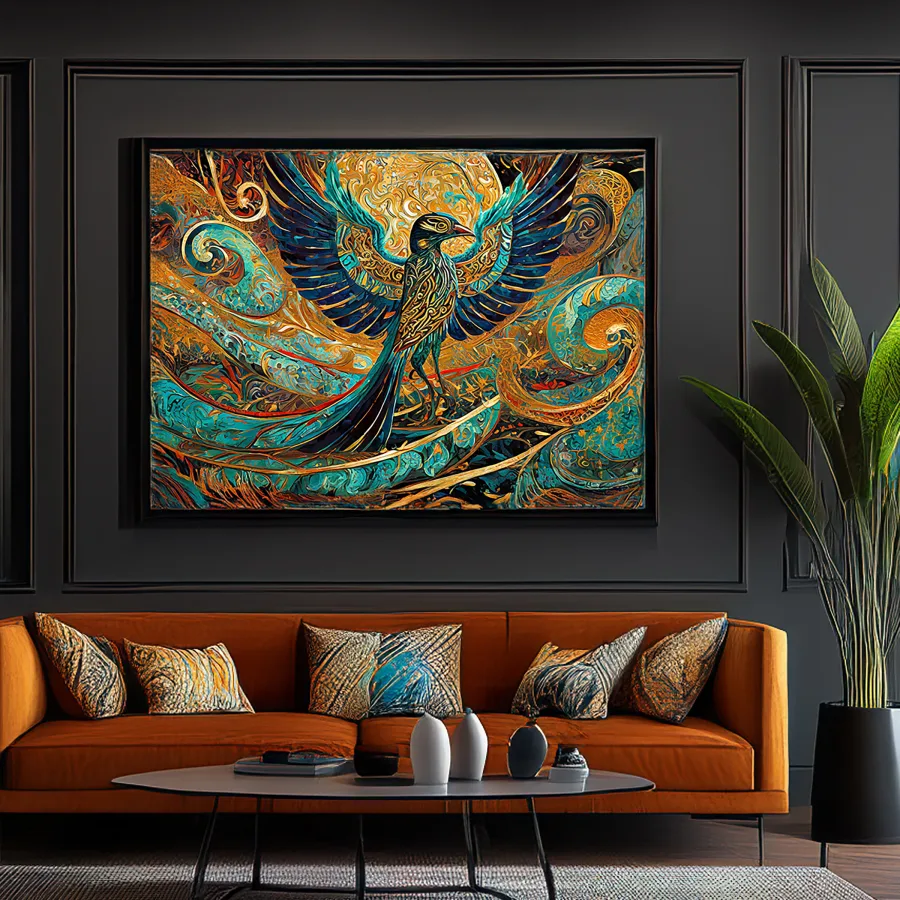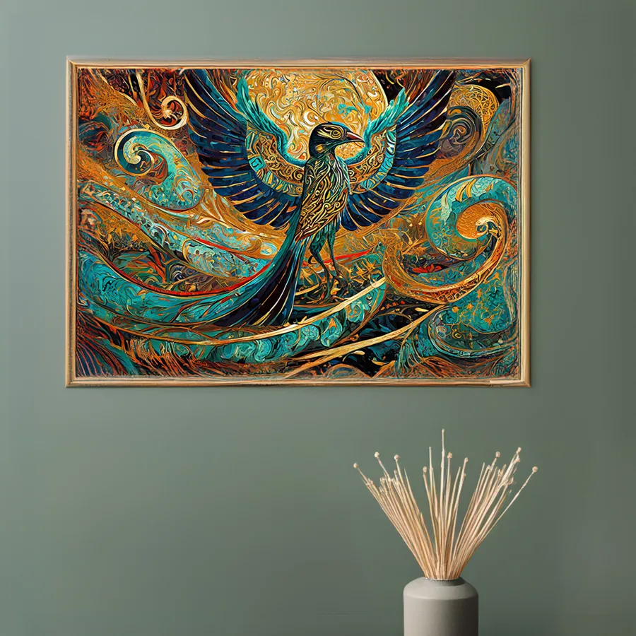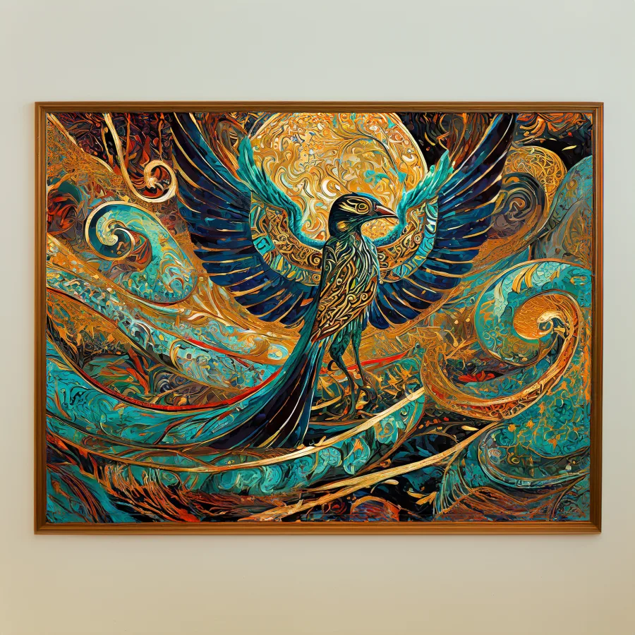 A magnificent phoenix erupts from the canvas in an explosion of molten gold and shimmering turquoise, its feathers rippling with hypnotic Aztec-inspired patterns that seem to pulse with their own inner light. The seamless fusion of Art Nouveau flourishes and ancient mystical symbolism creates a transcendent aesthetic that's somehow both grounding and absolutely trippy at the same time. Look, I know you're probably not actually going through a spiritual awakening right now, but staring at this bird while burning your third palo santo stick of the day might just get you there.