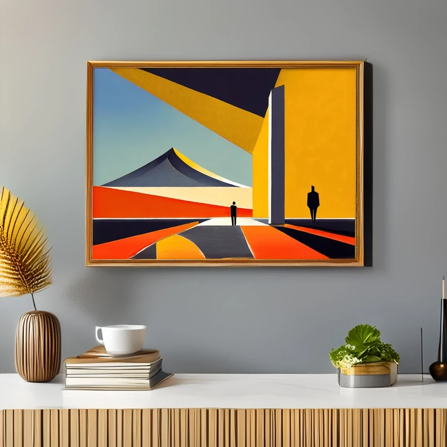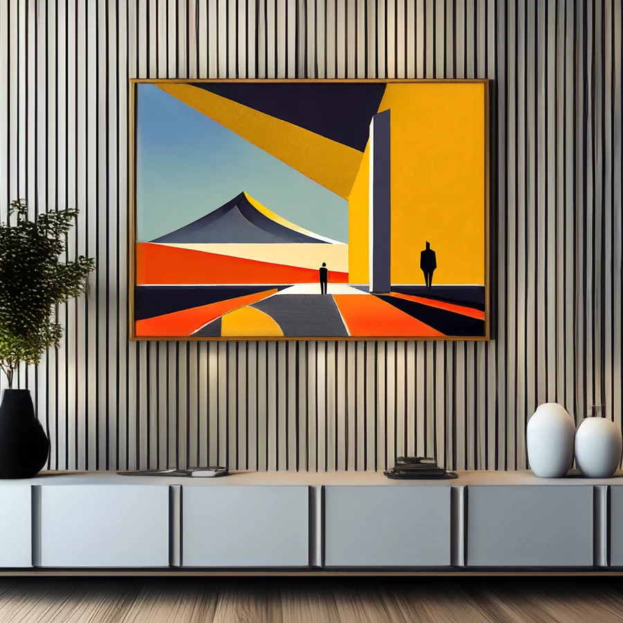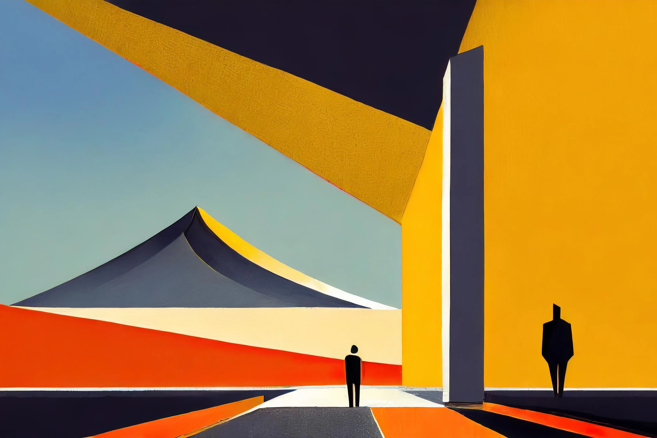 A solitary figure stands dwarfed by towering geometric planes of muted pastels and stark shadows, creating an almost suffocating sense of beautiful isolation. The piece masterfully blends Bauhaus-inspired minimalism with contemporary digital art techniques, turning architectural elements into an eerily satisfying abstract dreamscape. If you've ever felt like you're the only person awake at 3 AM in an empty office building while questioning your life choices, this is basically your soul in art form.