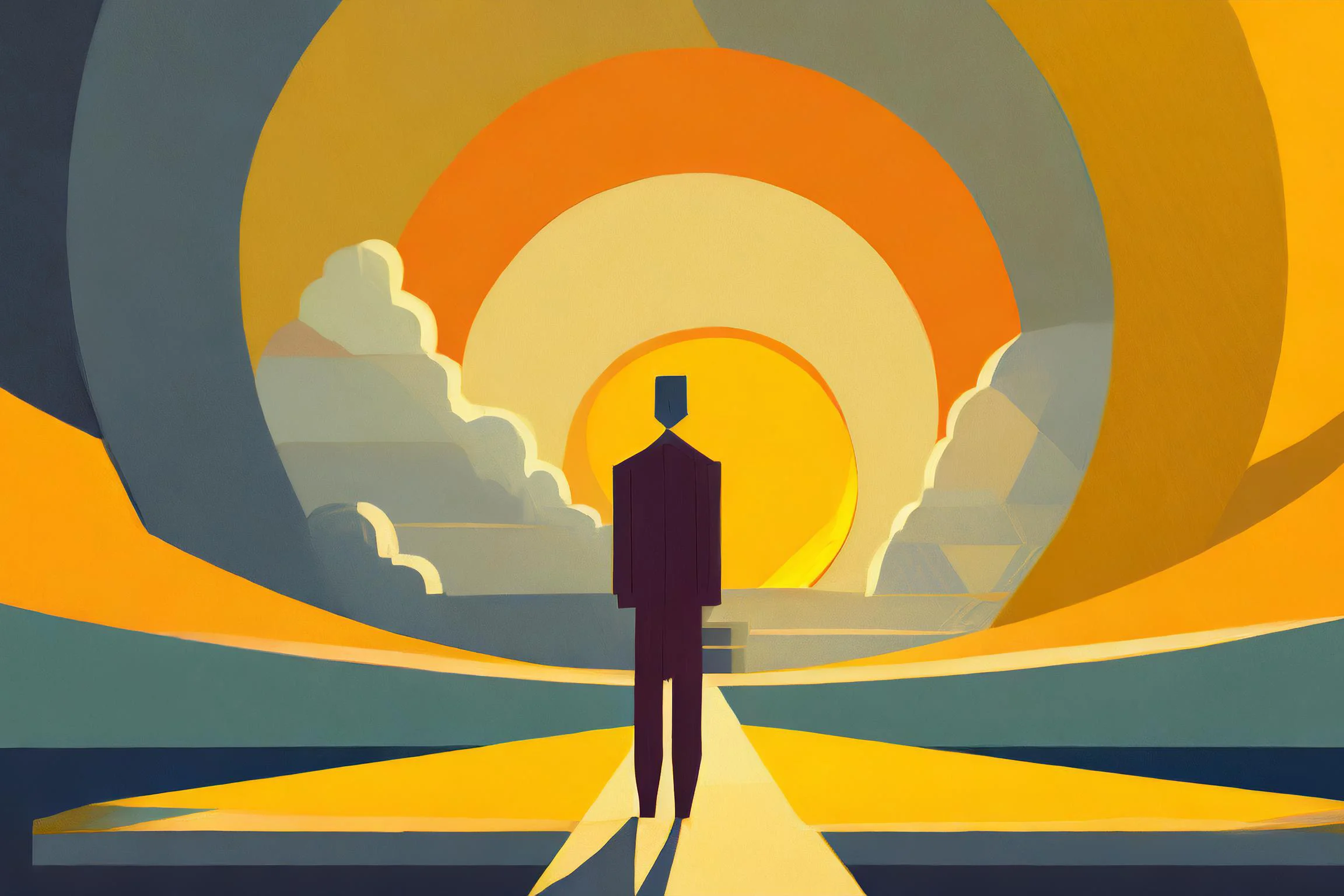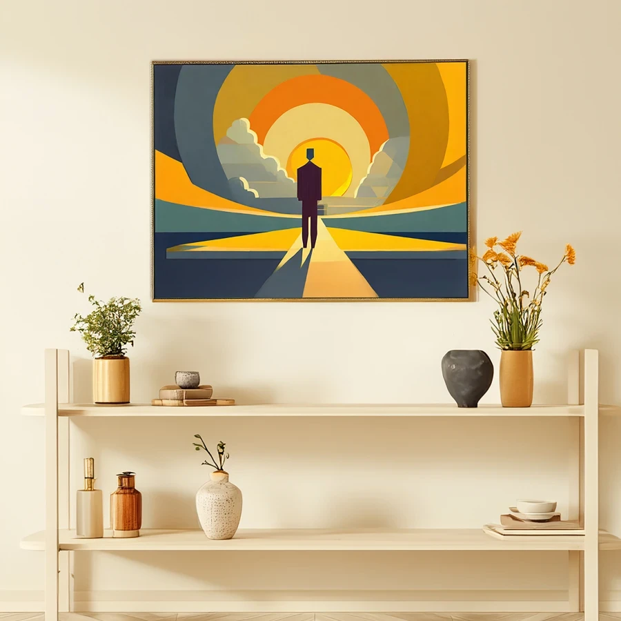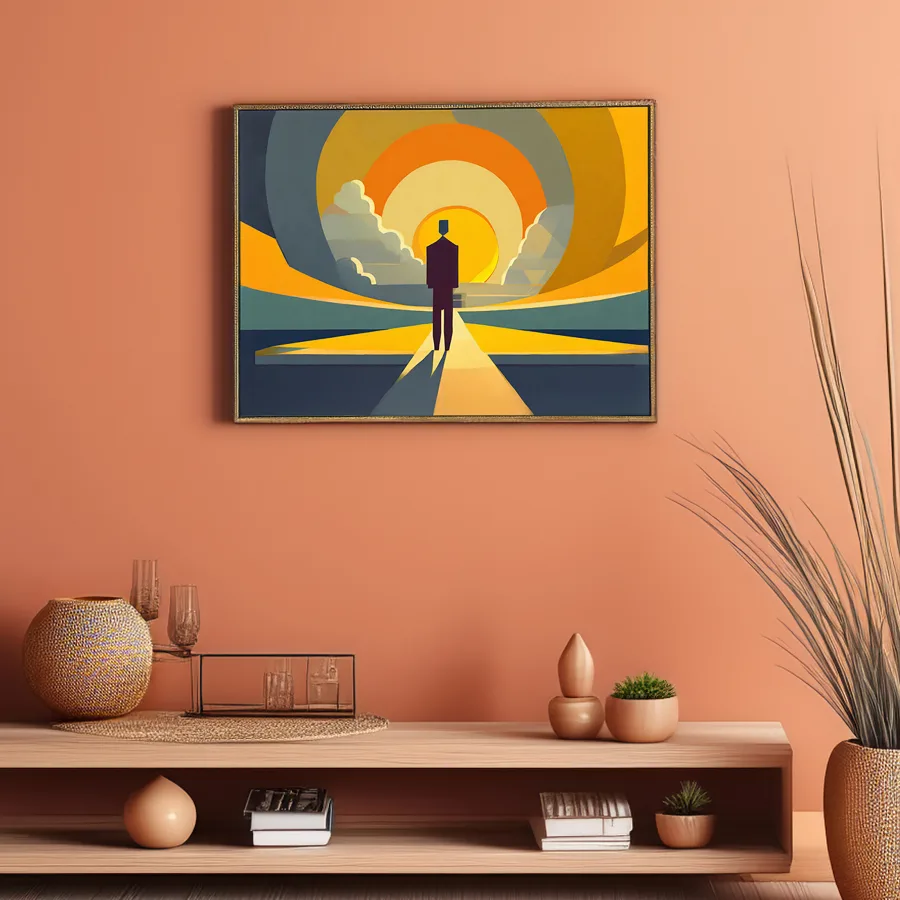 A solitary silhouette stands defiantly against a perfectly bisected geometric sunset, where crisp Art Deco lines slice through gradients of electric blue and molten gold. The piece masterfully blends retro-futuristic minimalism with liminal space vibes, creating that weird feeling you get when you're alone in an empty office building at dusk. Look, if you need something to stare at during your 3 PM existential crisis that makes you feel both infinitely small and weirdly empowered, this is probably your jam.