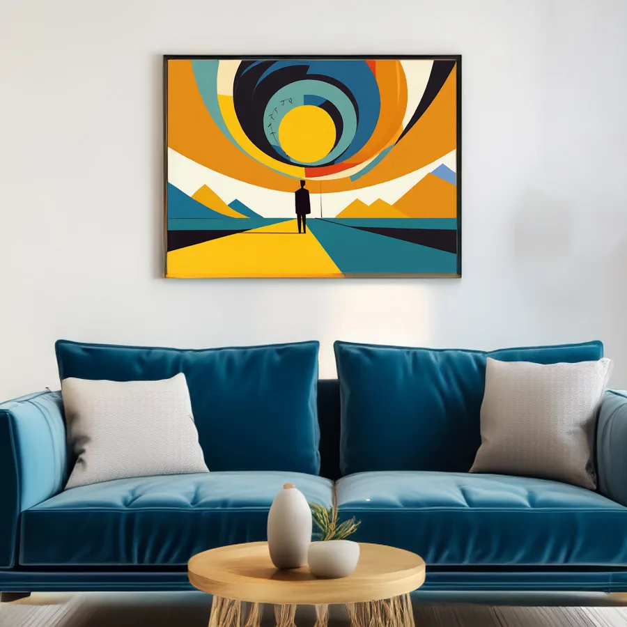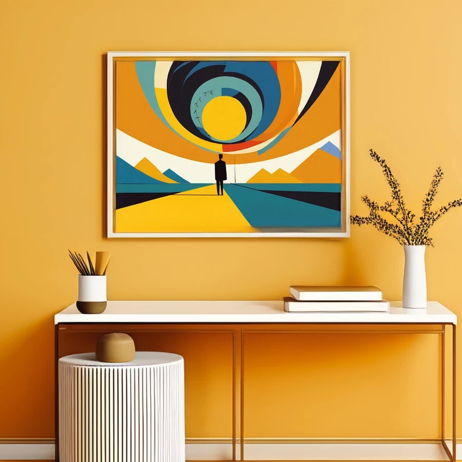 A solitary figure stands dwarfed by a hypnotic spiral sun that pulses with retro oranges and magentas against a geometric horizon. The minimalist composition channels pure 2001: Space Odyssey meets Mid-Century Modern vibes, with clean lines carving the landscape into meditative shapes that would make Kubrick proud. Look, if you're trying to convince your coworkers you're a deep, contemplative soul during Zoom meetings, this trippy bad boy is definitely the backdrop you need.