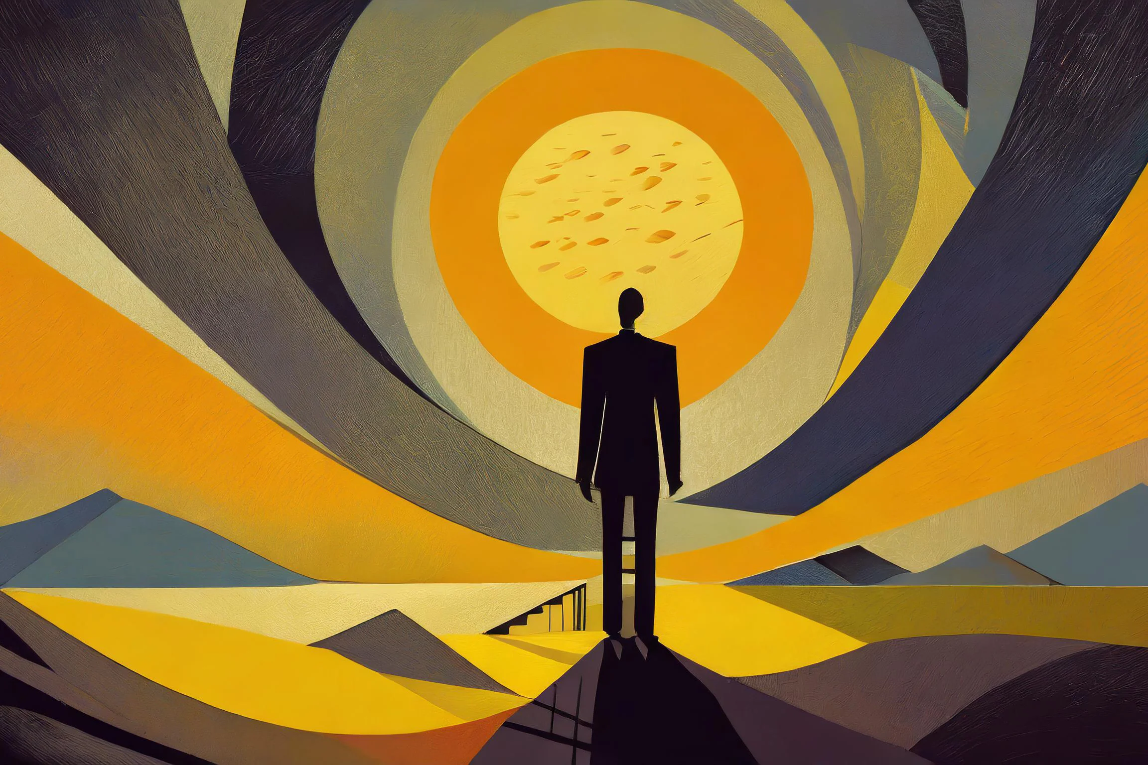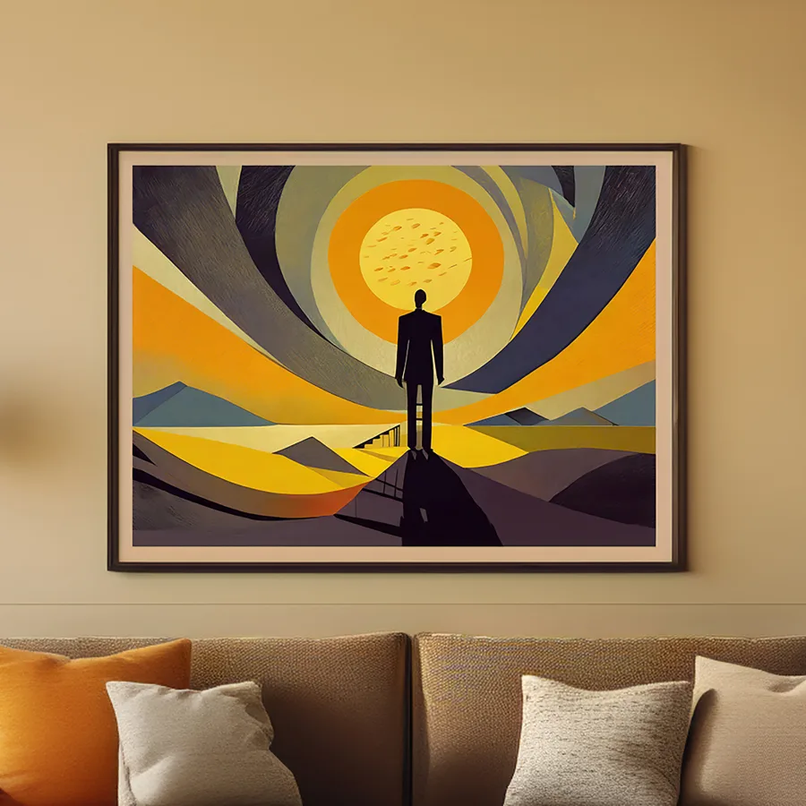 A stark yellow orb hovers menacingly over razor-sharp geometric planes, like an all-seeing eye that's definitely judging your life choices. The piece masterfully blends minimalist design with existential dread, using a restricted palette of industrial greys and retro-future yellows that would make Stanley Kubrick nod in approval. Perfect for that empty wall in your startup's meditation room where developers go to question their existence and pretend they're not having anxiety attacks about their next product launch.