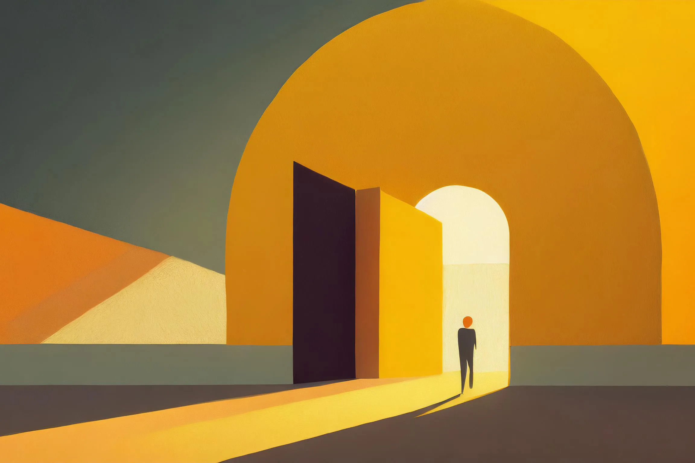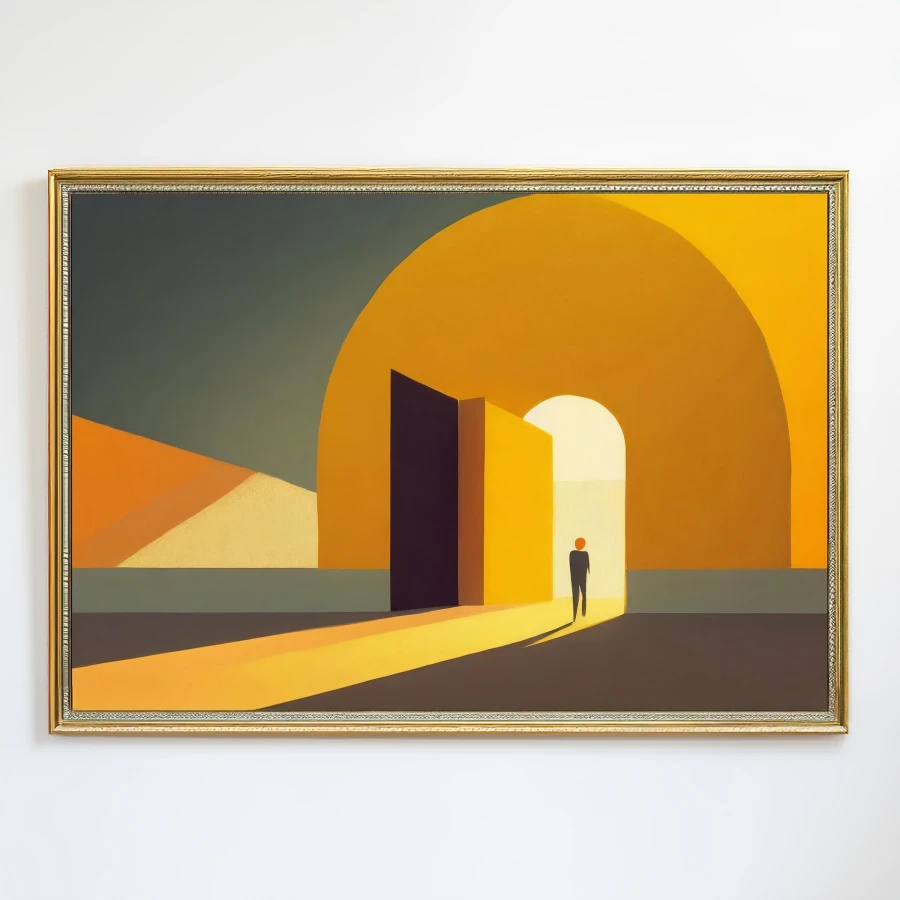A towering golden doorway commands attention against an impossibly stark void, its frame casting dramatic shadows that stretch like fingers into nothingness. The minimalist architectural design channels pure Kubrick-meets-meditation-room energy, where every crisp line and gradient feels both mathematically precise and deeply spiritual. Listen, if you don't feel an overwhelming urge to step through this portal into whatever alternate dimension lies beyond, you might want to check your pulse - just saying.