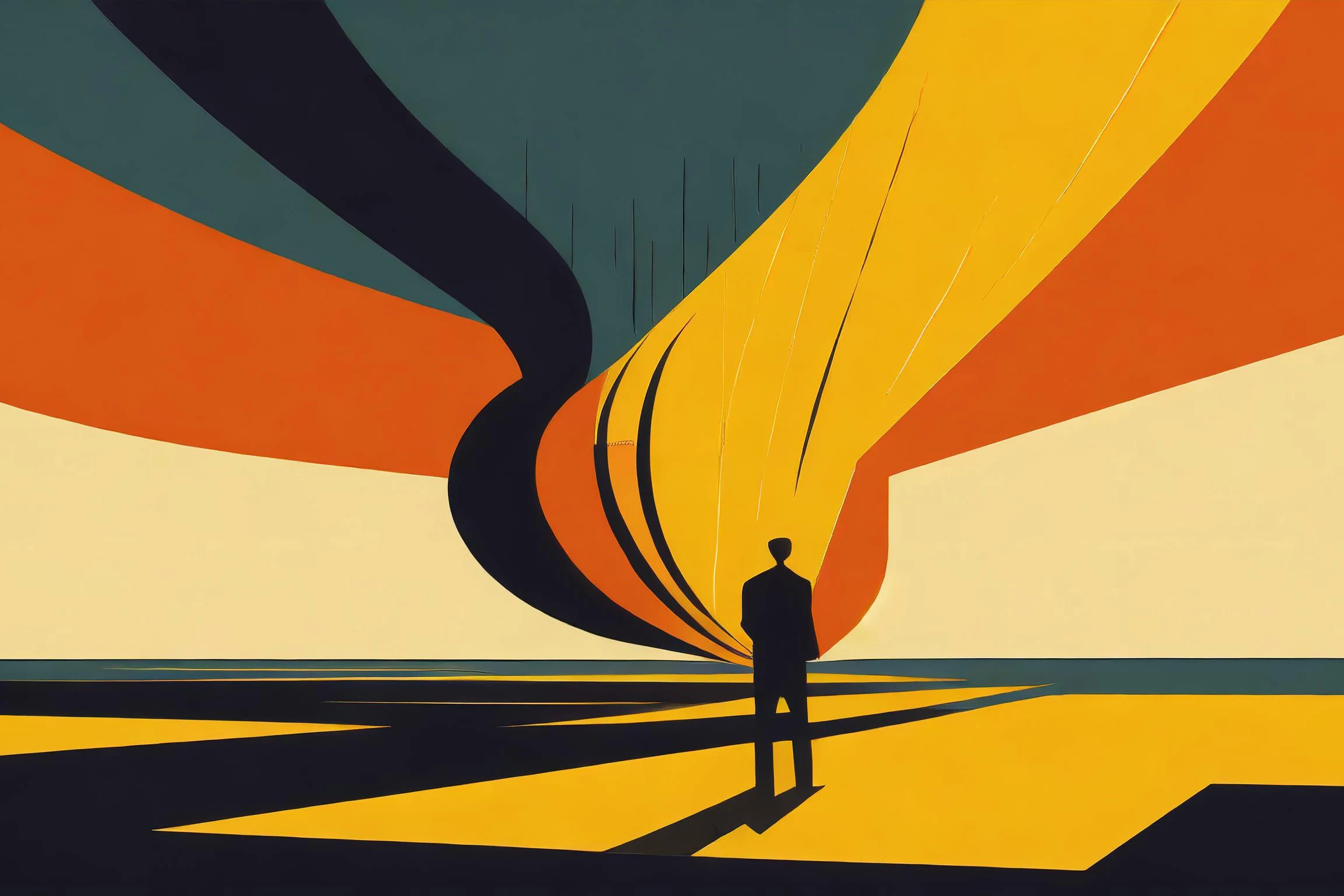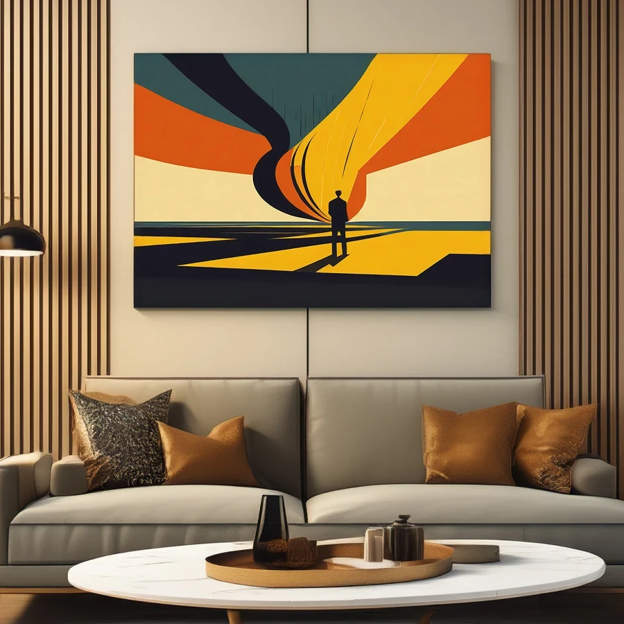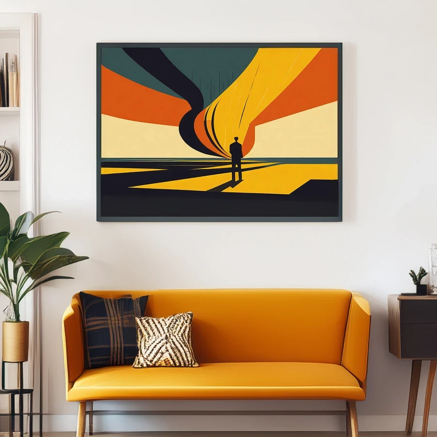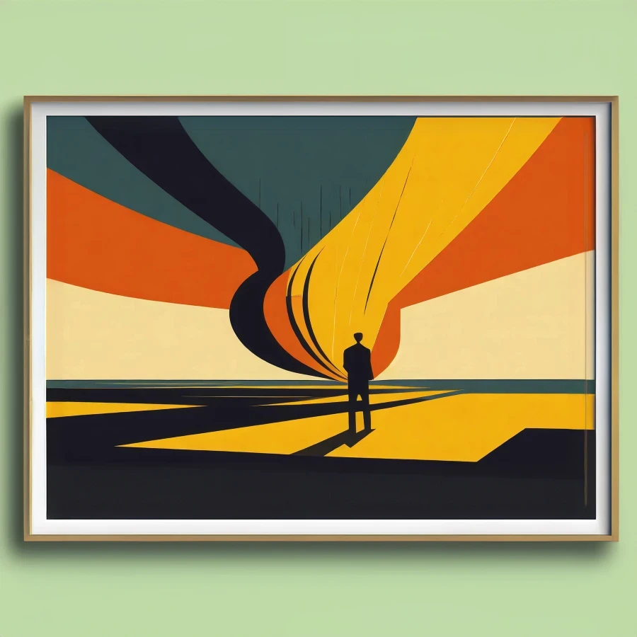 A solitary figure stands transfixed beneath a geometric tornado that spirals violently upward like an Art Deco ziggurat gone terribly wrong. The piece masterfully blends Mid-Century Modern minimalism with apocalyptic weather patterns, rendering the threatening sky in a suspiciously cheerful palette of bold oranges and yellows that would make a 1950s travel poster jealous. Look, if you're trying to make your modern office space say "I appreciate both destructive weather patterns AND vintage aesthetics," this is absolutely the statement piece you've been waiting for.