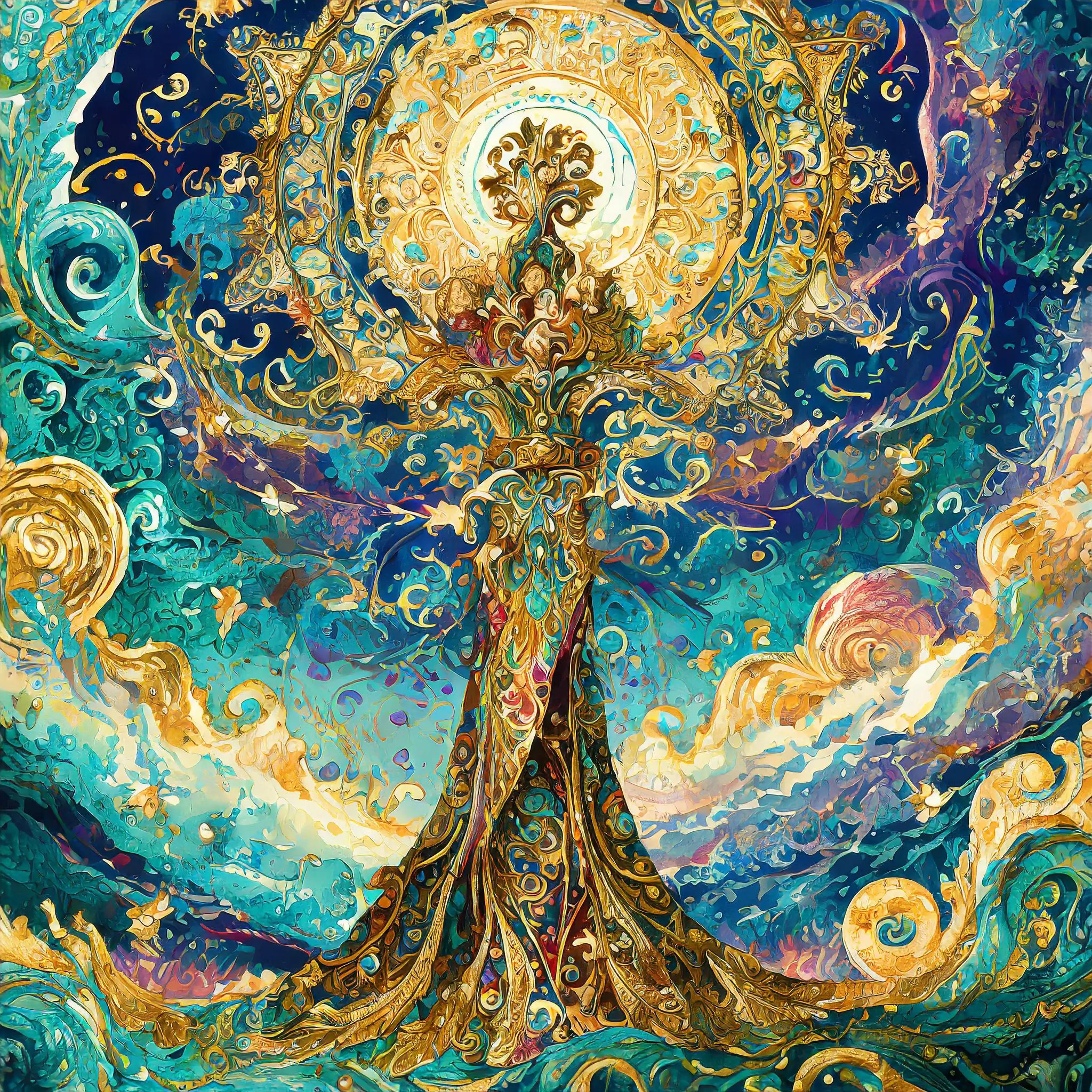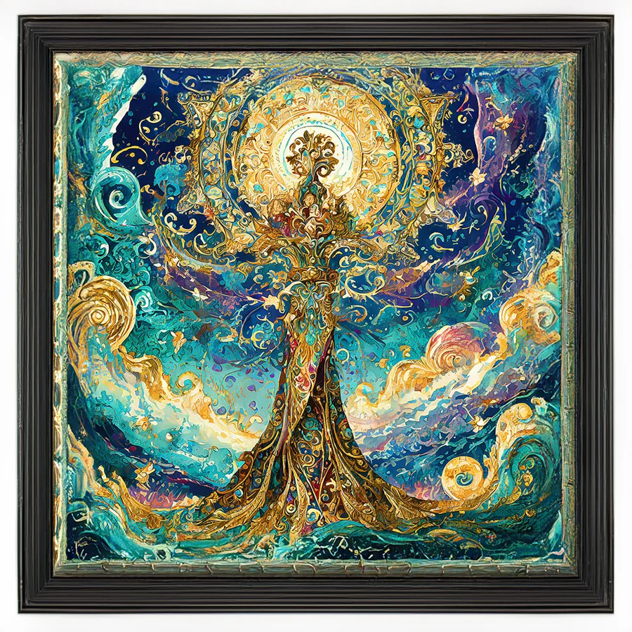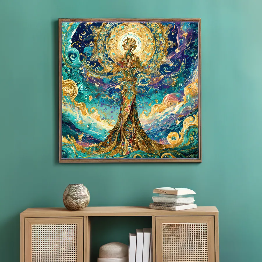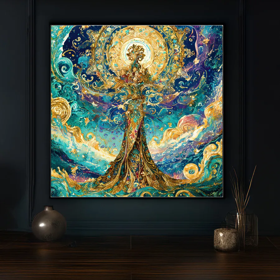 Swirling tendrils of turquoise and gold light pulse through this majestic tree's branches like mystical lightning, creating an otherworldly beacon that could probably guide lost elves home from three realms away. This digital masterpiece merges Van Gogh's signature starry swirls with sacred geometry patterns, blending pagan symbolism and fantasy art in a way that would make both Tolkien and your crystal-wielding aunt weep with joy. Listen, if you don't immediately feel the urge to start communing with forest spirits while staring at this piece, you might need to check your third eye prescription.