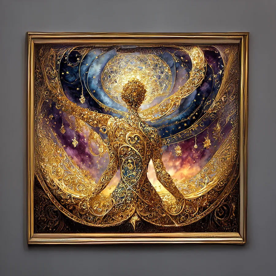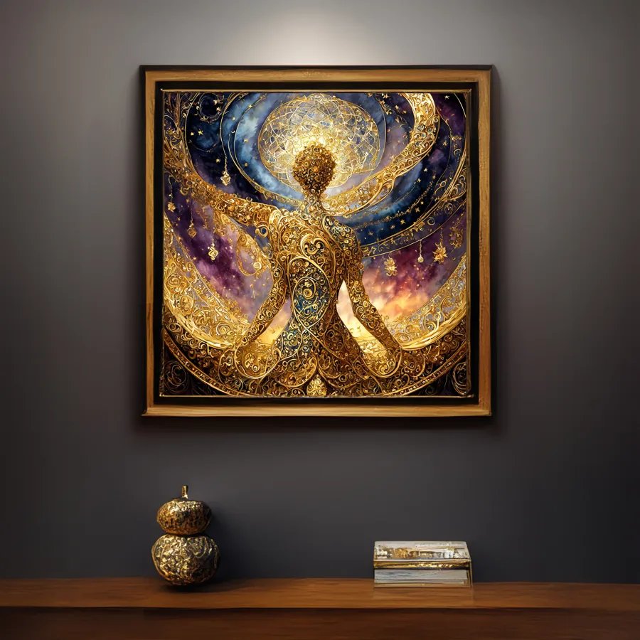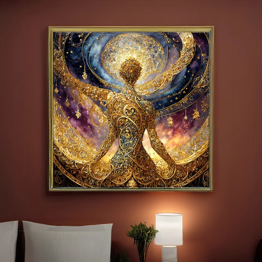 A radiant goddess emerges from swirling golden galaxies, her form materializing from intricate sacred geometry that spirals outward like a cosmic dance frozen in time. The harmonious blend of celestial patterns and divine feminine energy creates a mesmerizing mandala-like composition that manages to stay just this side of woo-woo, with metallic details that catch light like actual stardust. Listen, if you're trying to transform your meditation space from "basic zen" to "mystical goddess lair where you occasionally summon the powers of the universe," this is totally the vibe you need.