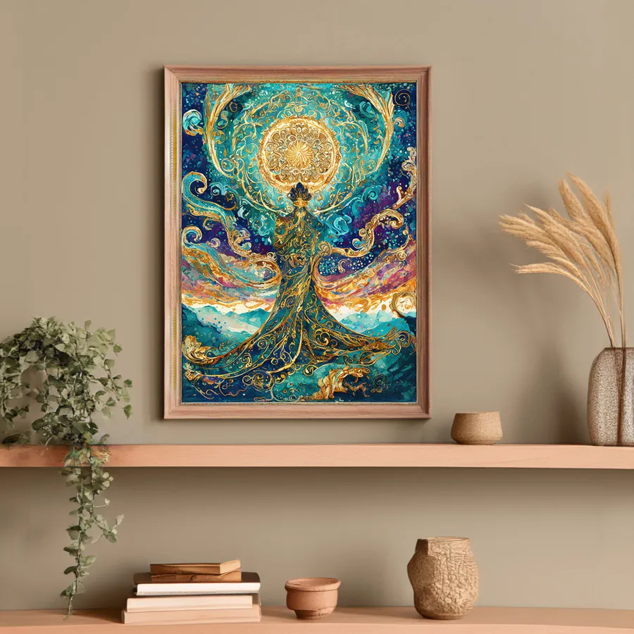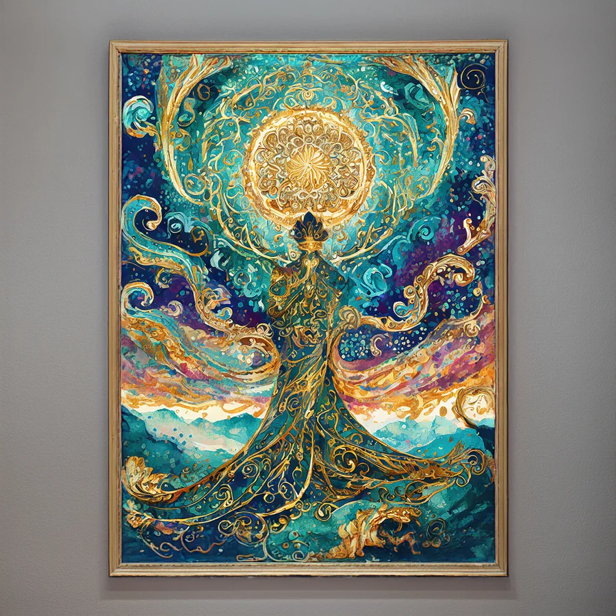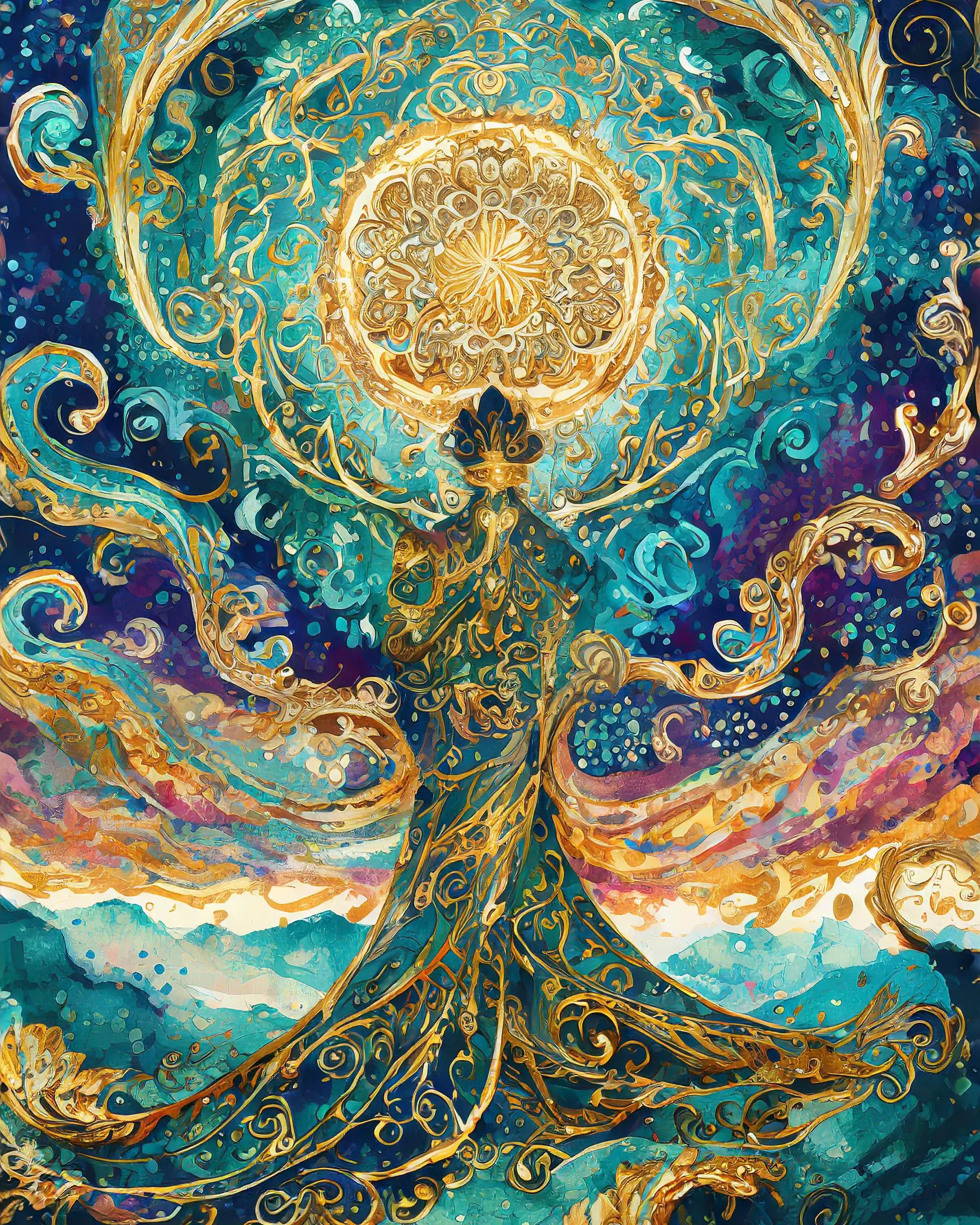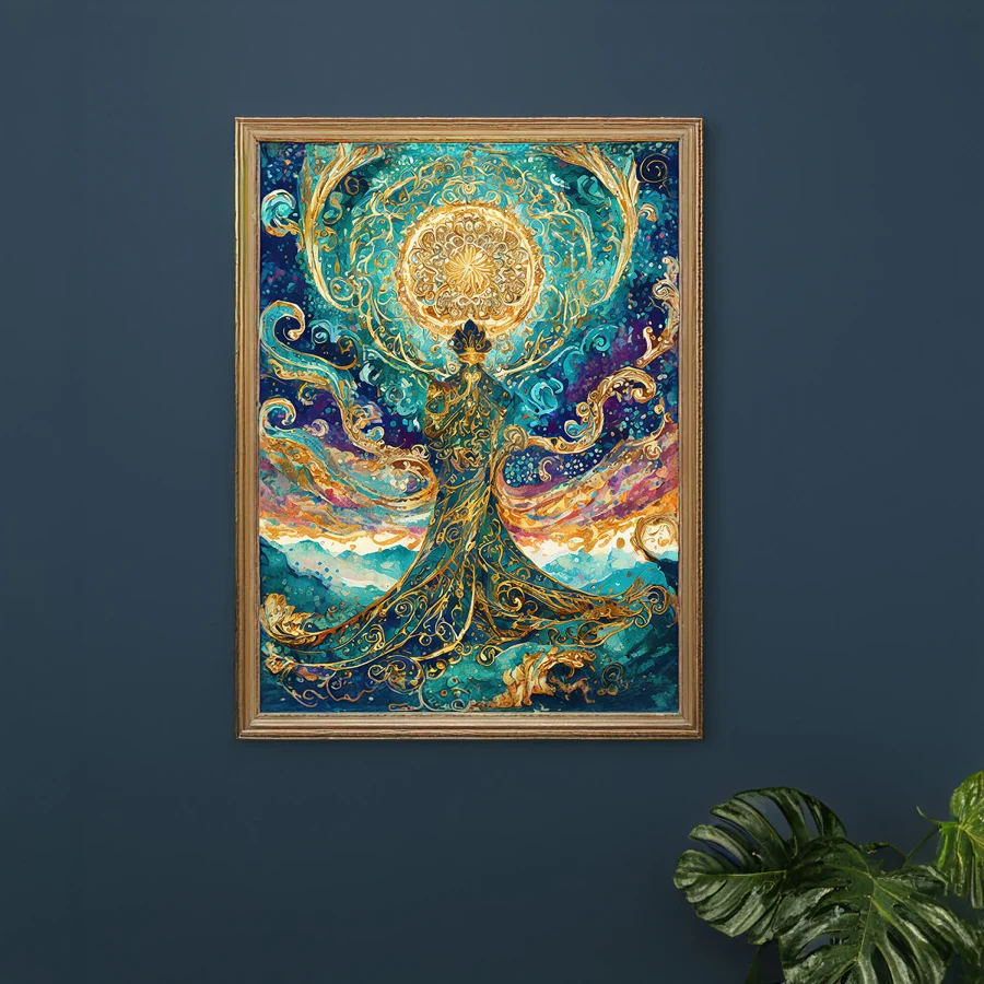 A massive ethereal tree explodes across the canvas in a mesmerizing dance of liquid gold and deep teal, its branches spiraling into infinity like some cosmic DNA strand. The piece masterfully weaves sacred geometry with organic forms, creating that perfectly trippy sweet spot between "just left a crystal shop" and "just downloaded the secrets of the universe". Listen, if you're not planning to sit cross-legged in front of this while contemplating the interconnectedness of all things at 2 AM, are you even living your best spiritual awakening life?