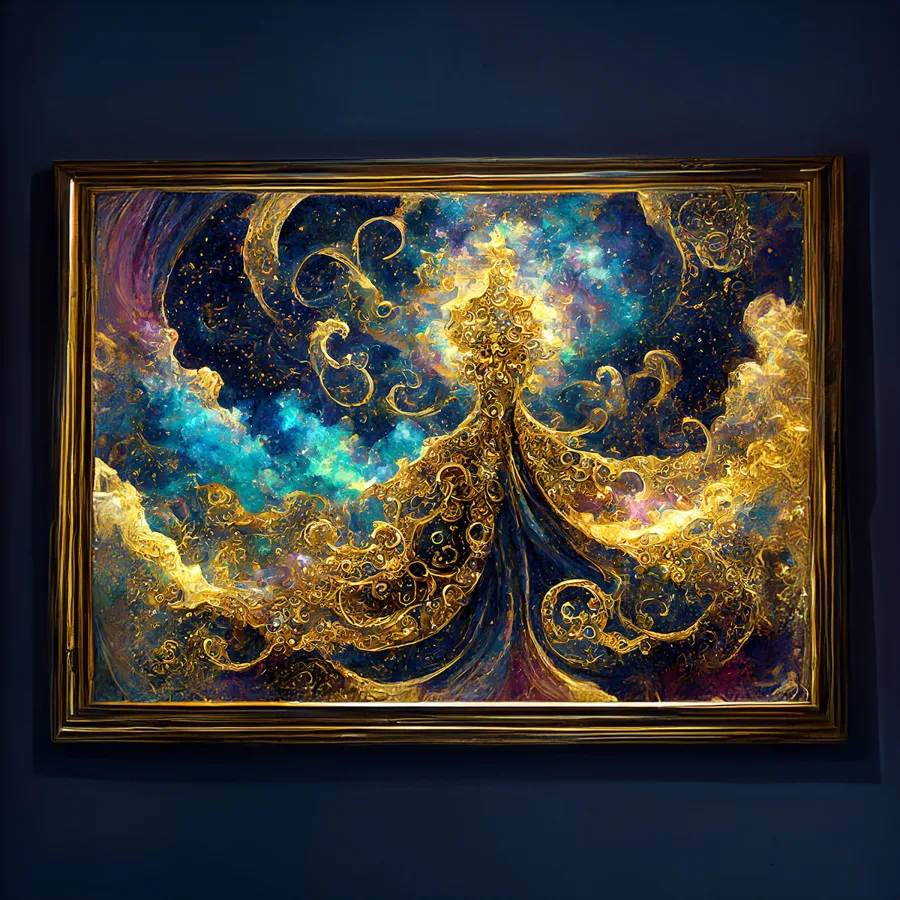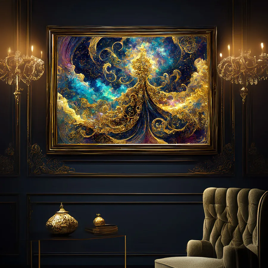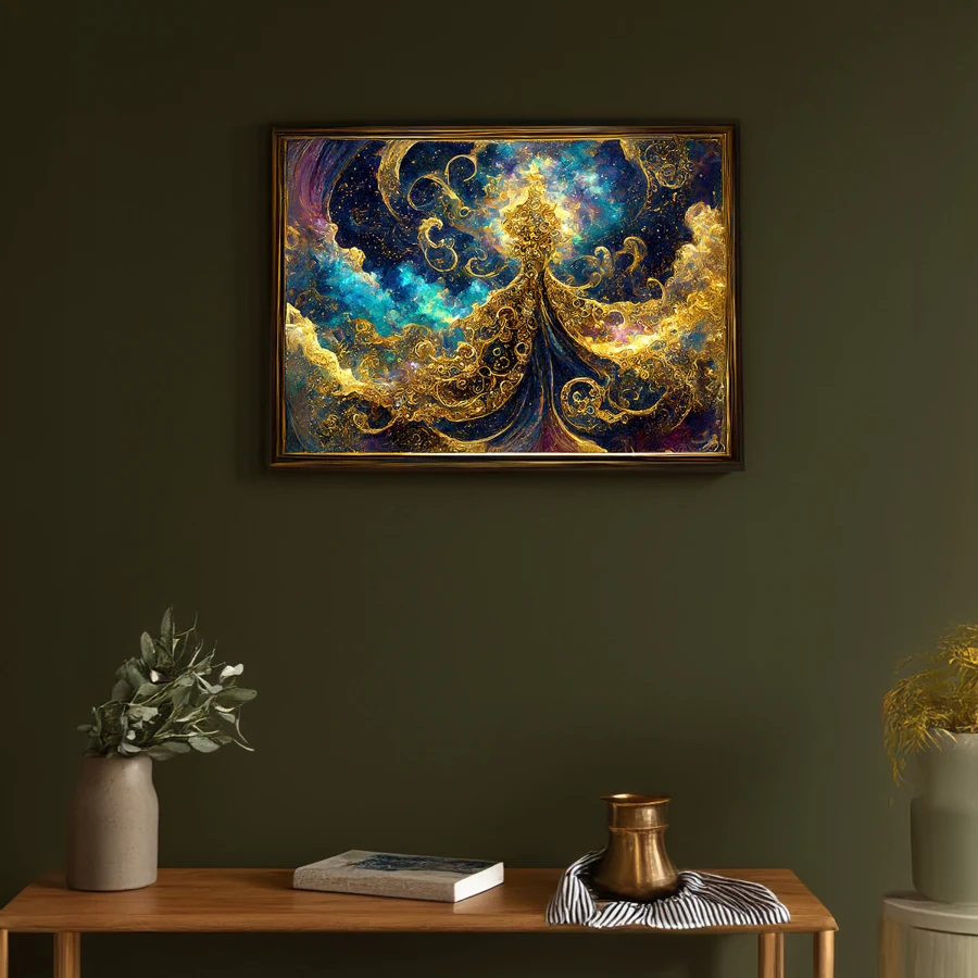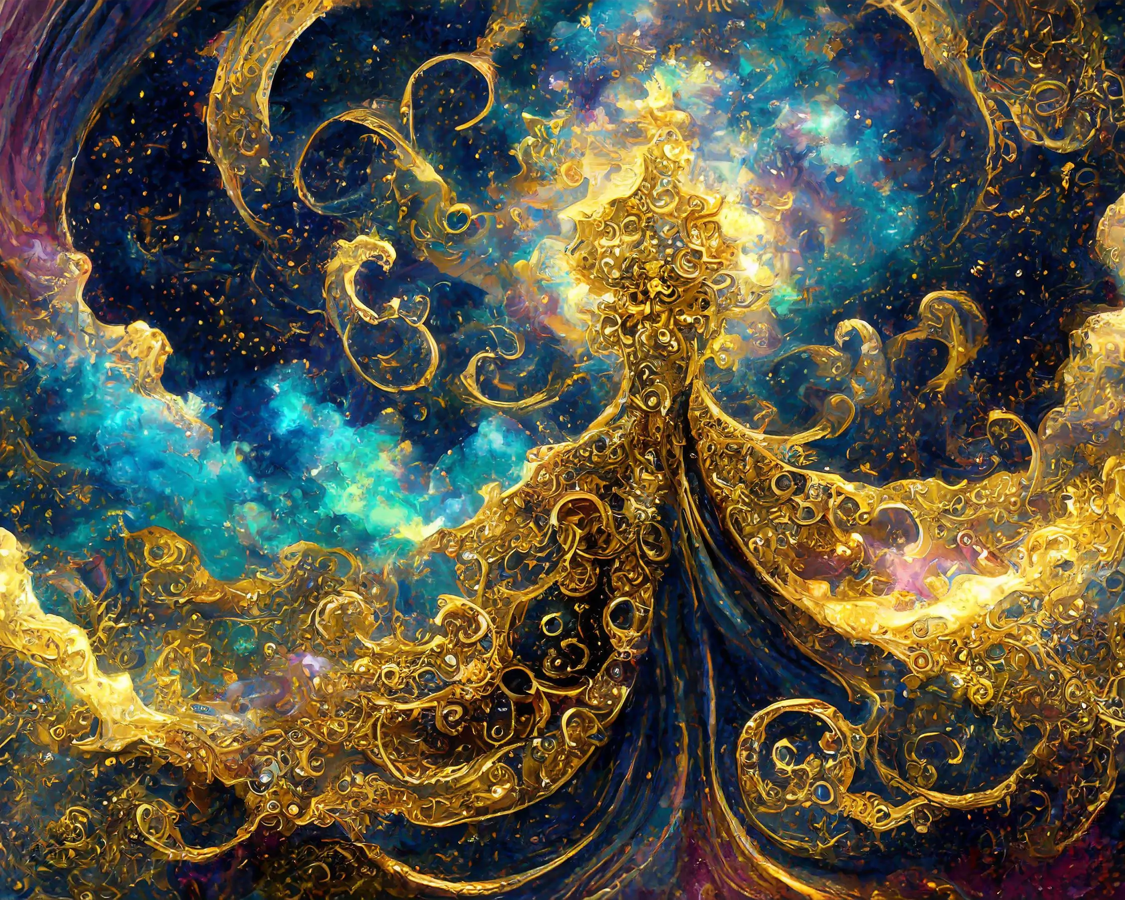 Hypnotic golden filigree dances across a cosmic canvas, weaving through turquoise nebulas like some kind of space deity's signature scrawled across the universe. The piece channels major Klimt-meets-Van-Gogh energy, with those meticulous metallic swirls adding a psychedelic twist to the classic celestial aesthetic. Listen, if you're not planning to stare at this while questioning your existence at 3 AM in your meditation room, you're honestly doing it wrong.
