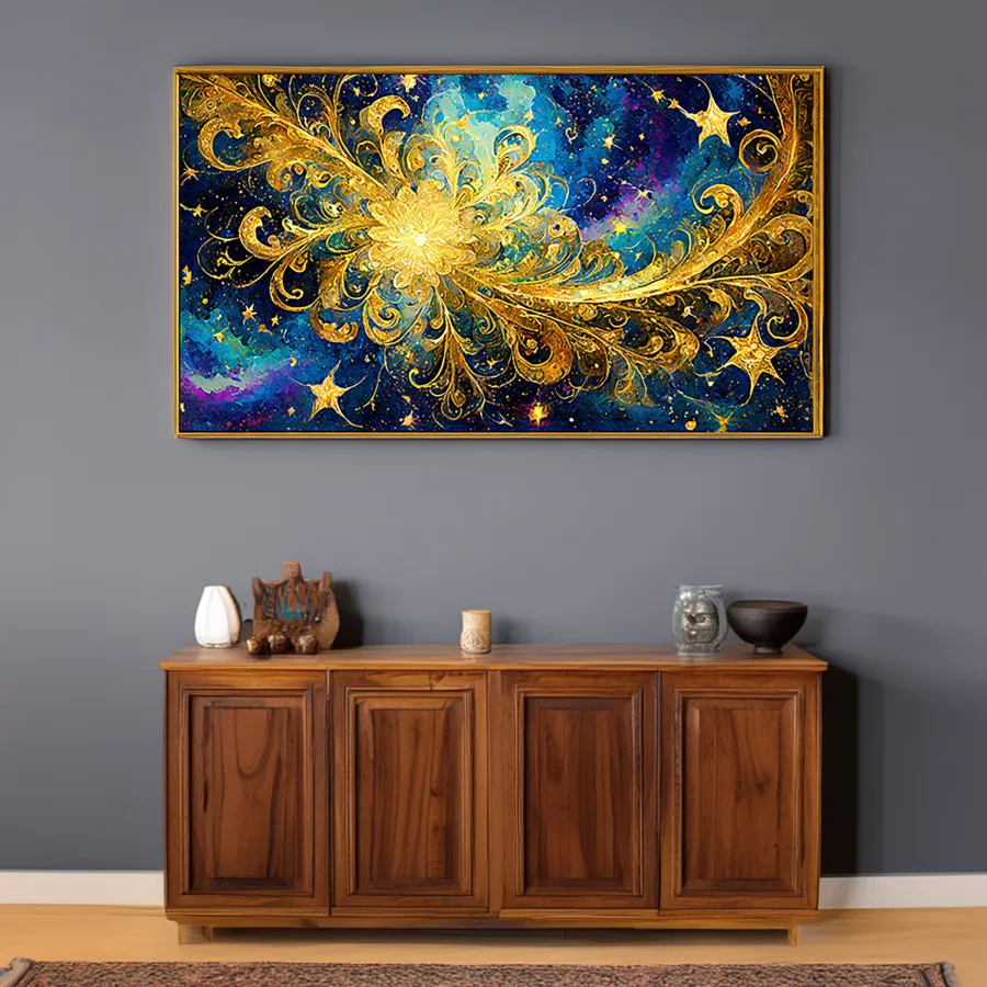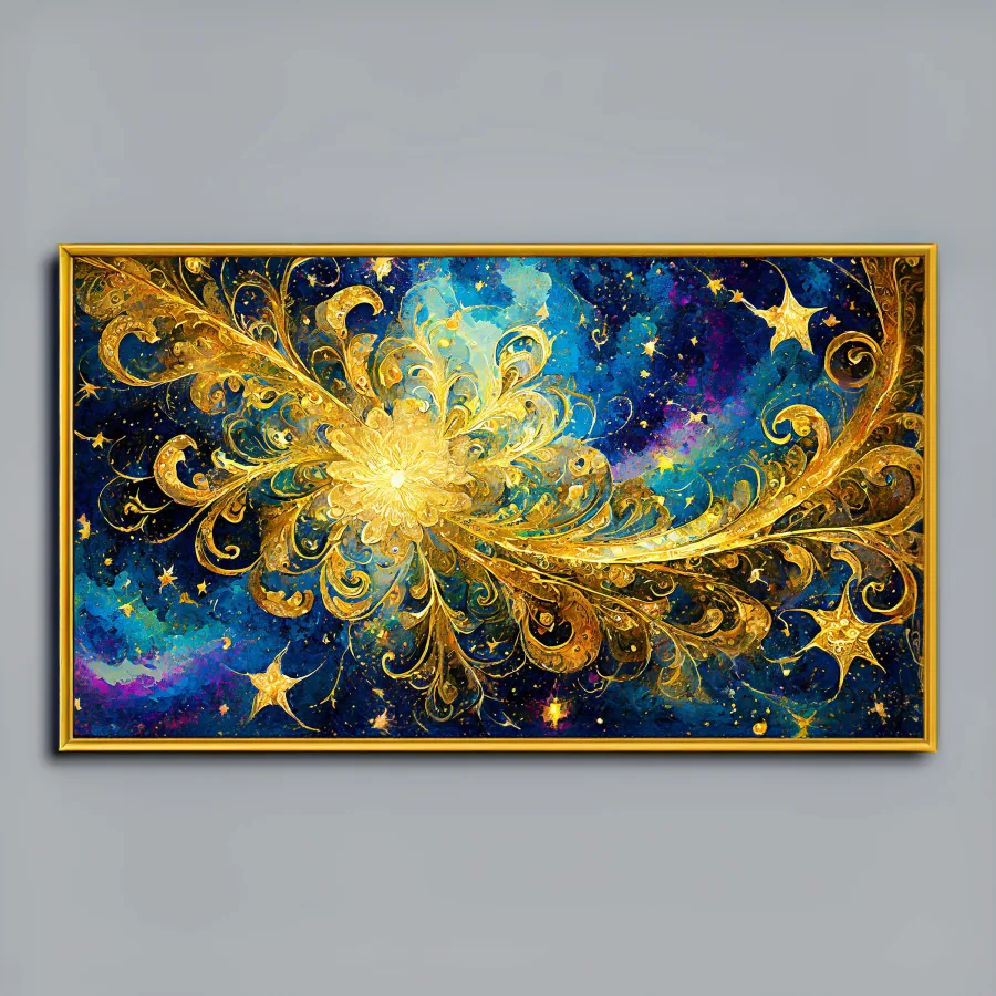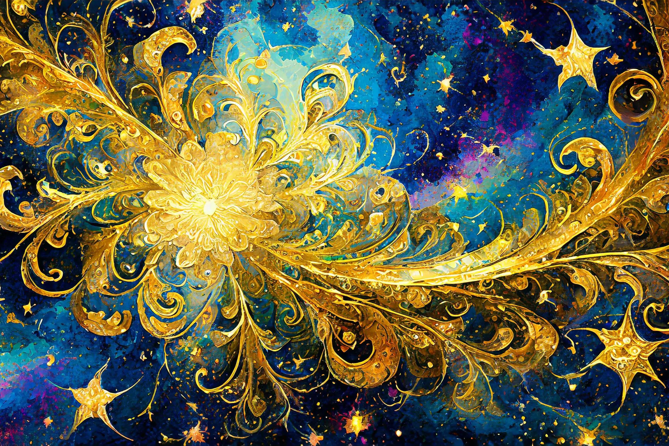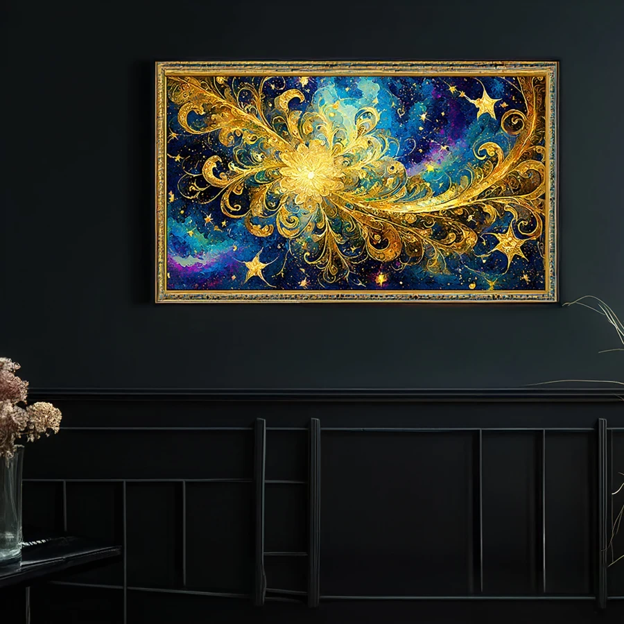 Swirling golden tendrils dance across a midnight canvas like cosmic DNA having an existential crisis at 3 AM, creating hypnotic patterns that refuse to let your eyes rest. This luxurious fusion of Van Gogh's trademark turbulence and digital fractal precision delivers a spiritual punch wrapped in celestial blue and metallic opulence. Look, if you're not immediately planning to project this onto every surface of your meditation room while manifesting your next spiritual awakening, you're honestly doing it wrong.