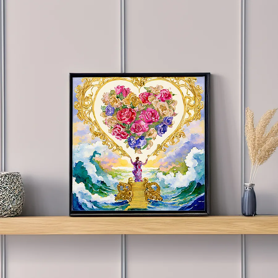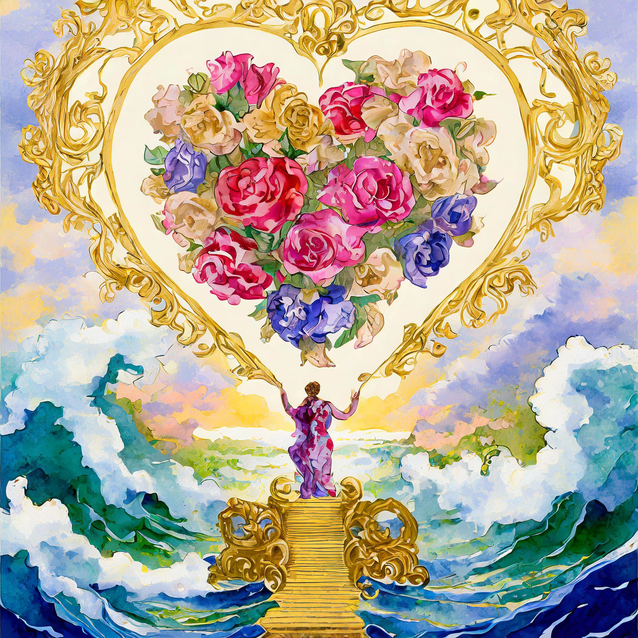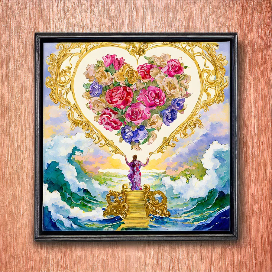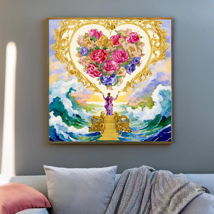 Delicate golden hearts float through a misty rose-tinted dreamscape, adorned with sweeping baroque flourishes and tumbling vintage flowers that seem to dance right off the page. This ethereal watercolor masterpiece marries the dreamy whimsy of cottagecore with the elaborate excess of rococo, creating a romantic fantasy where Renaissance cherubs would feel right at home. Listen, if you're not immediately plotting to wallpaper your entire bedroom with this magical piece while dramatically swooning onto a fainting couch, we clearly have very different definitions of what constitutes good taste.