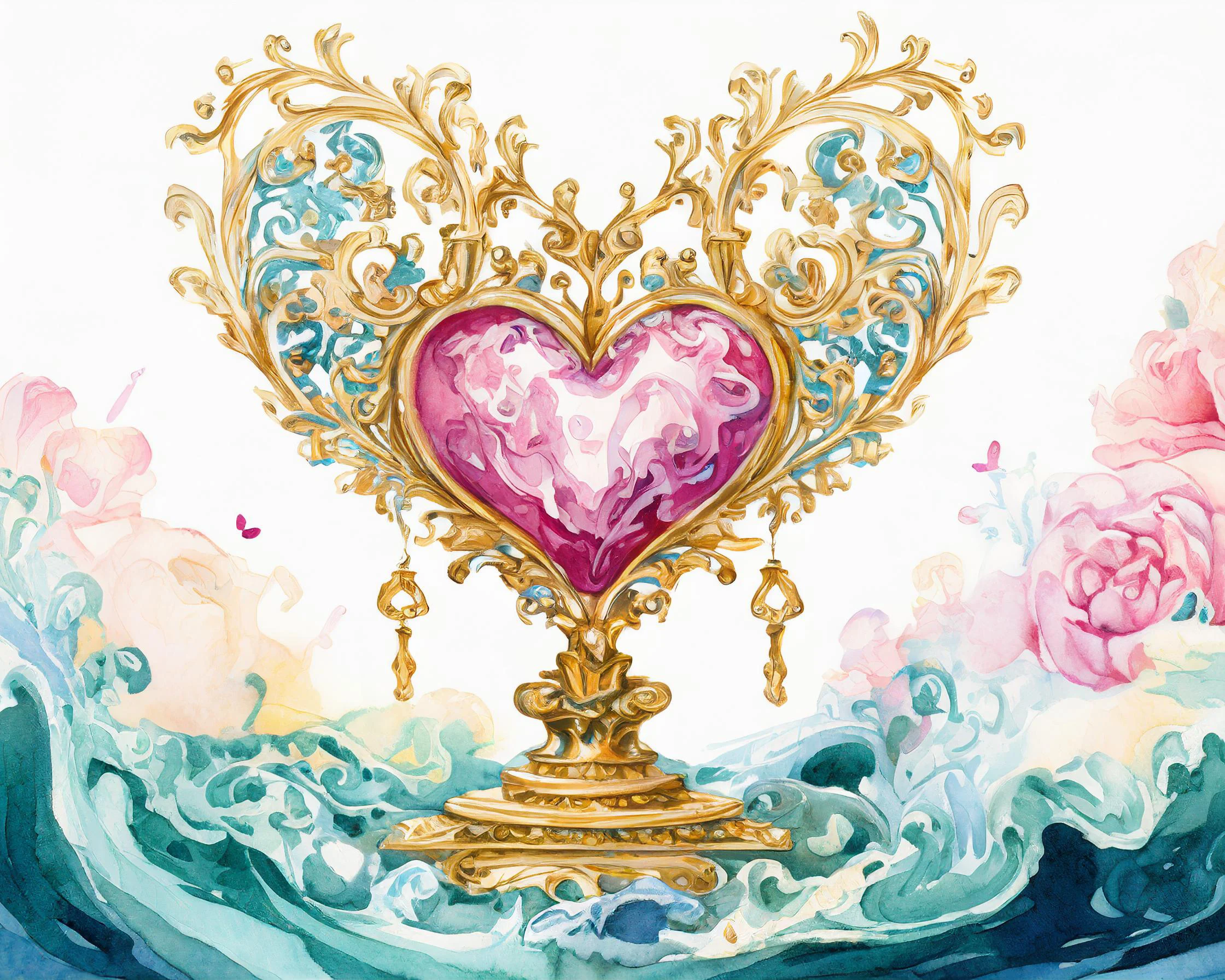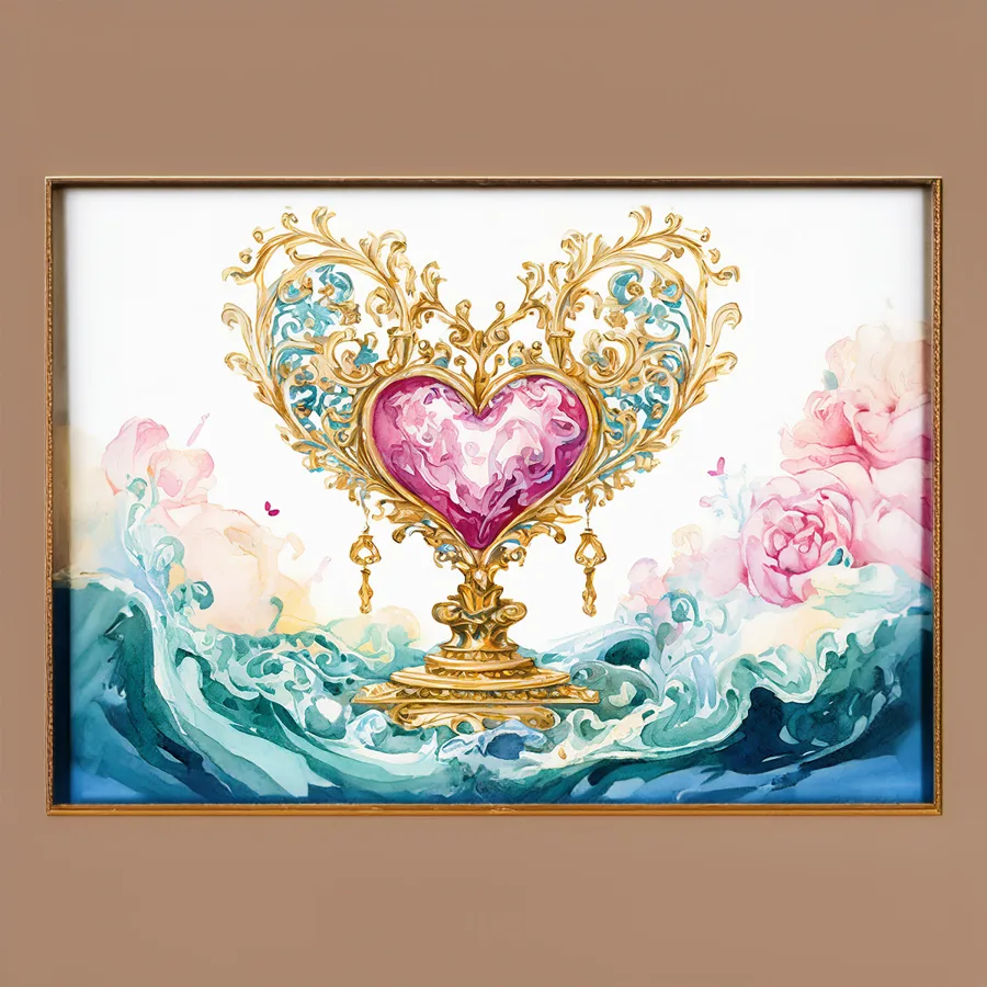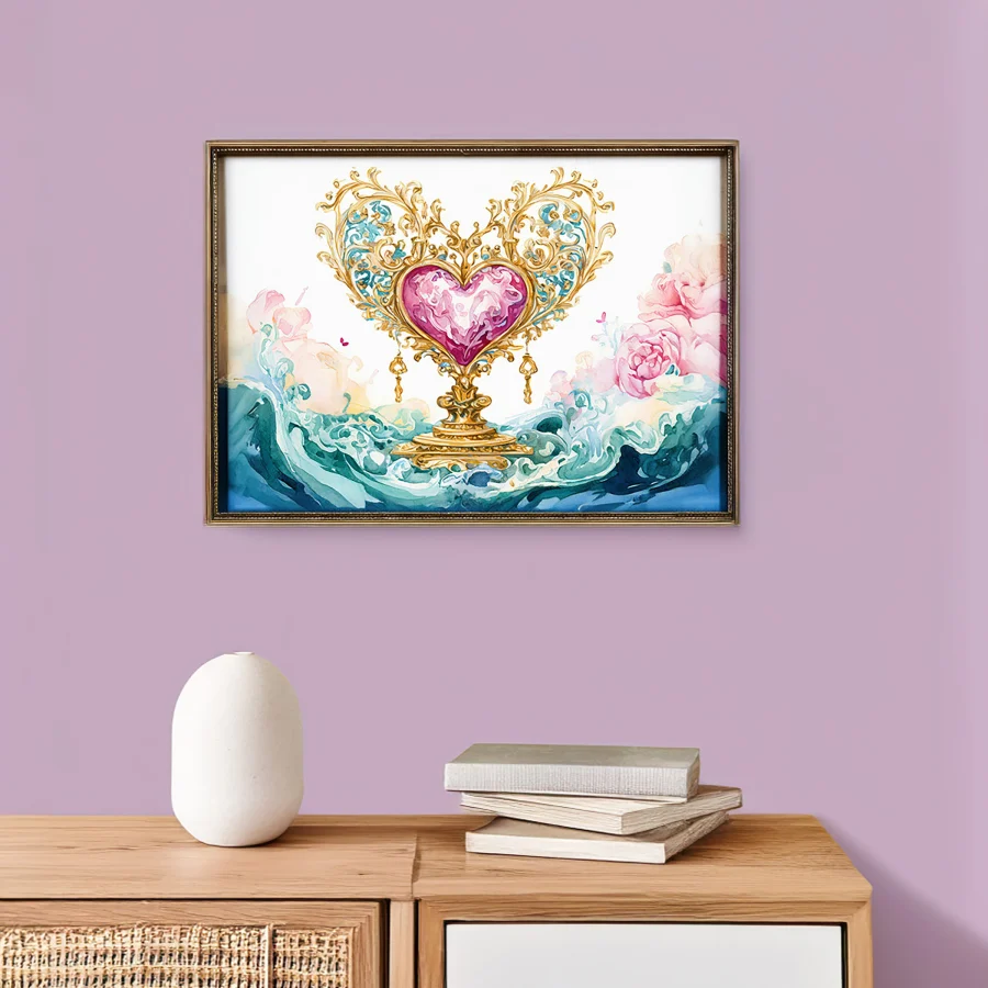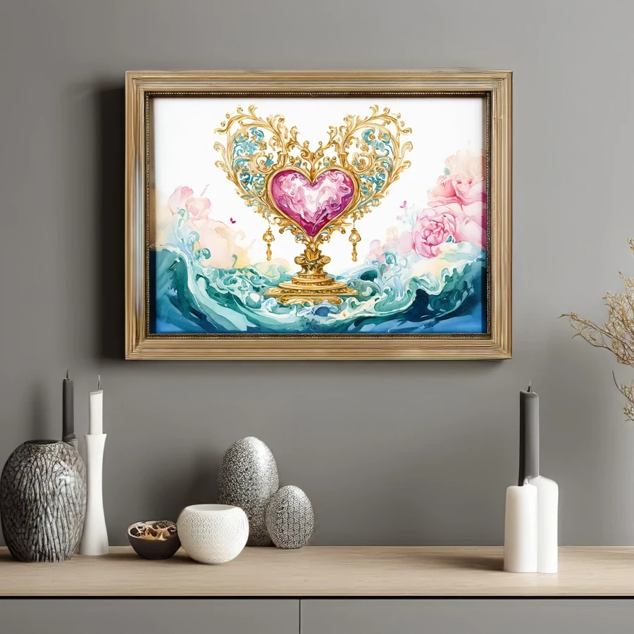 A shimmering golden heart frame erupts with baroque swirls and flourishes, practically dripping with the kind of over-the-top romance you'd find in a princess's diary. The dreamy fusion of pastel pink roses and turquoise ocean waves creates this absolutely ethereal vibe that's somehow serving both cottagecore tea party and royal palace ballroom at the same time. Look, if your bedroom doesn't have this level of magical-girl-meets-Marie-Antoinette energy, are you even trying to live your best fairytale life?