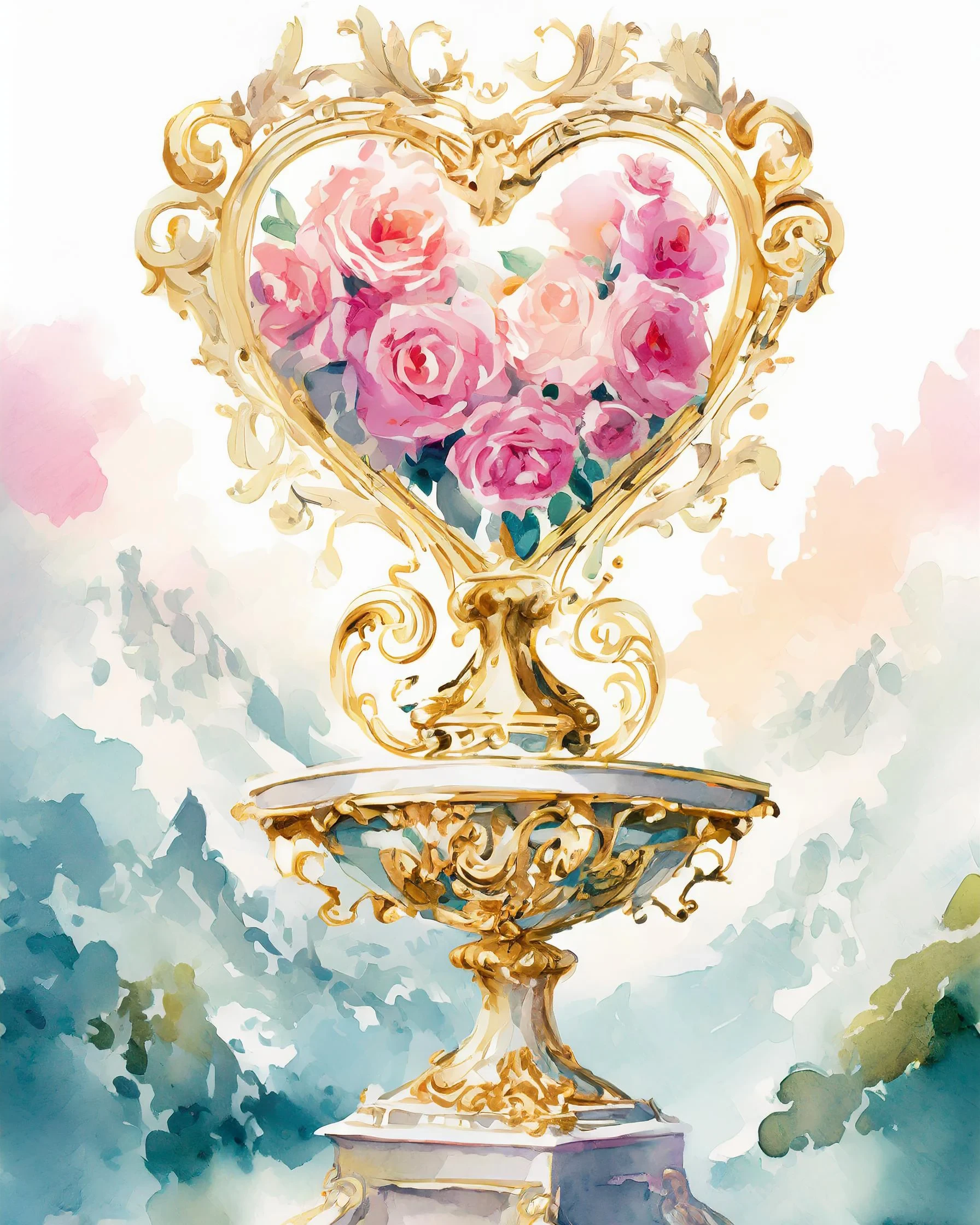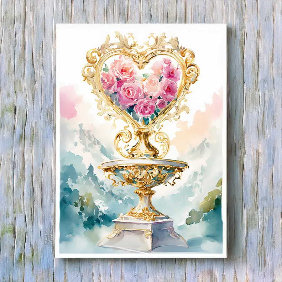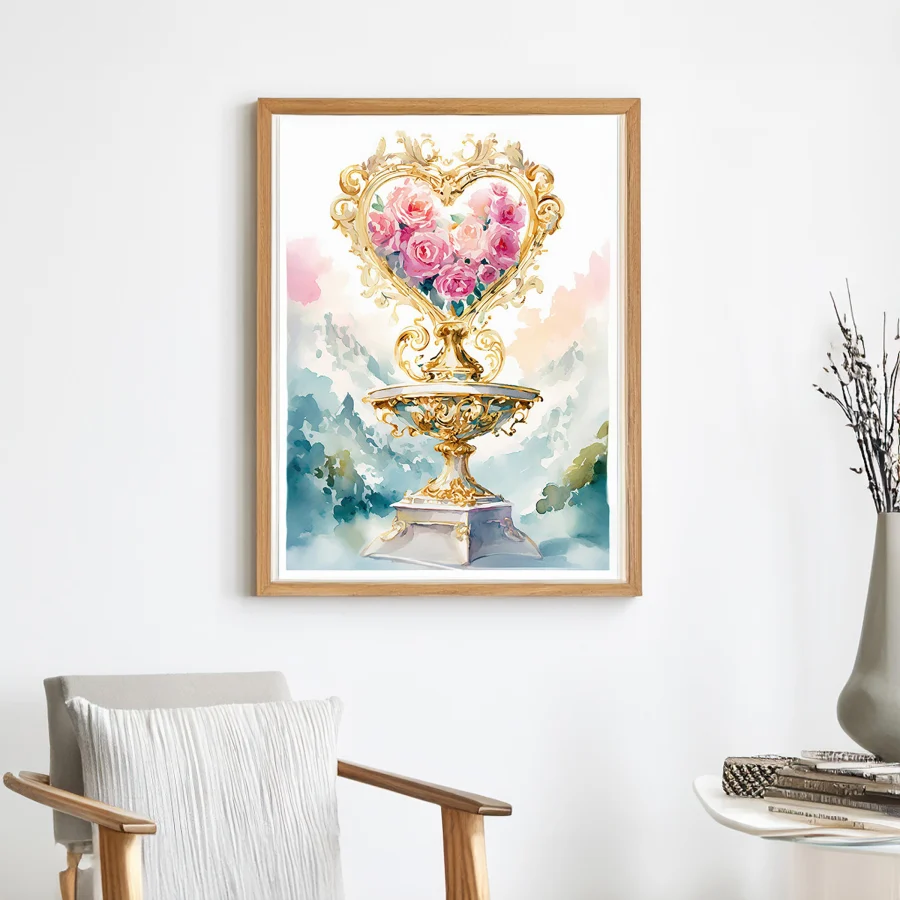 Delicate pink roses drift like cotton candy clouds within an ornate gold baroque frame that's basically dripping with "let them eat cake" energy. The dreamy watercolor technique creates an ethereal, vintage-inspired aesthetic that would make even Lady Whistledown swoon, blending Bridgerton romance with Marie Antoinette's lavish taste. Let's be honest - if your bedroom walls aren't screaming "I secretly believe I'm a fairy tale princess who deserves tea served in golden cups," are you even living your best cottagecore life?