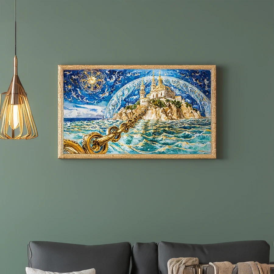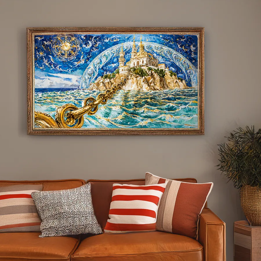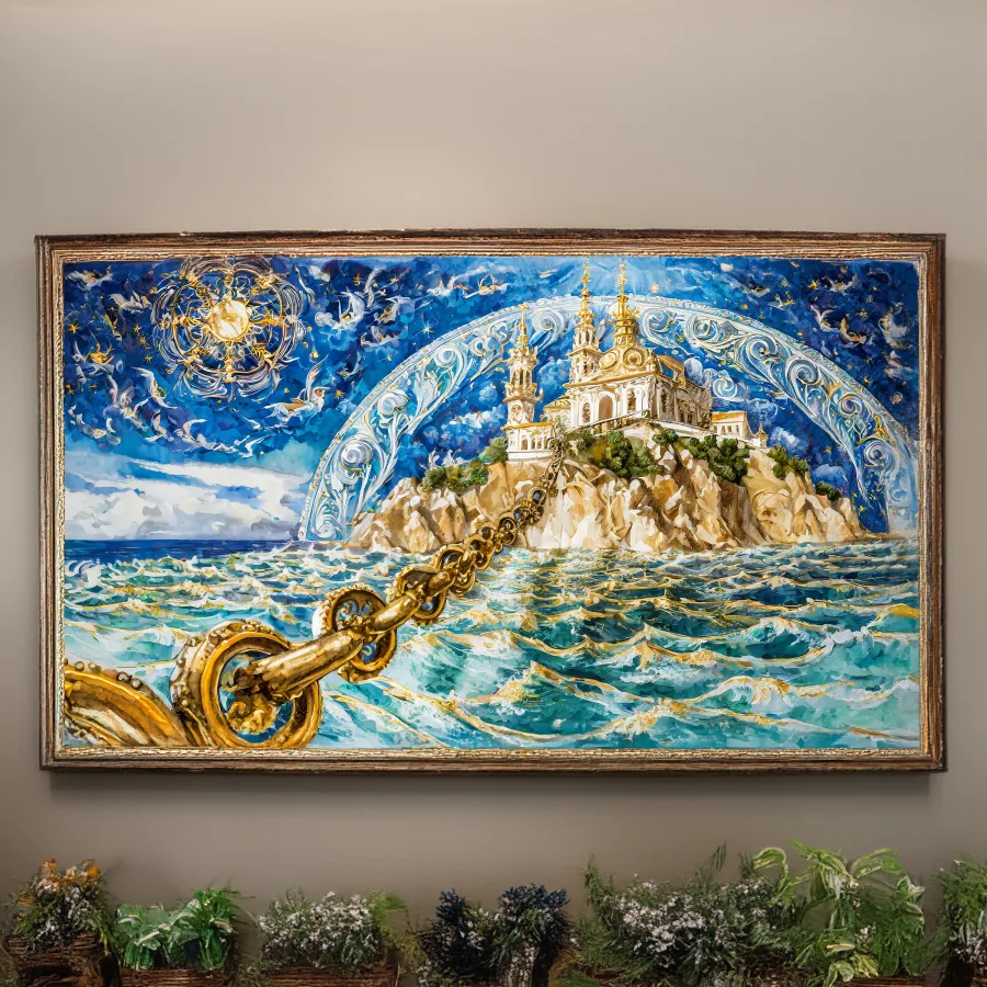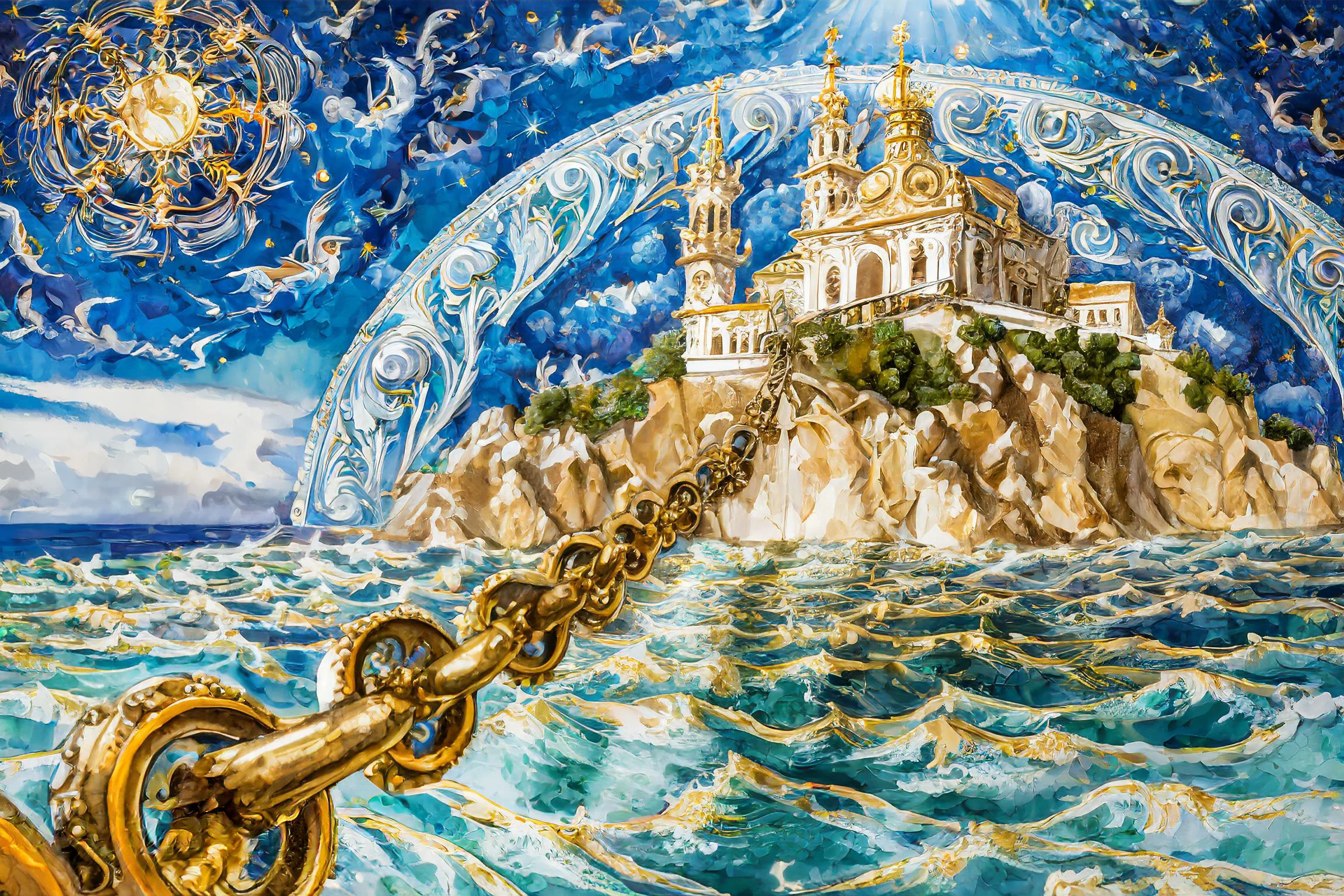 A gleaming white cathedral perches impossibly on a windswept cliff, its spires piercing through swirling cosmic clouds while golden chains anchor it to the stormy sea below. The whole scene vibrates with a fever-dream fusion of Van Gogh's turbulent brushstrokes and Disney's most audacious architectural fantasies, creating a baroque wonderland where physics clearly took the day off. Listen, if your bedroom doesn't have at least one piece of art featuring an angel-guarded castle floating through a celestial storm, are you even trying to live your best fairytale life?