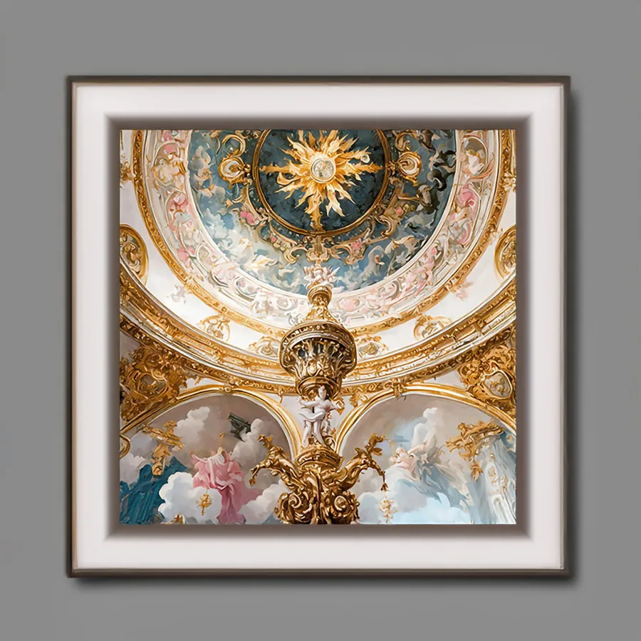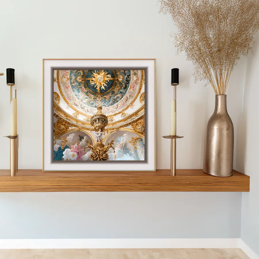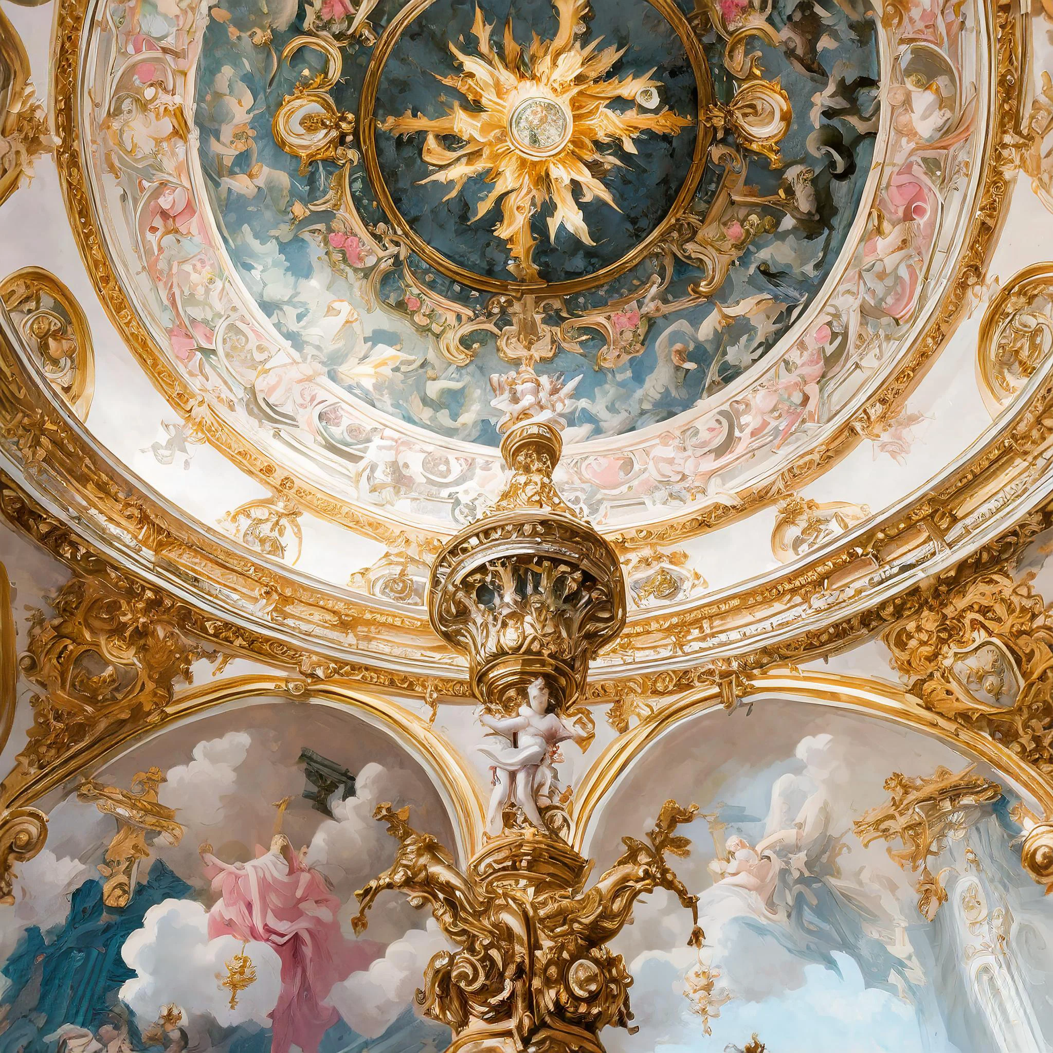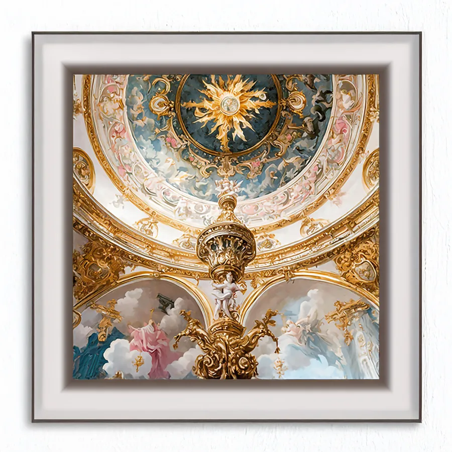 A blazing golden sunburst explodes across the ceiling, surrounded by an entire airborne kindergarten's worth of chubby cherubs diving through cotton-candy clouds. The masterful Baroque composition practically drips with over-the-top luxury, featuring more gold leaf than a billionaire's bathroom and enough trompe l'oeil to make reality question itself. If you're not lying flat on your back taking this in while pretending to be Marie Antoinette living her best pre-revolution life, you're honestly doing it wrong.