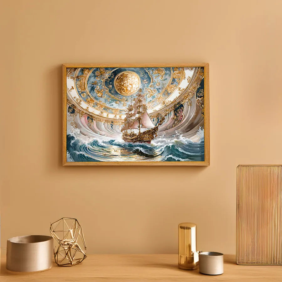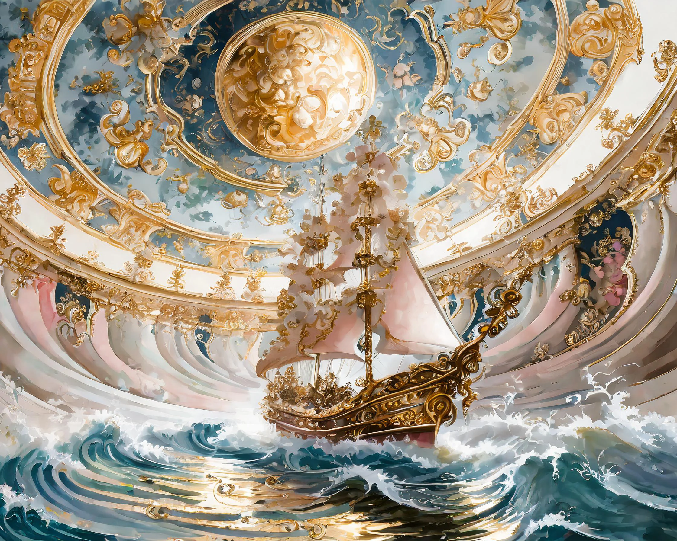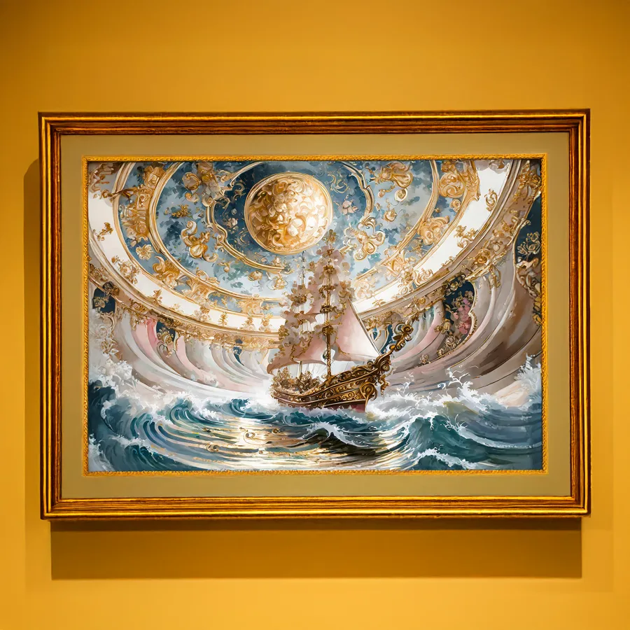 A magnificent crystal chandelier shaped like a fully-rigged sailing ship crashes through tumultuous gilt-edged waves painted across the domed ceiling. The baroque masterpiece seamlessly blends rococo excess with maritime fantasy, creating a fever dream of stormy seas rendered in gold leaf and ornate plasterwork. Listen, if you're not already planning to lie on that marble floor at 2am contemplating your life choices while this nautical fever dream looms above you, we clearly have different priorities.