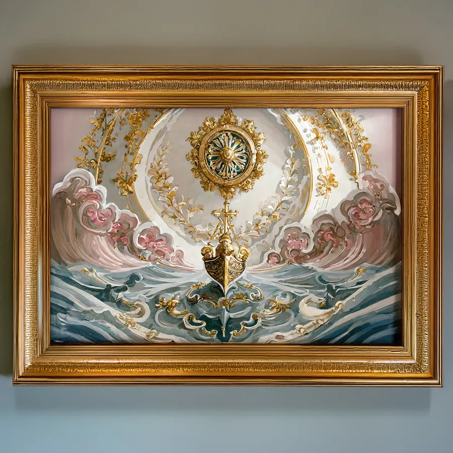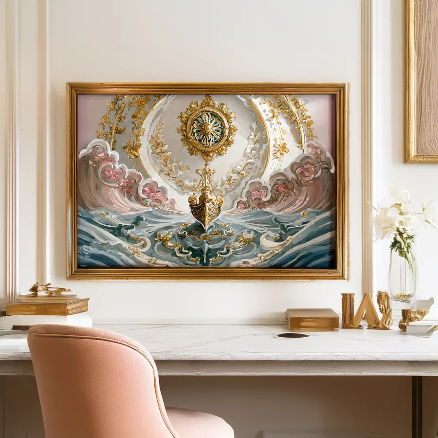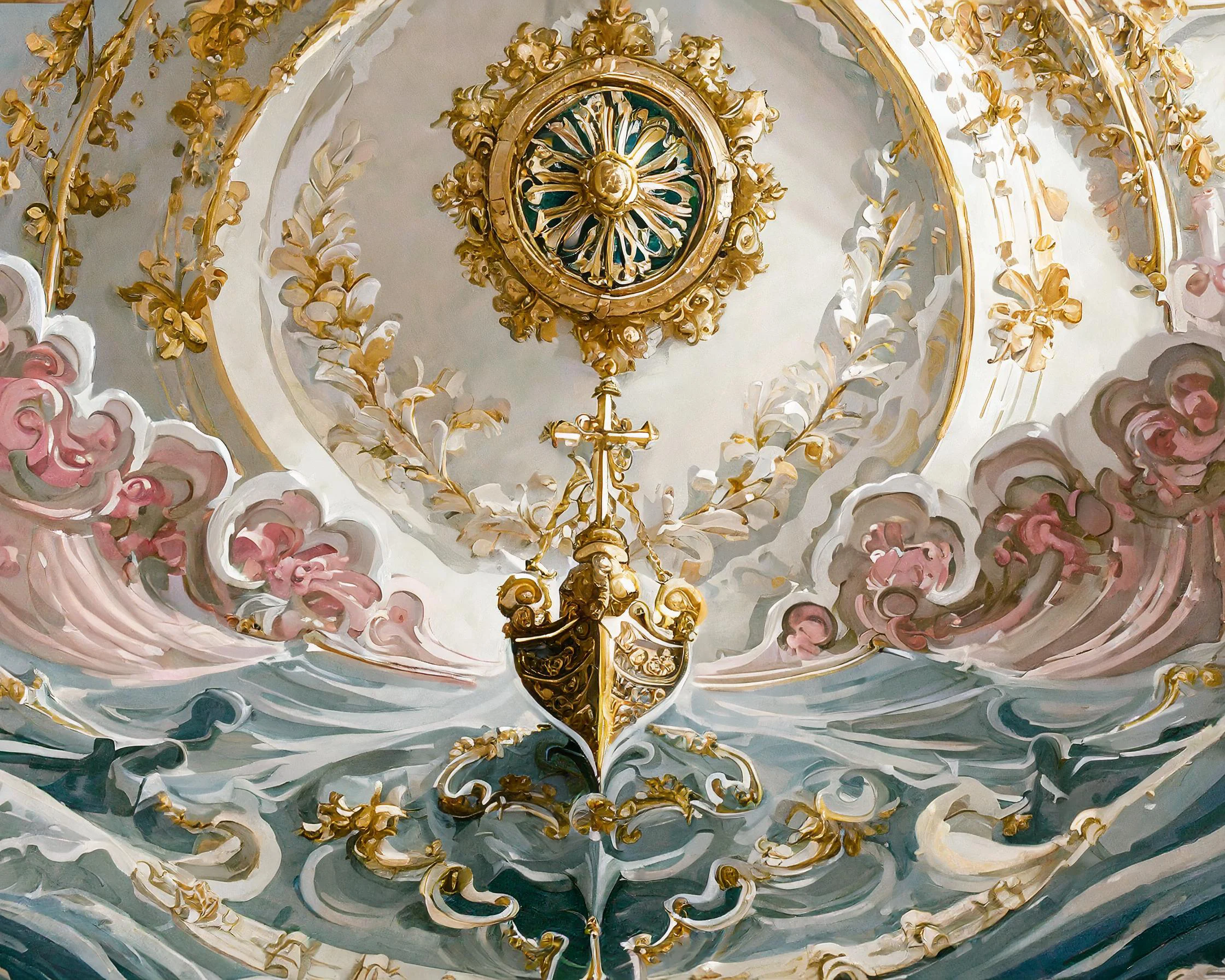 The dizzying swirl of impossibly ornate gold filigree and plump cherubs practically explodes off this baroque ceiling, making you question if someone spiked your morning coffee with LSD. These dramatic pink and gold rococo details are peak extra™, channeling pure Versailles energy with enough gilded excess to make Marie Antoinette slow clap in approval. Look, if you're not immediately plotting to recreate this level of unhinged luxury in your own bedroom ceiling while questioning all your life choices, we probably can't be friends.